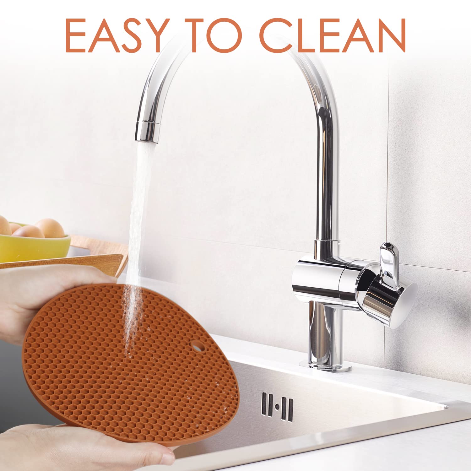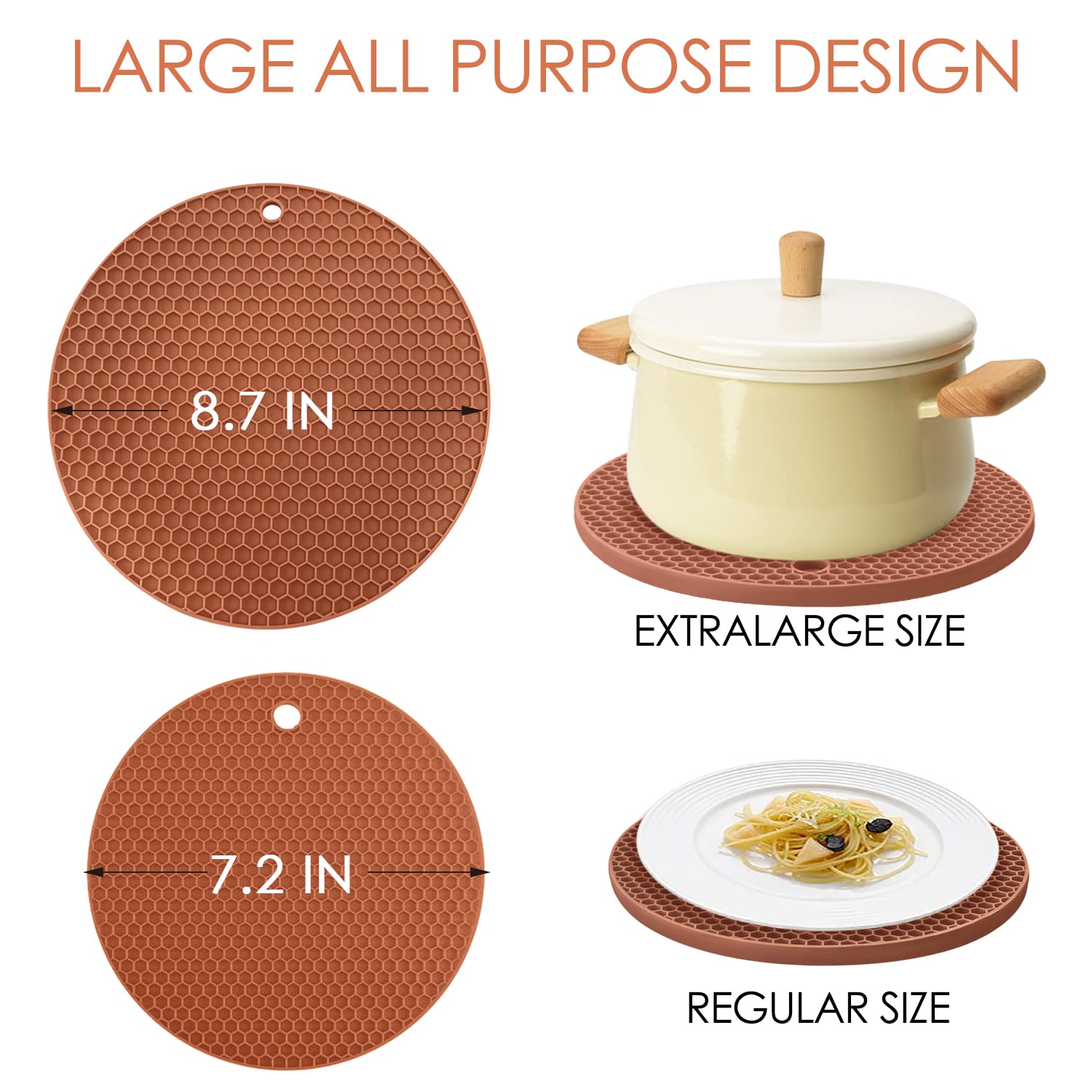 🎯 EASY TO CLEAN & 2 SIZES- Silicone mats for the kitchen counter are easy to clean with water or in a dishwasher, cleaning with a brush if needed. Waterproof and naturally non-stick, regular silicone trivet size is 6.9" x 6.9", extra-large trivet size is 8.7" x 8.7", suitable for most bowls and plates.