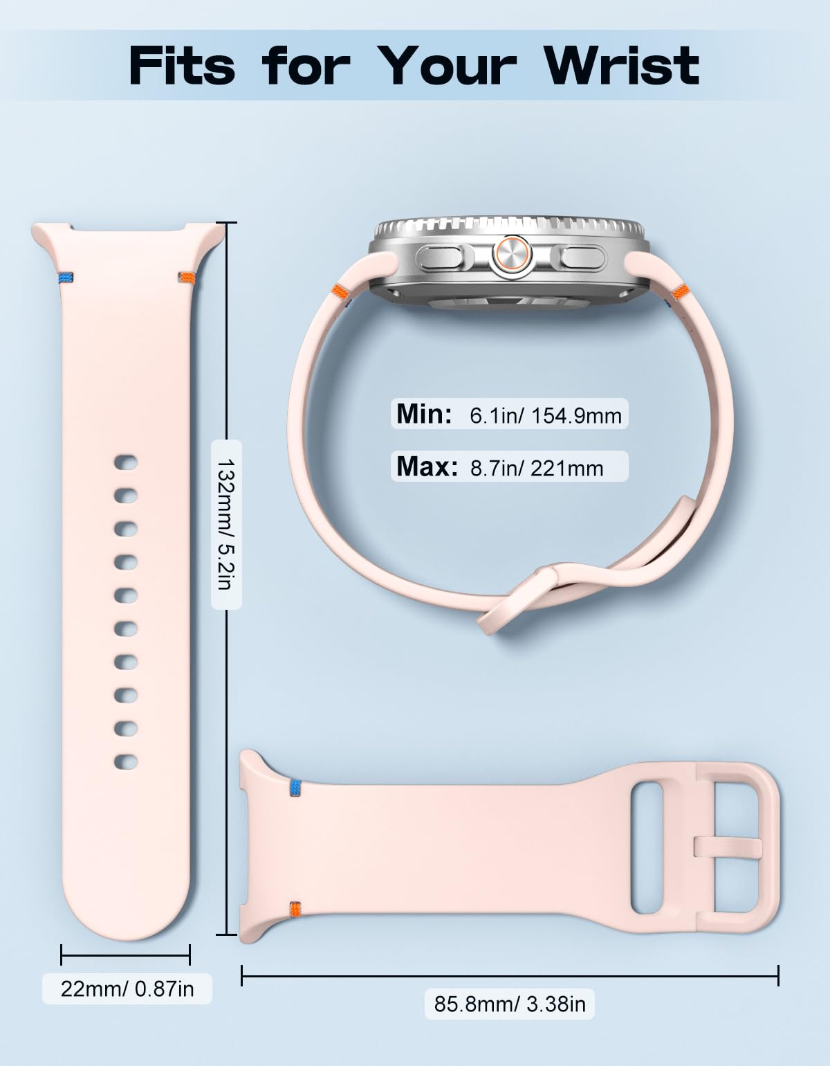 Wrist Size: The Galaxy Watch 8 40mm band is available in a variety of colors to match different outfits and moods. Suitable for women and men. It is adjustable, S/M fits 5.3" - 7.5" (134.6 mm - 190.5 mm) wrists and M/L fits 6.1" - 8.7" (154.9 mm - 221 mm) wrists. The metal buckle holds the watch securely in place, and you can also tuck the band underneath.