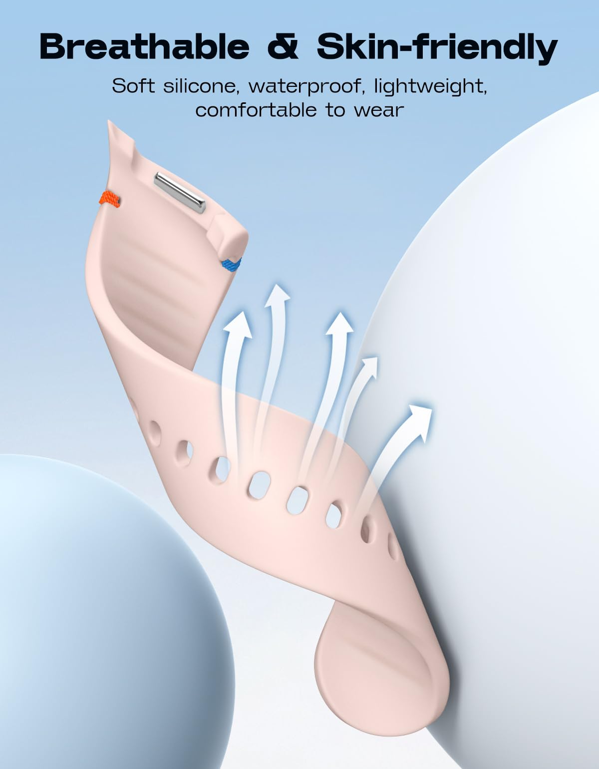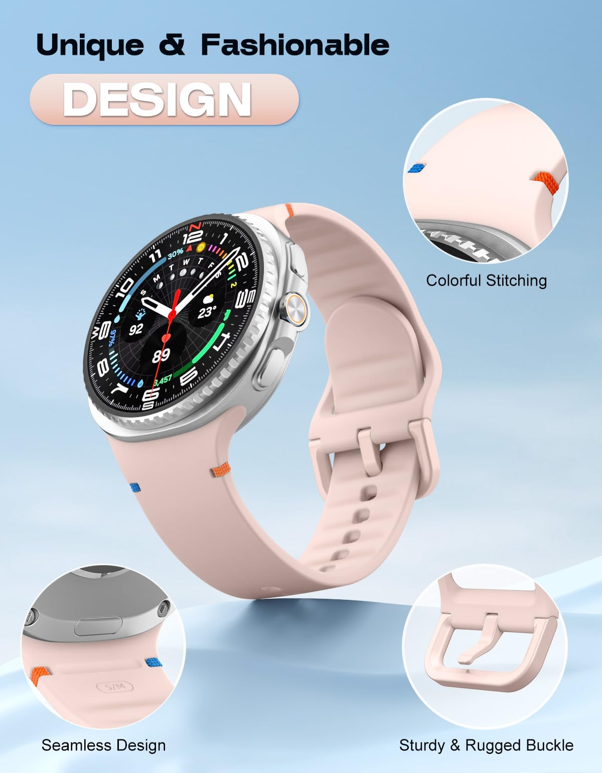 Seamless Design: The Galaxy Watch 8 band is accented with colorful stitching, adding a touch of elegance to your wrist, and the rippled design inside the band allows for easy drainage and quick drying of sweat. It has a lugless design that blends seamlessly into the body of the watch, ensuring a sleek look and comfortable fit, especially during intense exercise.