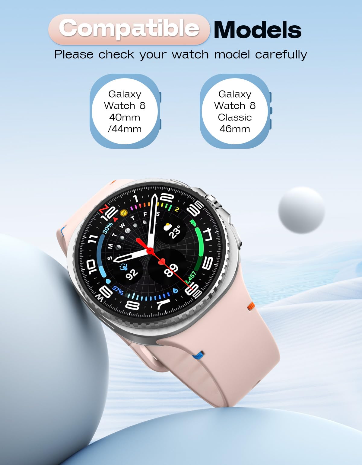Compatible Models: This soft silicone band is only compatible with Samsung Galaxy Watch 8 band 40mm/44mm and Galaxy Watch 8 Classic band 46mm. Note: Smartwatches are not included.