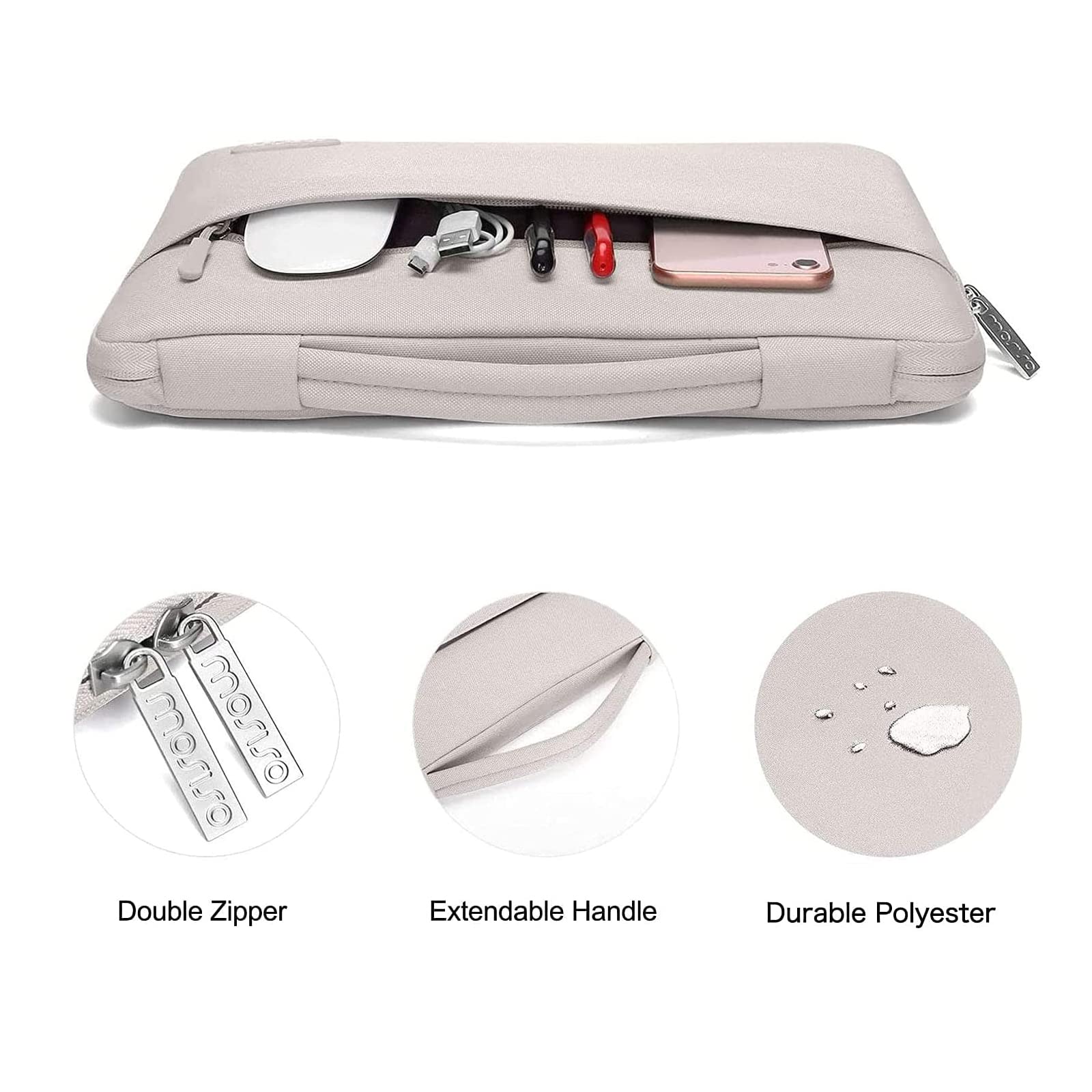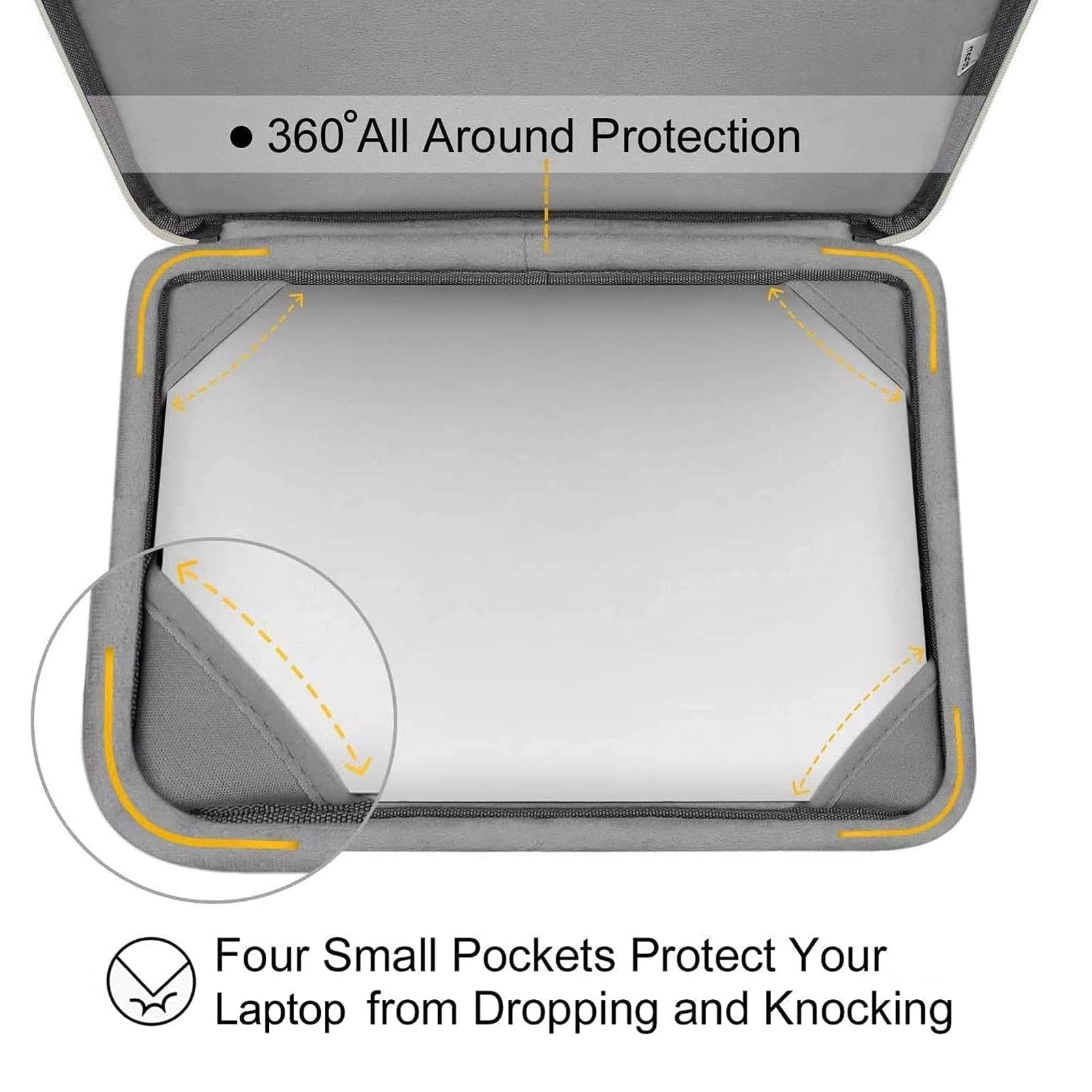 The 360 degree protective shockproof laptop sleeve with handle carrying bag internal dimension: 13.39 x 9.25 x 0.79 inches (L x W x H); external dimension: 13.98 x 9.84 x 0.79 inches (L x W x H). The front side pocket dimension: 11.61 x 9.25 inches (L x W). Made of polyester material, protect your laptop against accidental spills. Slim and lightweight, does not bulk your device up and can easily slide into your briefcase, backpack or other bag. Ideal for business, daily and travel.