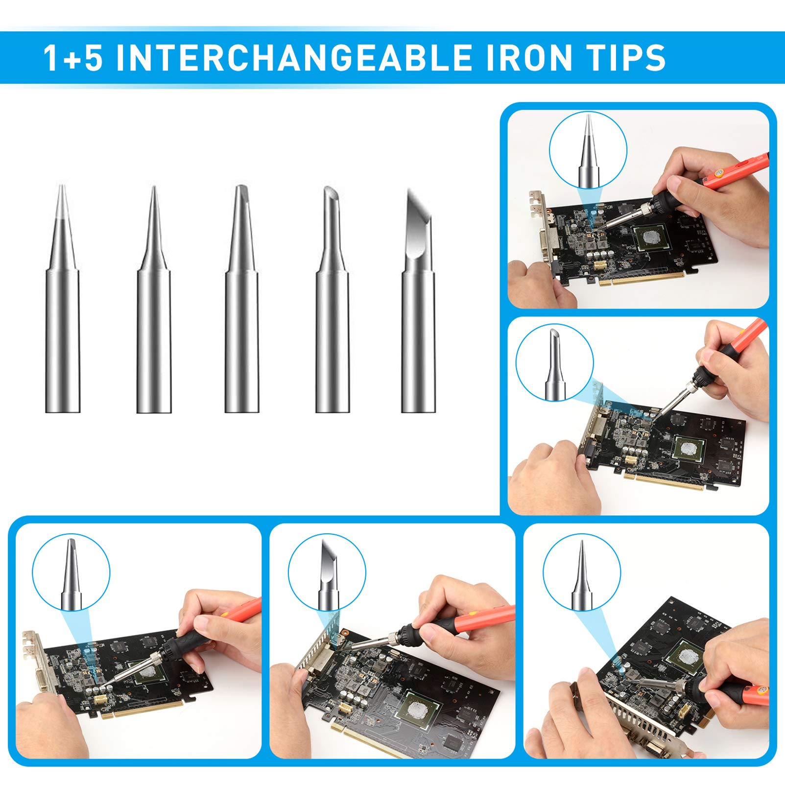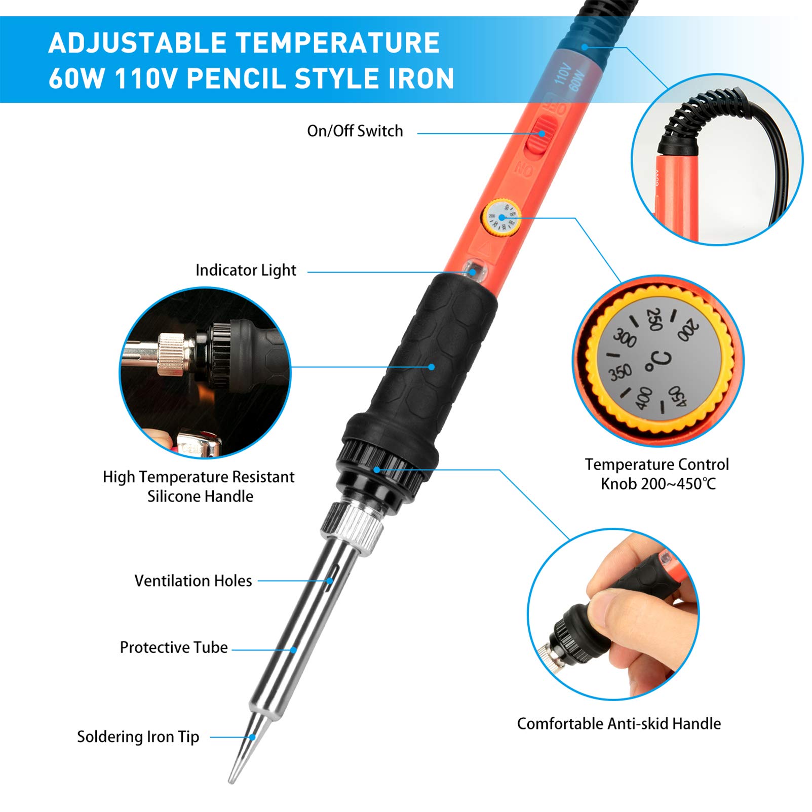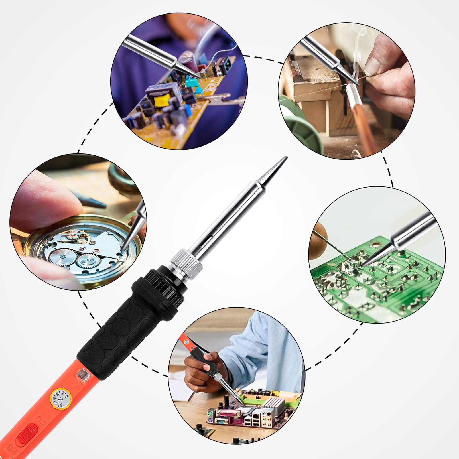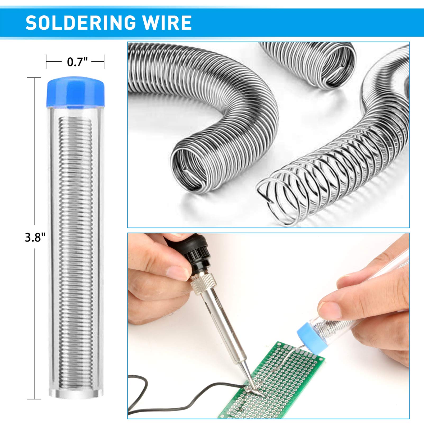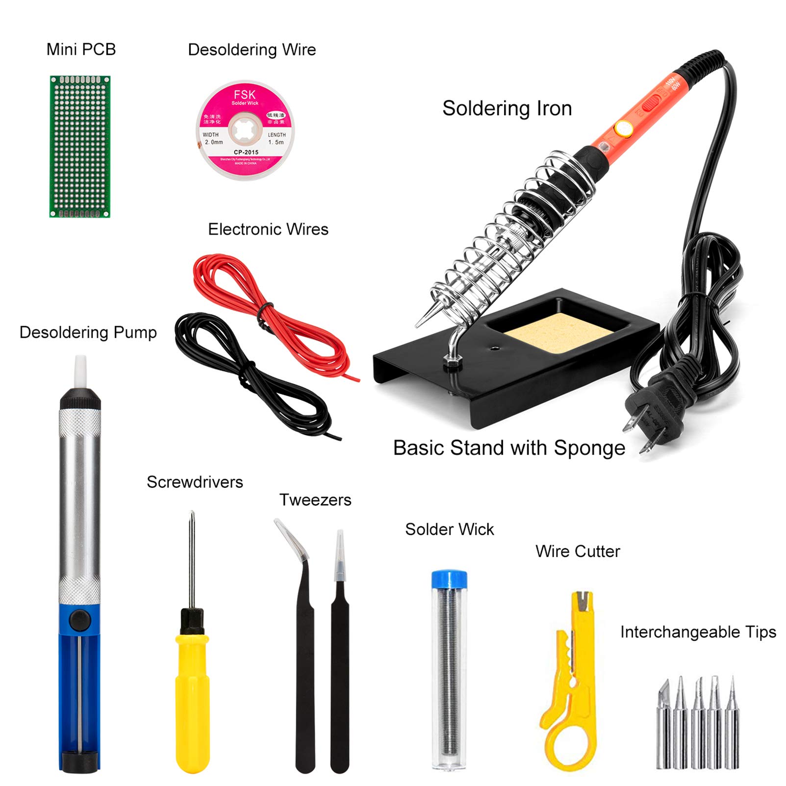⭐Comes with soldering iron, stand, cleaning sponge, screwdrivers, 22 AWG wires, desoldering pump, tin wire tube, anti-static tweezers, wire stripper tool, solder wick and PCB, 5pcs tips set, toolbox.