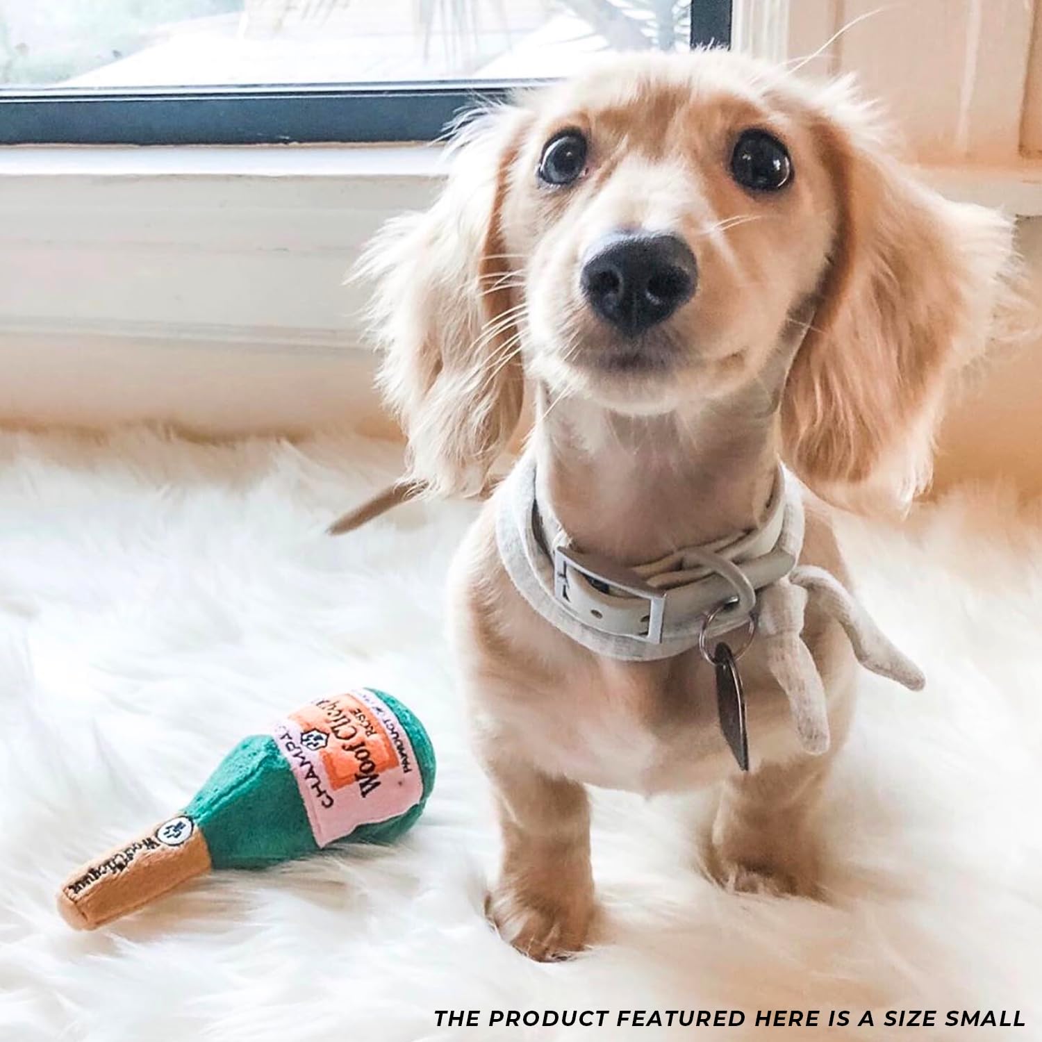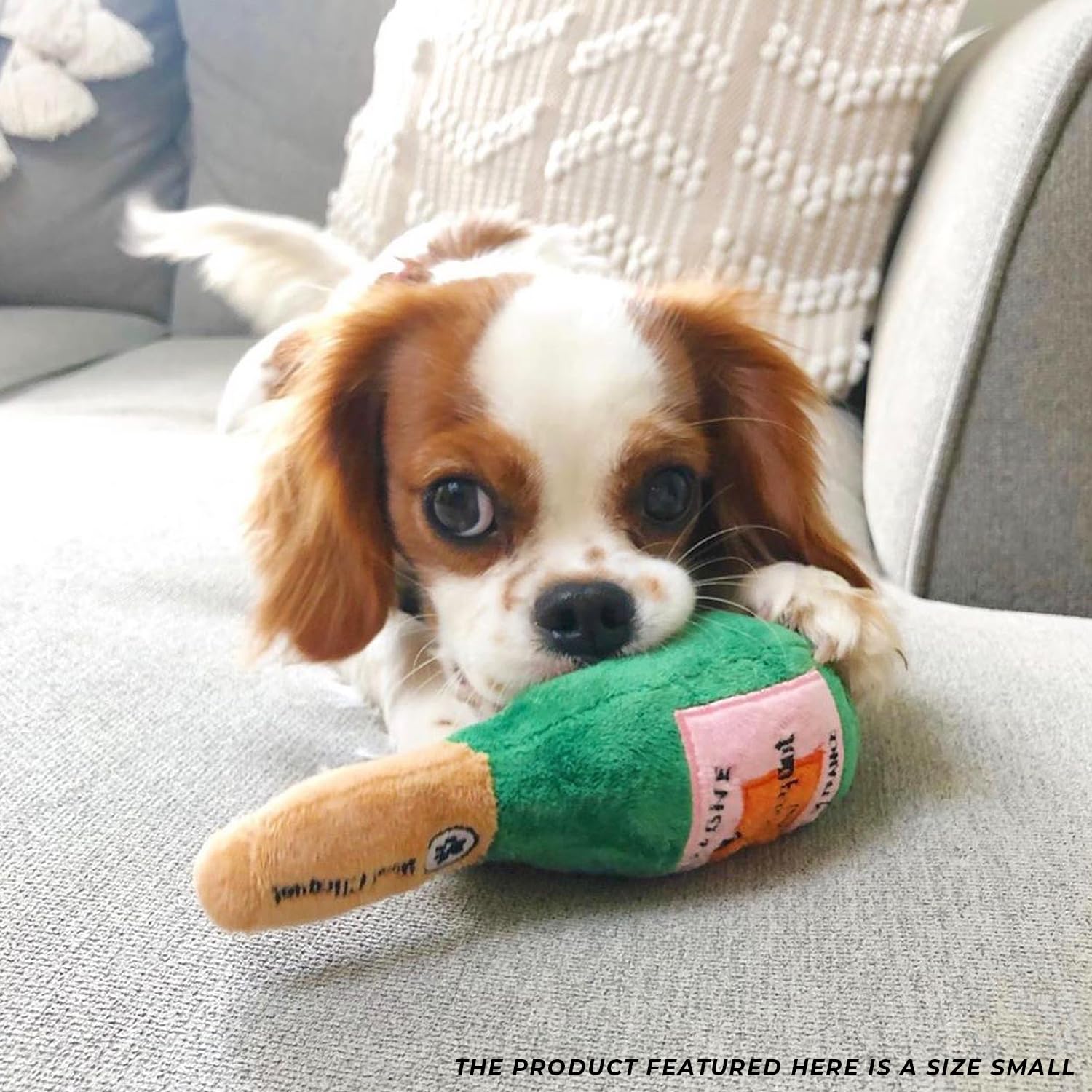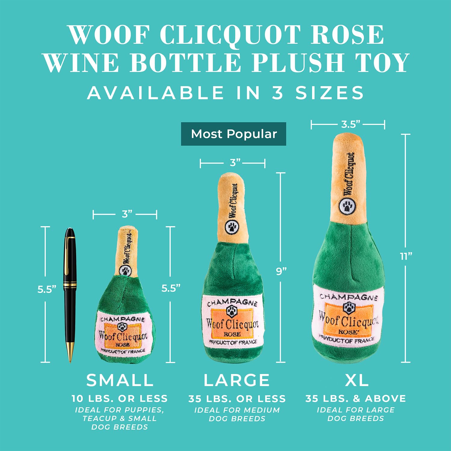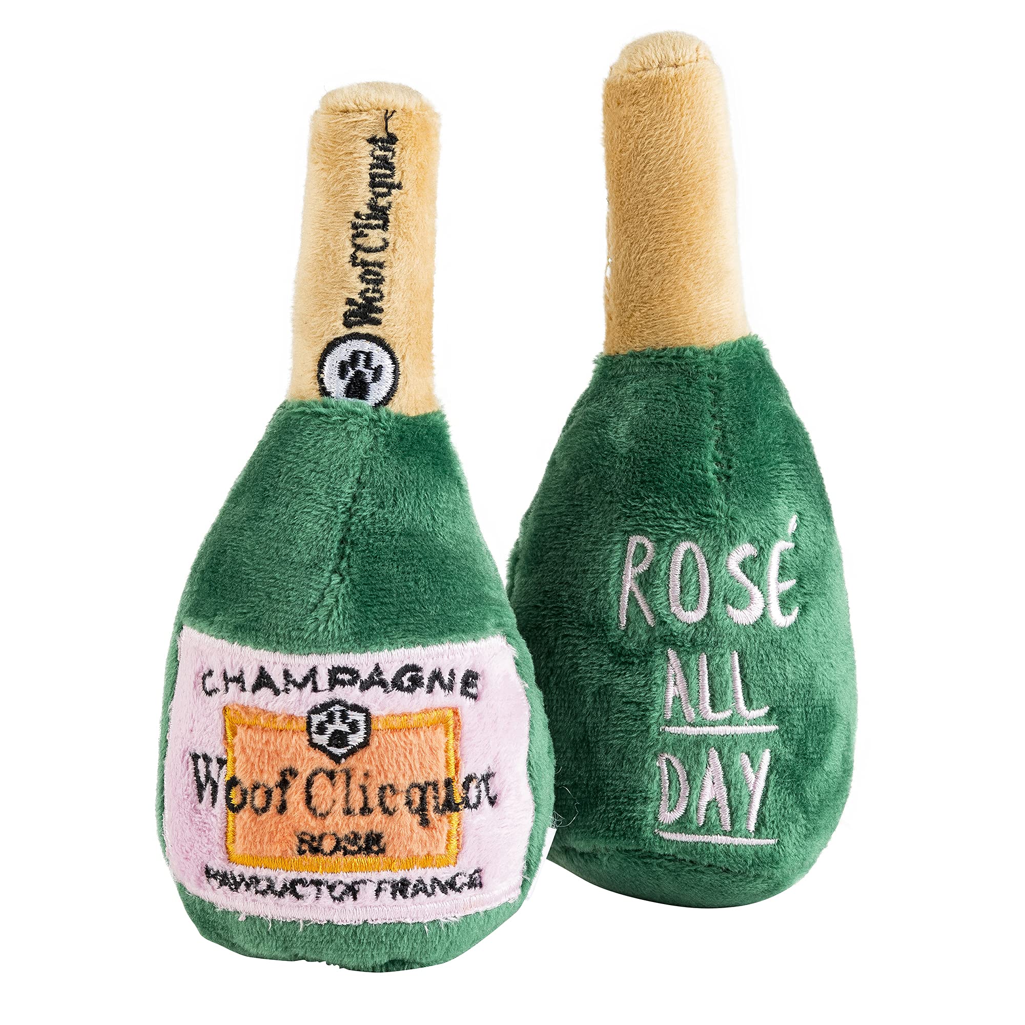 Fizzy Fun Dog Toy: Time to pop the bubbly with your pup! The Woof Clicquot Rose' dog toy has a deep green velvety look and a hidden squeaker that’ll keep tails wagging; perfect for dog birthdays or as an gift for dogs, this cute dog toy screams style and fun for puppies and small breeds