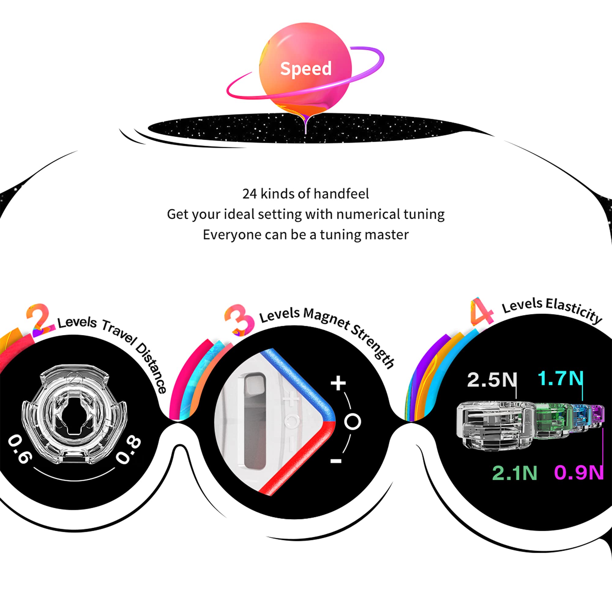 ✅24 KINDS OF SETTINGS😝- The GAN 251M Leap Series provides 2 levels of Travel Distance, 3 levels of magnet strength and 4 levels of elasticity. You can easily customize your own 251M Leap and there must have a unique setting for you. GREAT!!!