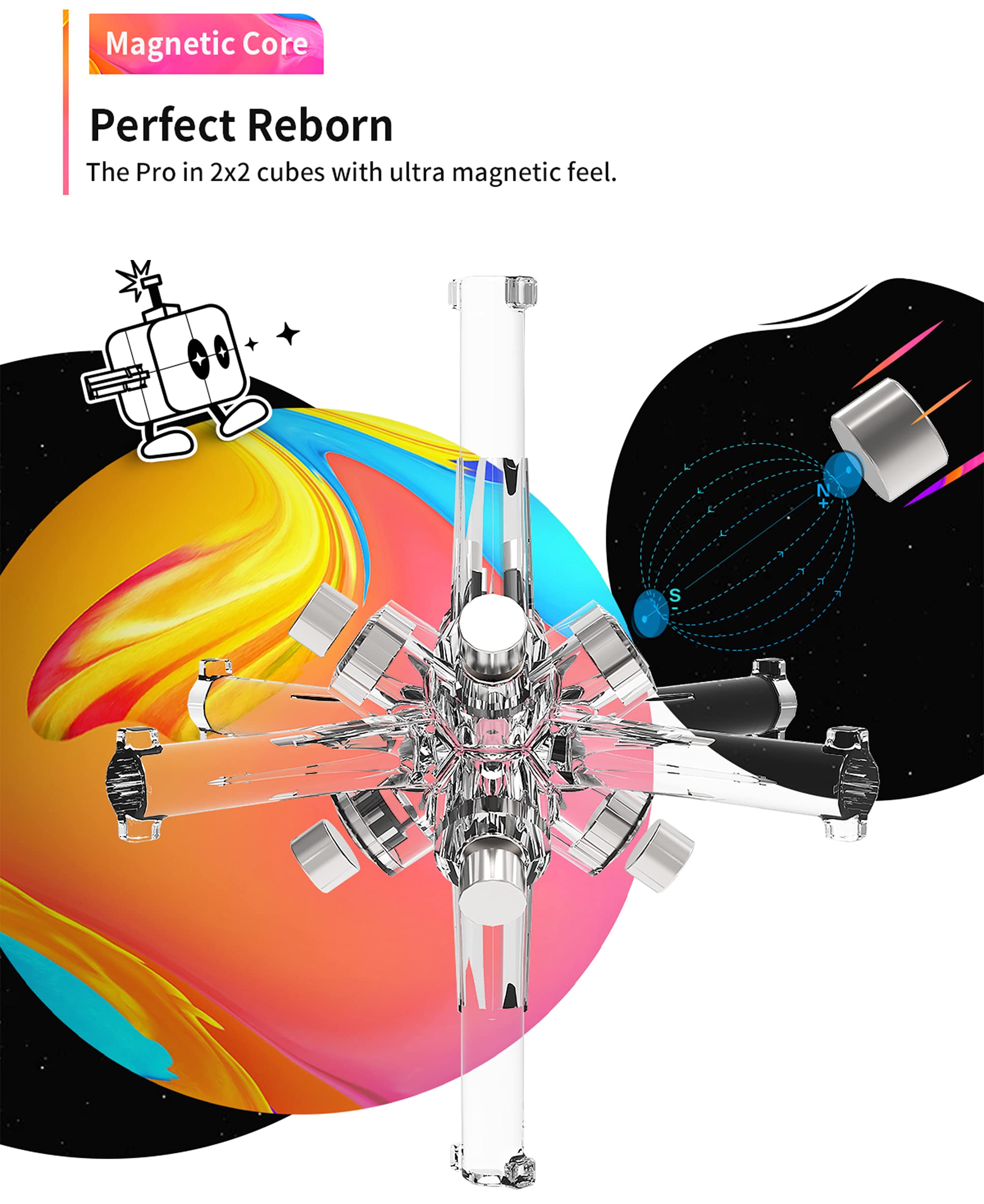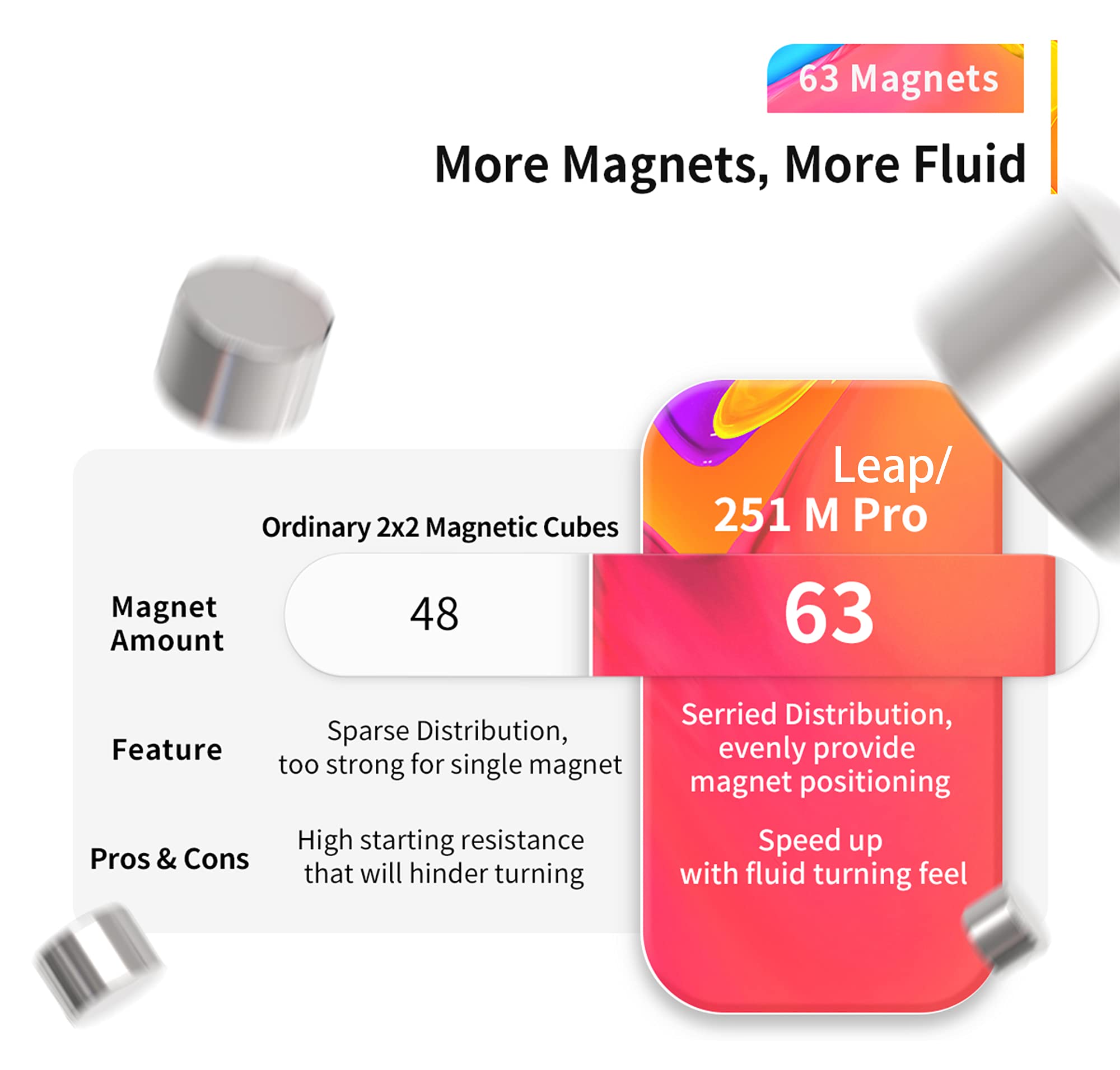 ✅63 MAGNETS BUILT-IN🤪-For a speed cube, we believe that a magnetic cube with more magnets is better. With 63 Magnets inserted, which has 15 more than ordinary 2x2 Magnetic Cubes, the 251M Leap features a serried magnets distribution and it will speed up your cubing speed with fluid turning feel. AMAZING!!!