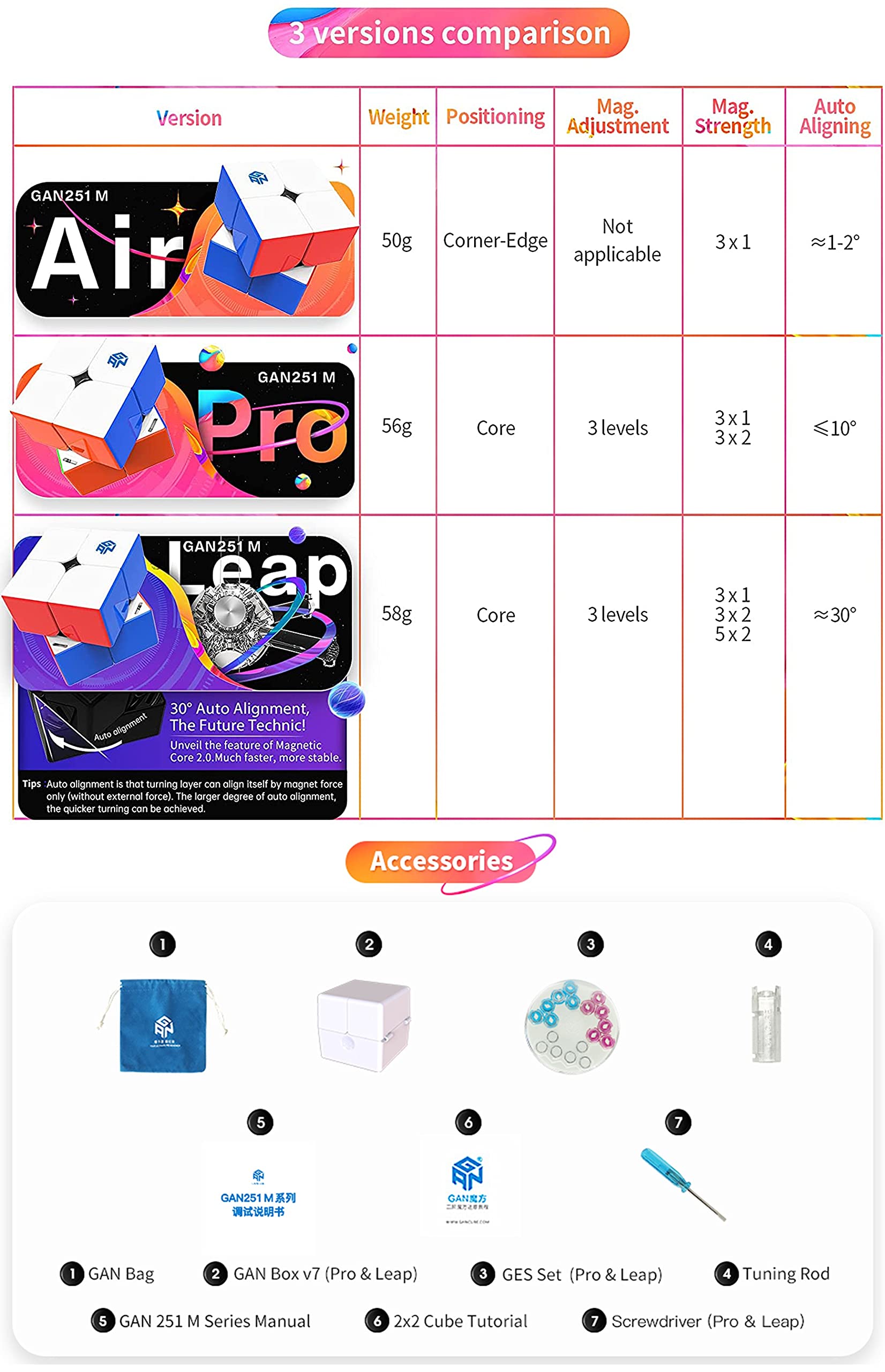 ✅4 VERSIONS of 251m AVAILABLE😬- The Upgraded 251 M Series has 4 different versions: Air, Pro, Leap and Leap UV. 251MAir features a 50g lightweight but it doesn't have adjustable magnets system and magnetic core. For 251M Pro and 251M Leap, they both have the enhanced core positioning system and 3 levels of magnet adjustment. However, the Leap version has bigger core magnets and larger auto aligning, which result in faster speed cubing.