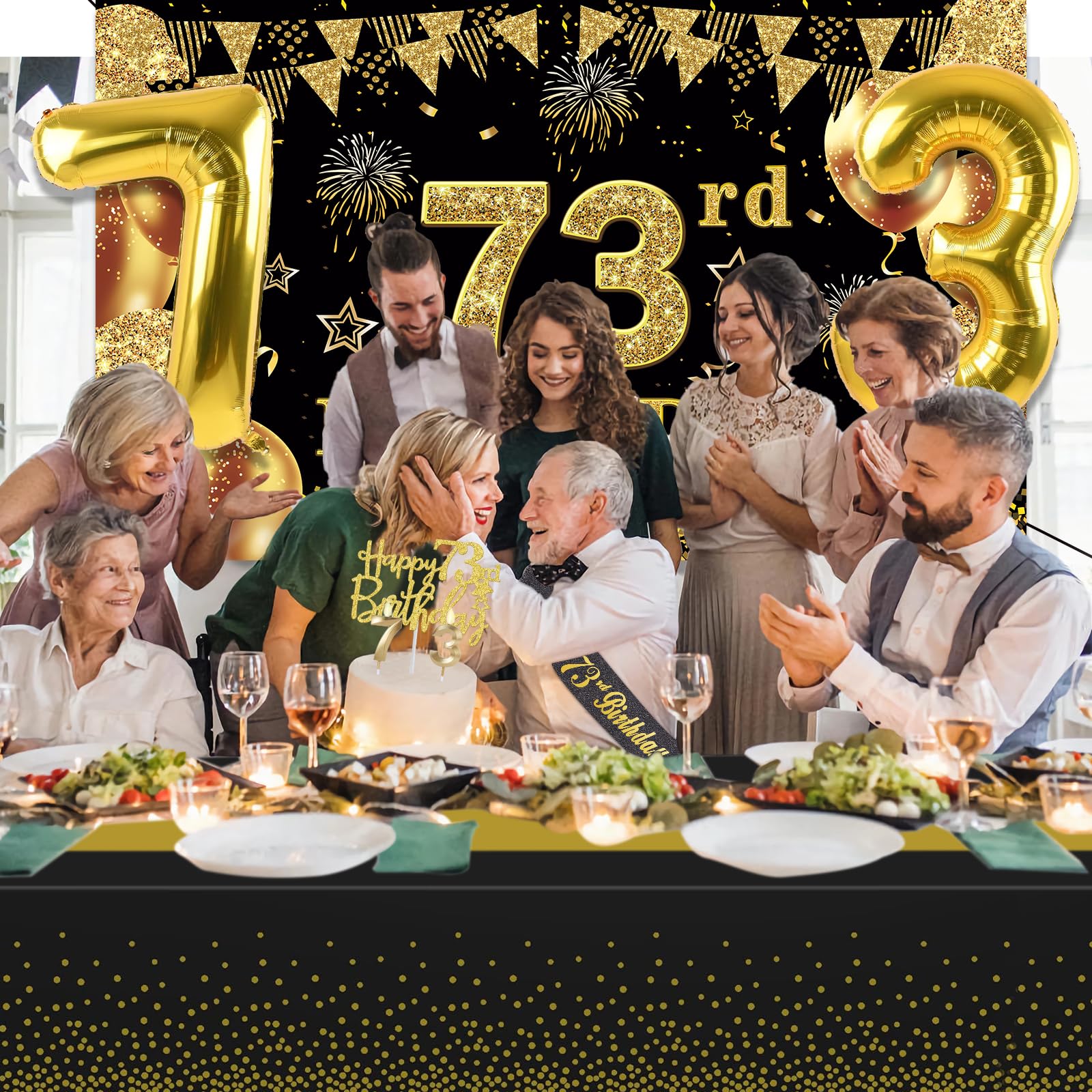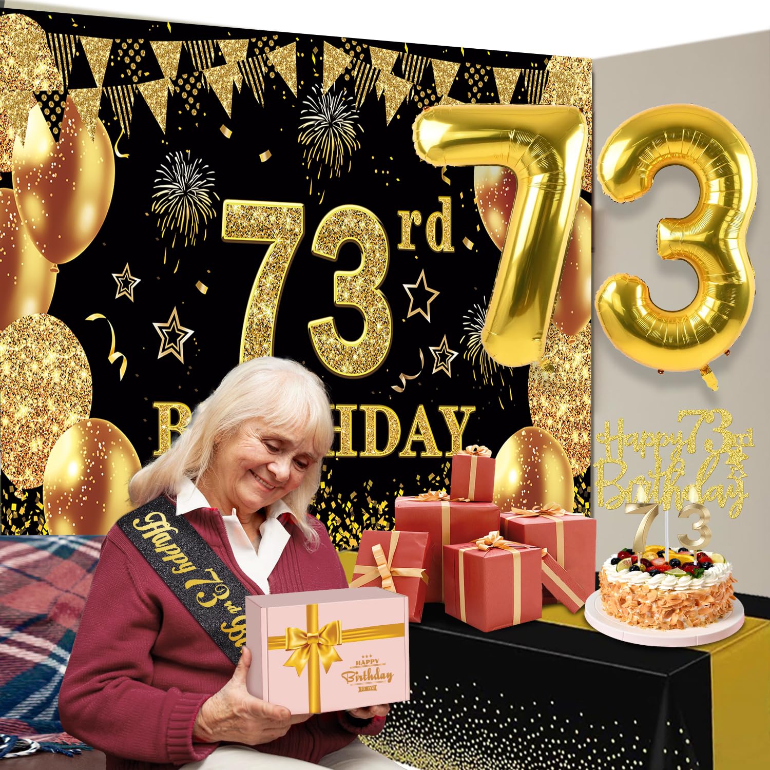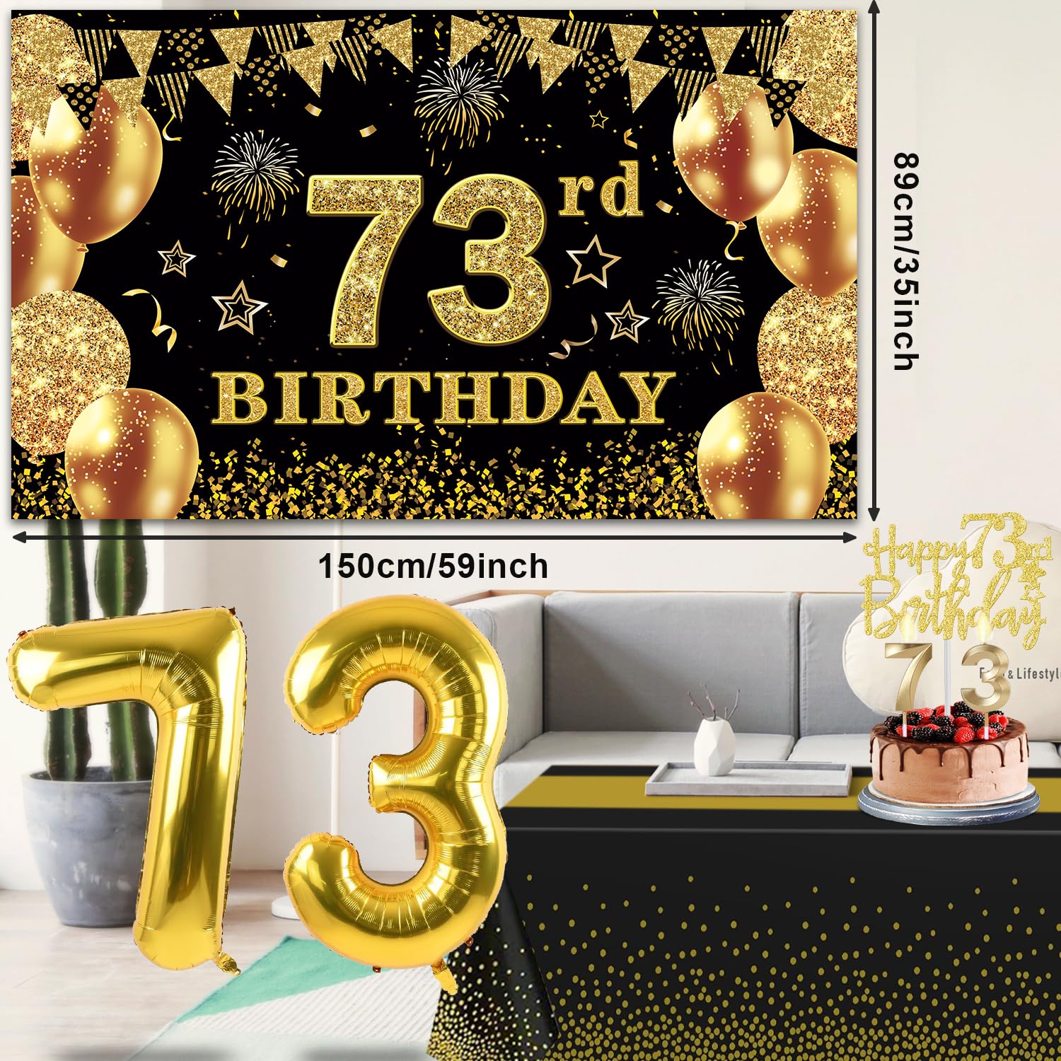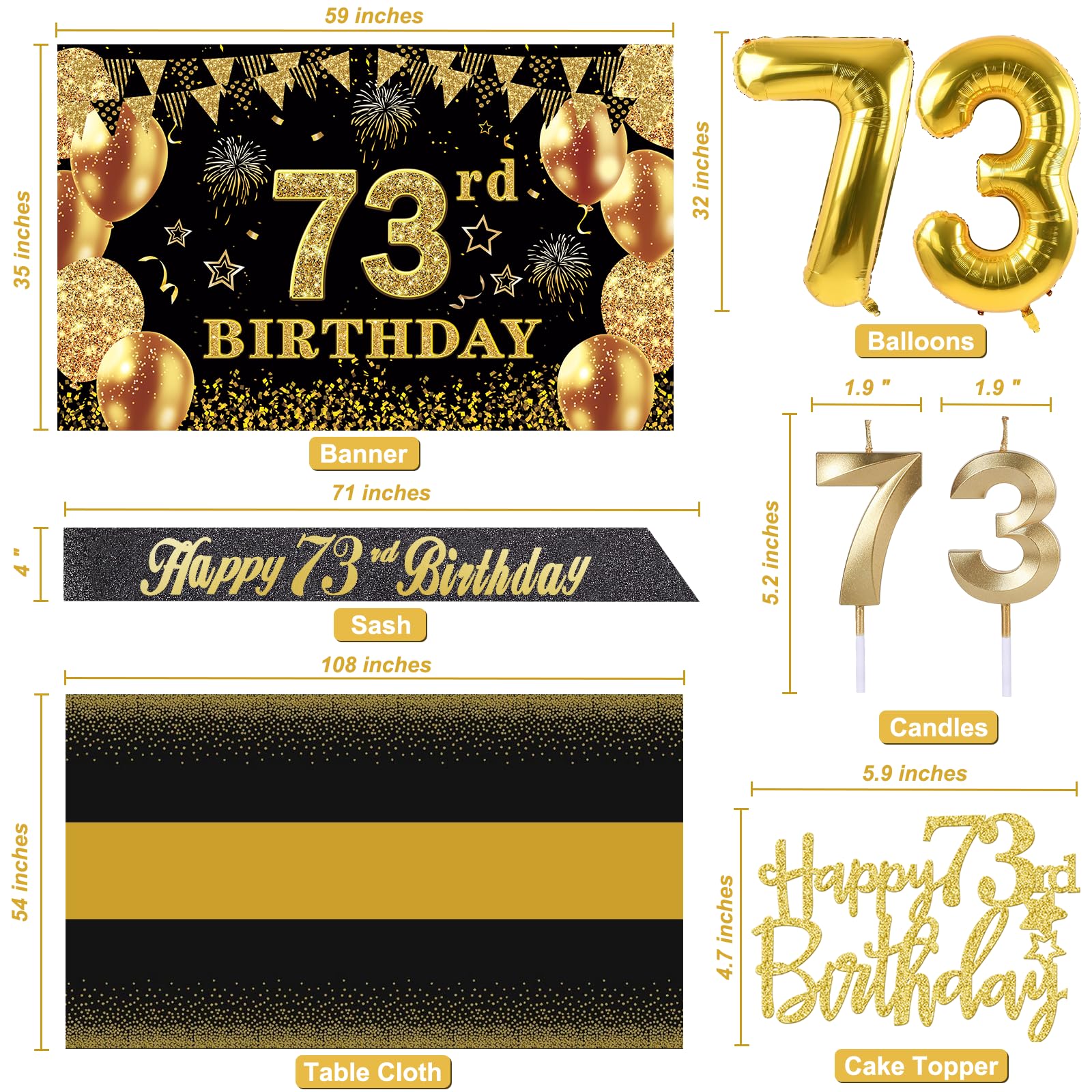 73rd Birthday Decorations Kit: Packing Coming with Large 73rd Birthday Banner x 1pc, Big Gold 73rd Birthday Balloons x 1set, Black and Gold Table Cloth x 1pc, Black Glittery with Gold Foil Words Happy 73rd Birthday Sash x 1pc, 73rd Happy Birthday Cake Topper x 1pc, Gold Number 73 Candles x 1set. This Value Black and Gold Party Decorations Set Meet Your Every Needs and Expects in 73rd Birthday Milestone