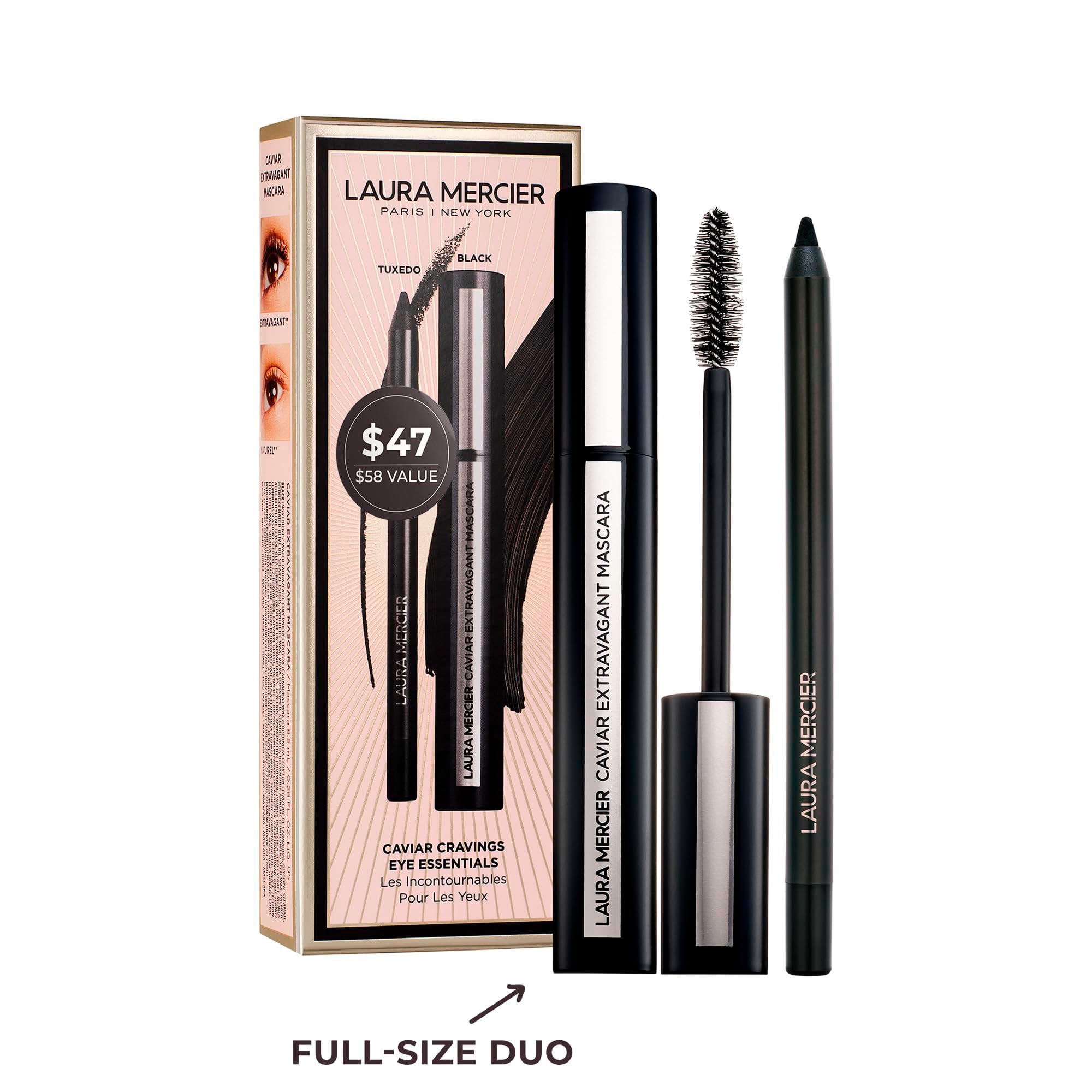 Caviar Mascara and Eyeliner Duo includes full sizes of the Caviar Extravagant Mascara and the Caviar Tightline Eyeliner in Tuxedo.