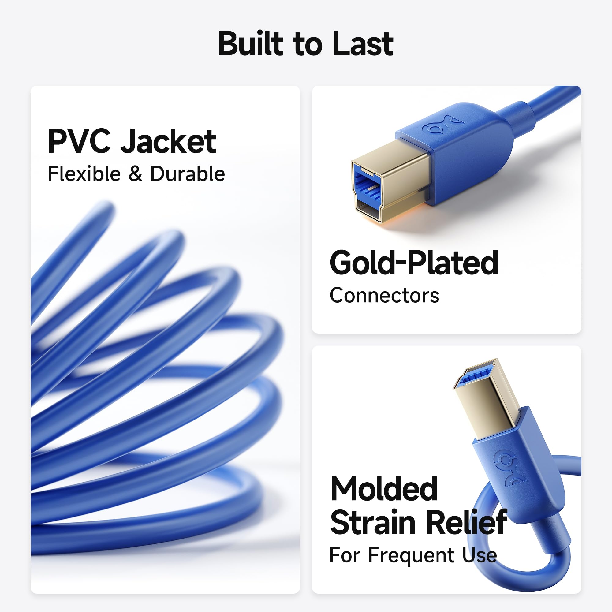 Superior Performance and Reliability: Featuring gold-plated connectors, bare copper conductors, and foil & braid shielding, this USB Type B 3.0 cable ensures optimal performance, error-free data transmission, and fast charging speeds.