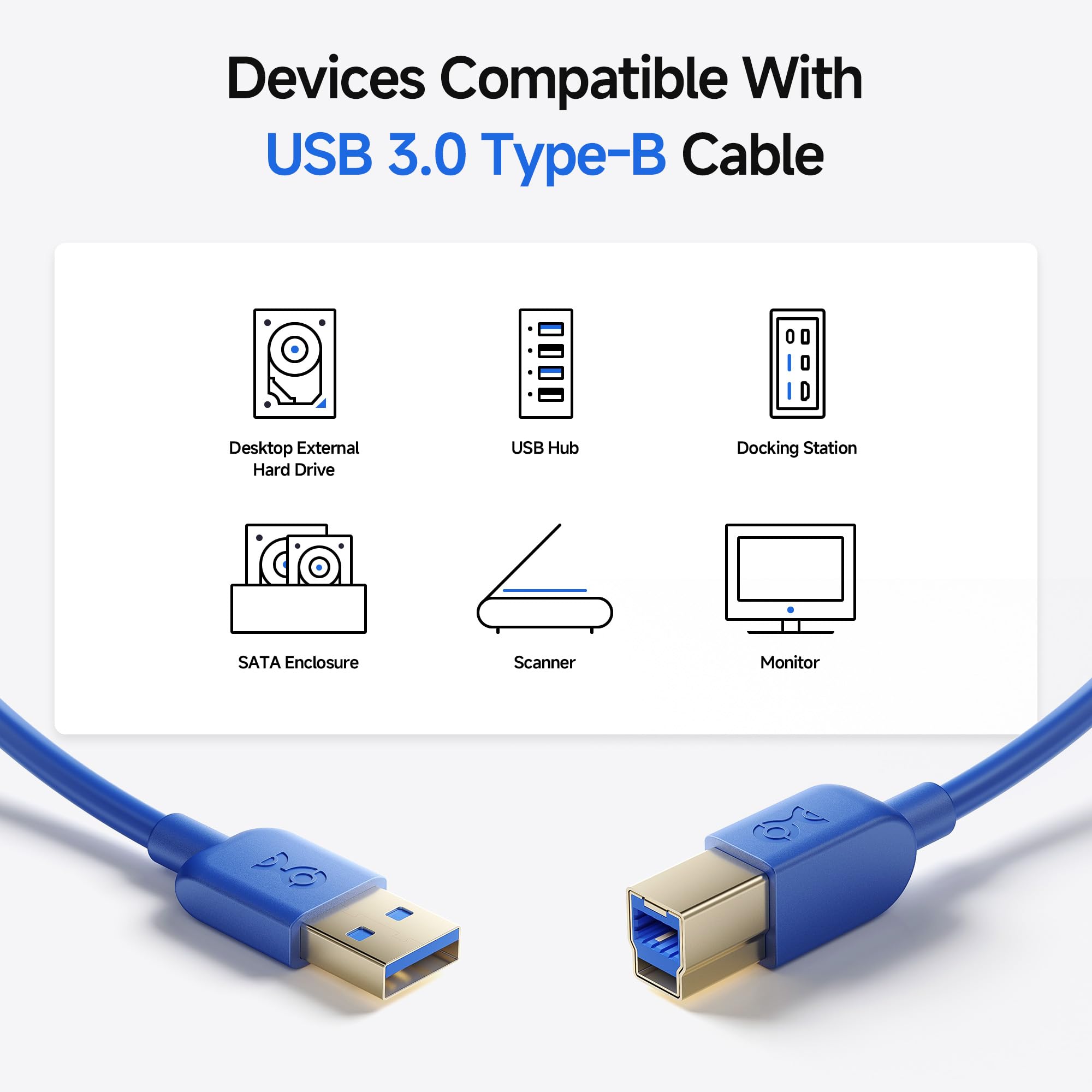 Broad Compatibility with Popular Devices: The USB 3.0 Type B cable is compatible with Fujitsu ScanSnap iX500 scanner, Dell S2340T monitor, Dell USB 3.0 docking station, HP USB 3.0 port replicator, and Western Digital (WD) and Seagate desktop USB 3.0 external hard drives equipped with a Type-B USB 3.0 port.