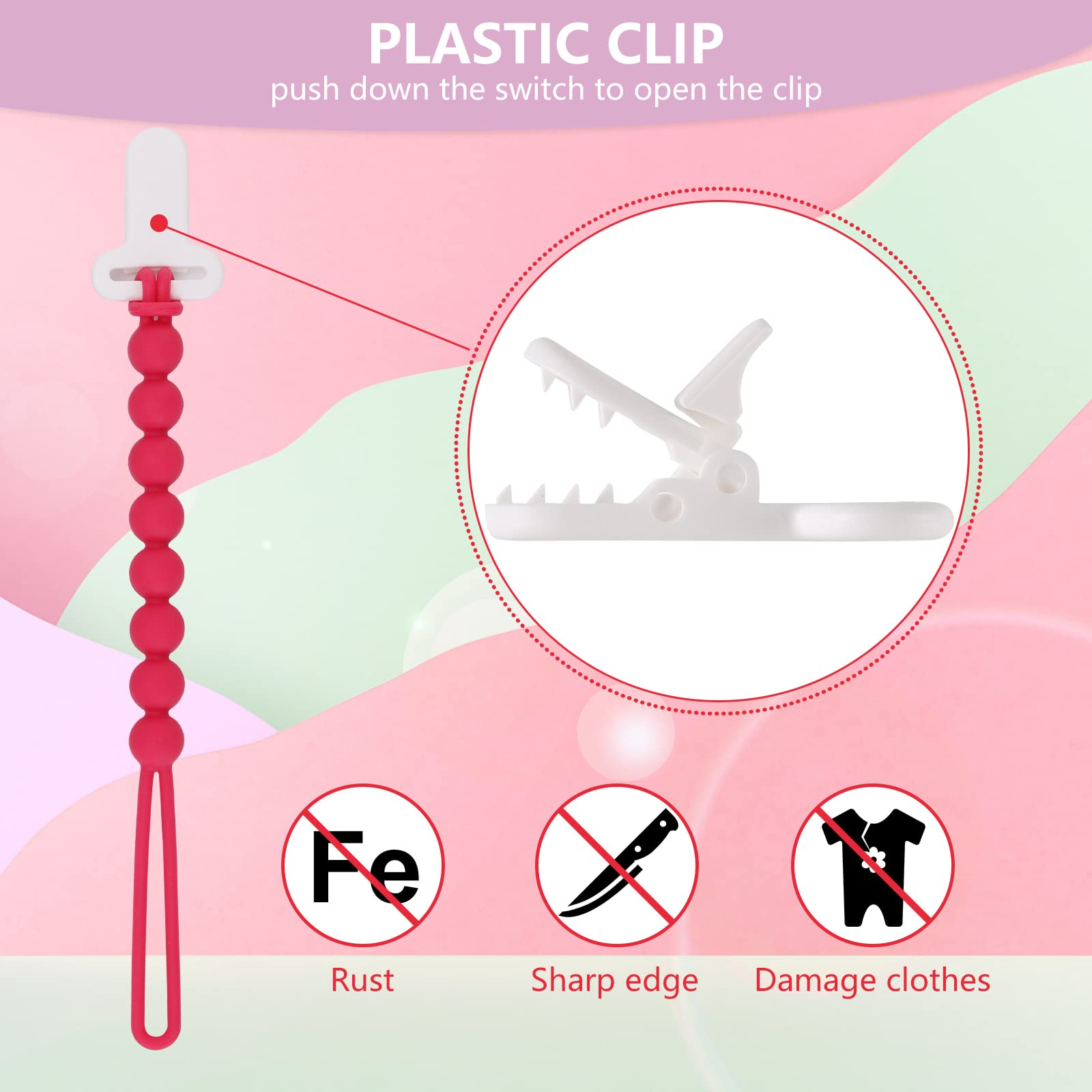 Quality & Safety You Can Trust: Our pacifier clip is made of plastic, which won't rust like metal clips and is a breeze to clean and maintain. We use 100% food-grade silicone for the beads, ensuring that it's safe for your baby and free from harmful chemicals.