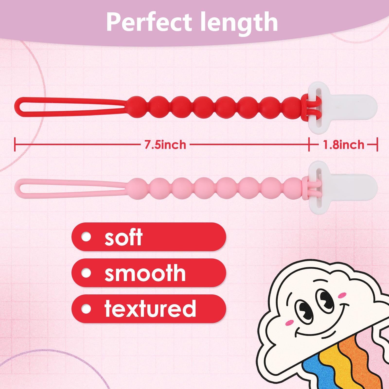 Soothe Your Baby's Soreness: Our silicone pacifier clip isn't just practical, it can also provide relief for your baby's sore or teething gums. The clip offers visual and tactile stimulation, making it an essential item for any parent of a newborn or young baby.