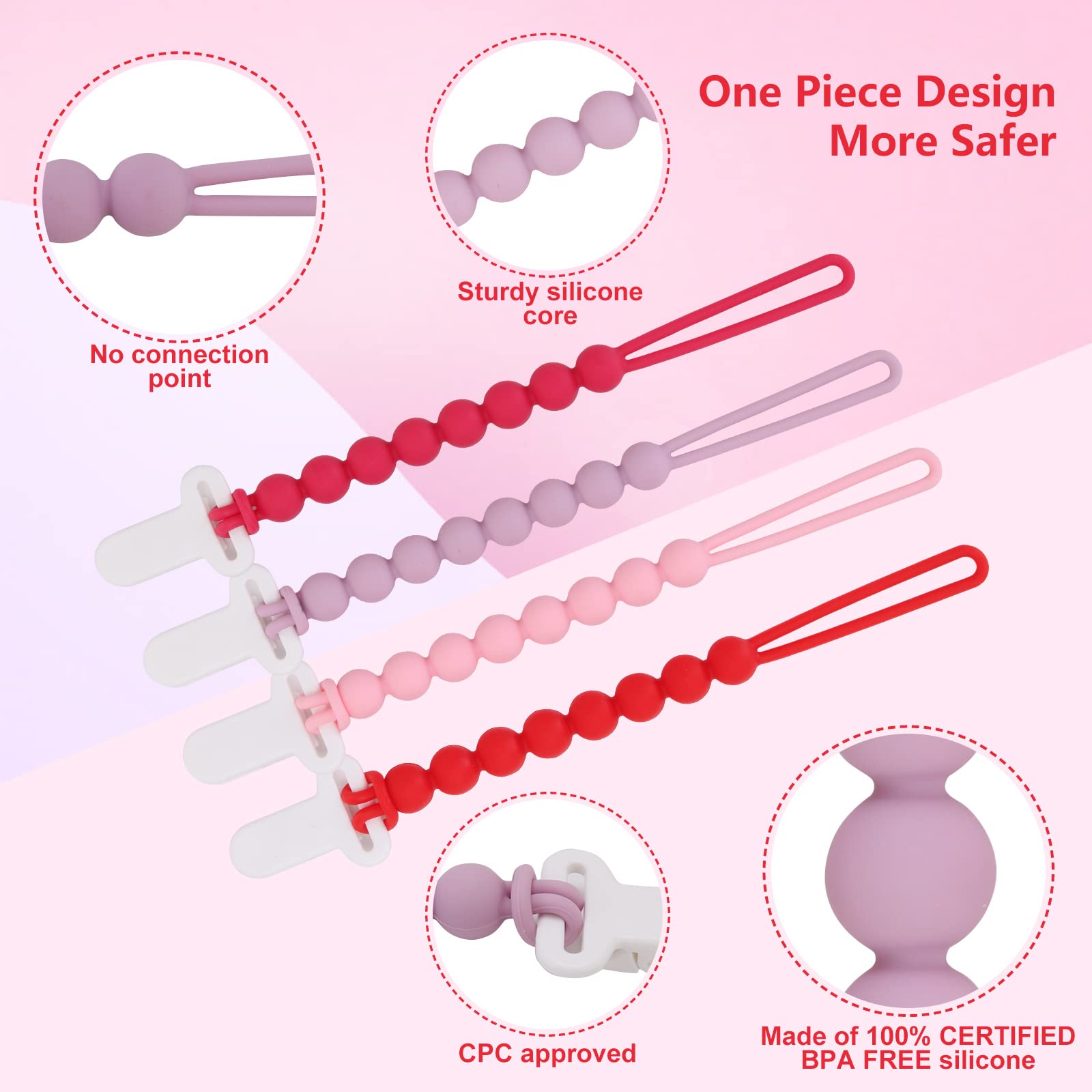 Upgrade Your Baby's Essentials: Make life easier for you and your baby with our silicone pacifier clip. Say goodbye to lost pacifiers and dirty ones on the ground - our clip keeps your baby's pacifier clean and within reach. Plus, the one-piece design ensures that the beads won't separate, eliminating any choking hazards.