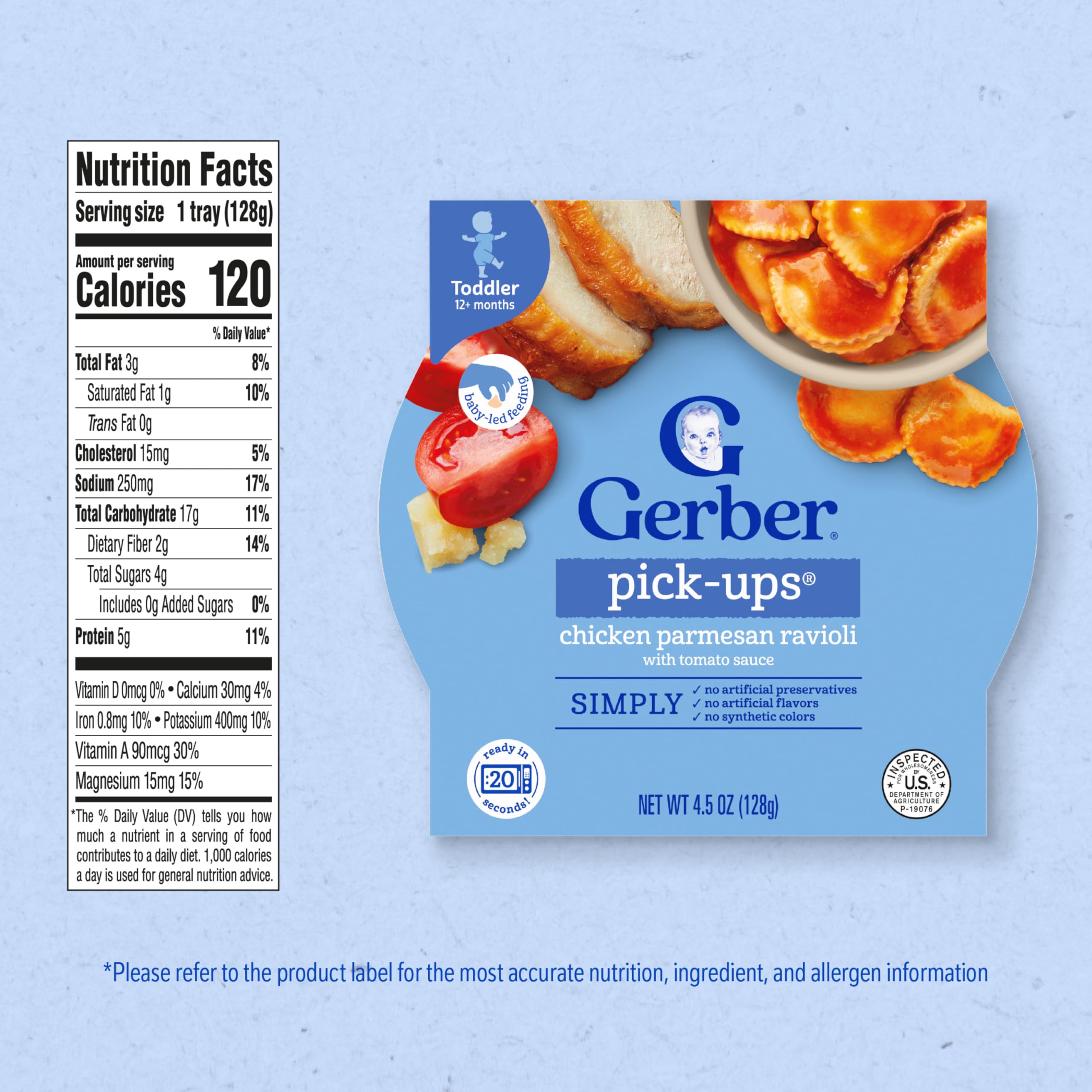 MEALTIME FOR TODDLER: This toddler approved mealtime comes with chicken parmesan ravioli in tomato sauce. Ready to eat in under 5 minutes, Gerber ravioli is perfect for busy parents who need a quick and nutritious option for their little one