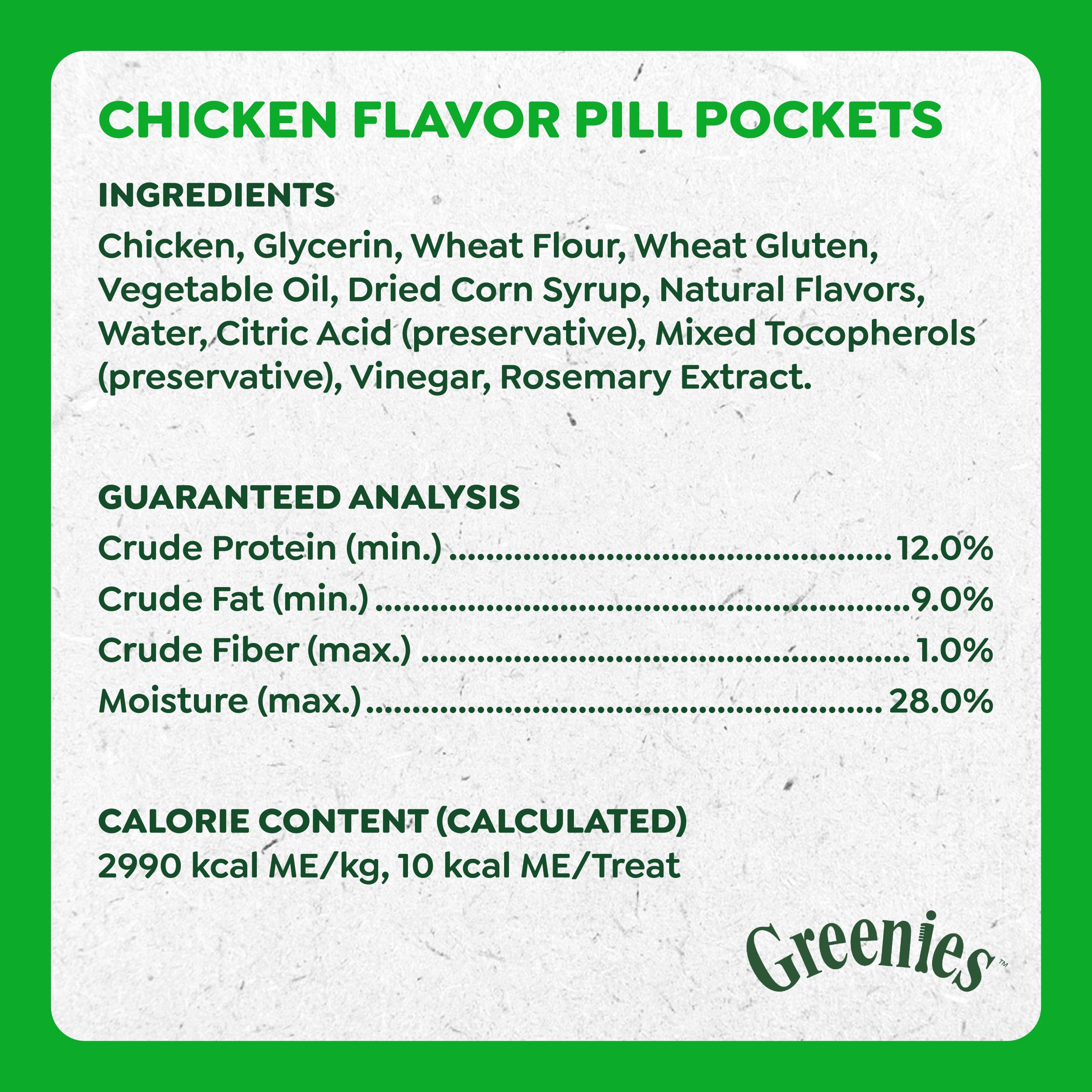 Turn pill time into treat time! Greenies Pill Pockets Treats are the #1 veterinarian-recommended choice for giving pills, based on a survey of US Veterinarians, making them a convenient pill pocket treat for pet owners, dog parents, and dog caregivers interested in everyday pet care. Why hide your pet's medicine in human foods like peanut butter or cheese when you can give them a dog treat that works as a medicine-concealing treat, made with natural ingredients plus minerals and trace nutrients? Greenies Pill Pockets Chicken Flavor Dog Treats ensure a tasty experience and take the hassle out of giving your canine companion medicine by concealing medication and helping deliver medication when you need to conceal pills. Whether for Large breeds or small dogs, these small-sized tablet Pill Pockets function as simple pill pouches or medicating pouches that make taking medicine a positive experience for your dog. And they're easy to give: Drop a tablet into the small dog treats to hide medicine, pinch the top to close, give it to your dog, and watch their medicine disappear. Greenies Pill Pockets dog treats are the easy way to give your dog their meds--and they'll never know the difference, offering everyday convenience for those who give medication regularly.