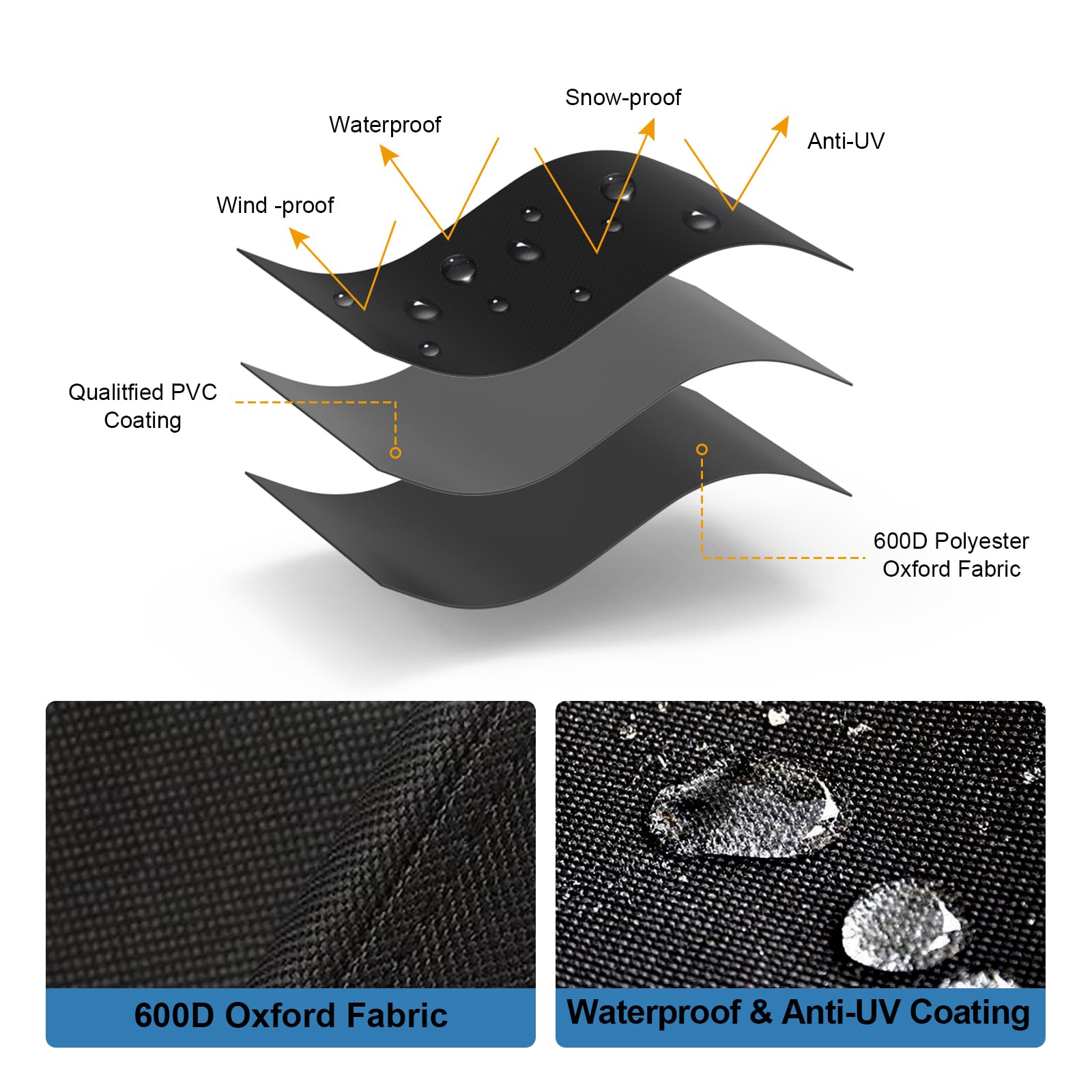 Function: Upgrade the stitching process keep your grill dry on rainy days. It can withstand heavy winds and won't crack in cold weather. 2 click-close straps are added at the bottom to secure the cover in place even in strong winds.The cover is very durable and easy to put on and off because its thick.