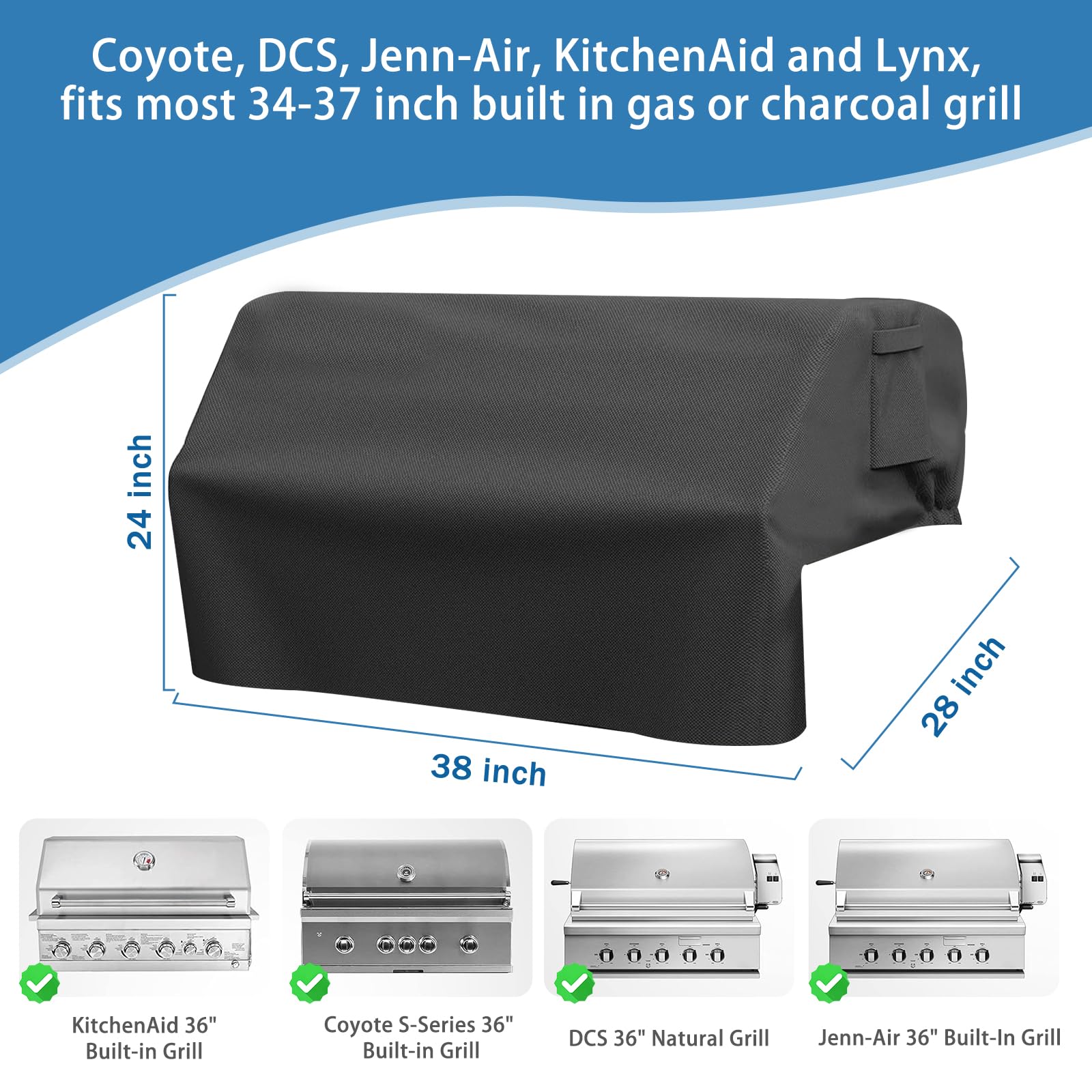 Compatibility: The heavy duty grill cover fits Coyote, DCS, Jenn-Air, KitchenAid and Lynx, fits most 34-37 inch built in gas or charcoal grill.