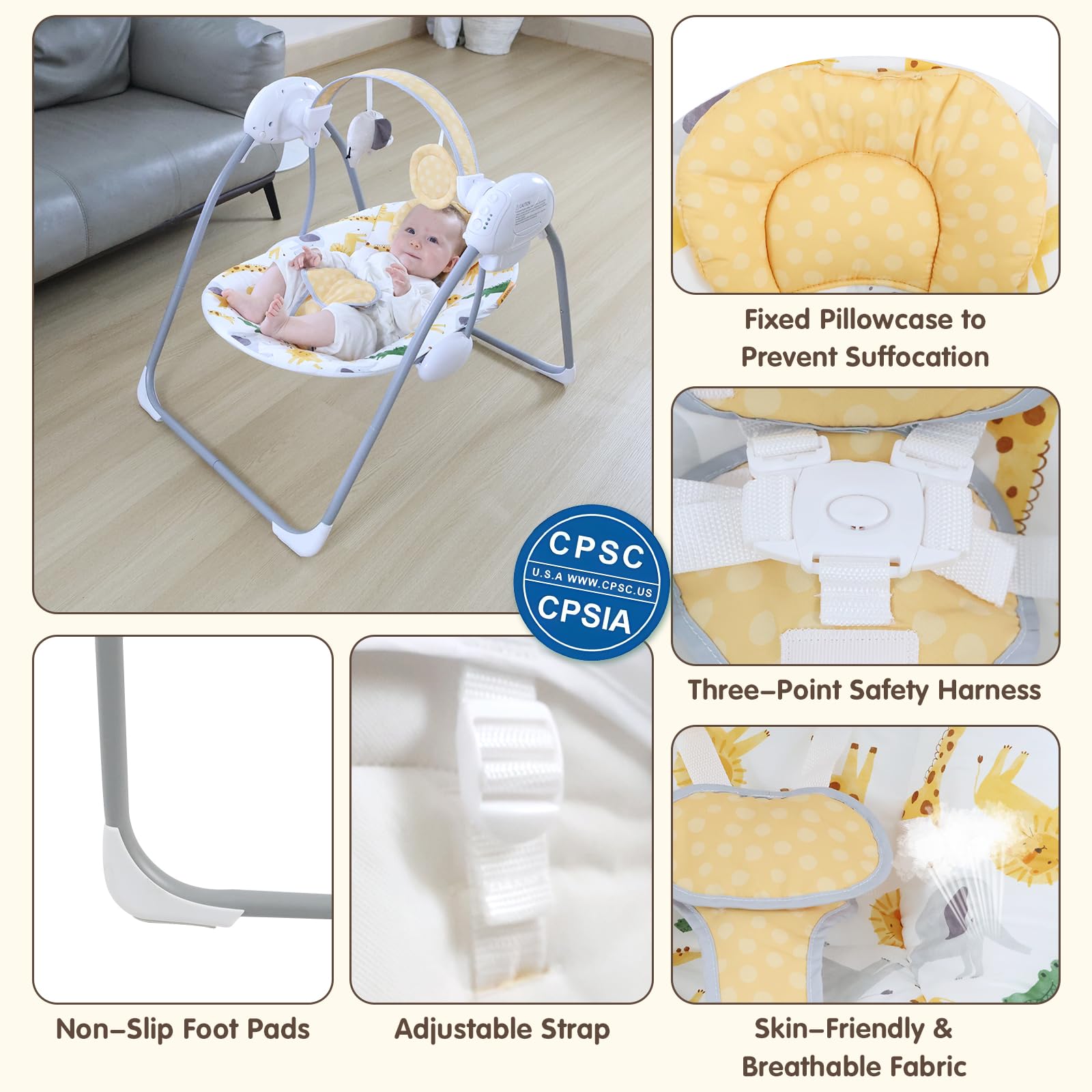 Soothing Sounds & Engaging Toys:Built-in 6 soft melodies with 3 volume levels create a calm environment for your little one. The removable toy bar includes soft plush toys to help develop hand-eye coordination. Baby swing with music, infant swing with toy bar, baby sensory toy.