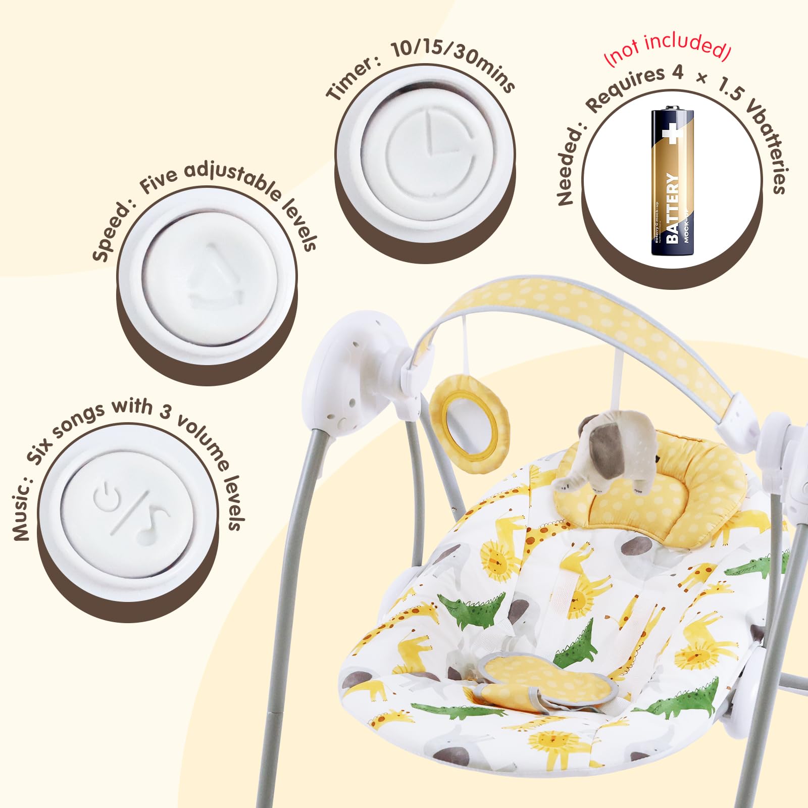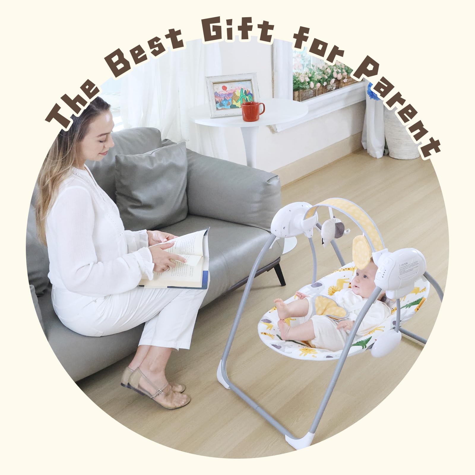 5-Speed Adjustable Swing & Timer Function:This electric baby swing features 5 swing speeds and 3 timer settings (10/15/30 mins) to meet your baby's different soothing needs. The adjustable motion calms your baby gently. Adjustable baby swing, smart swing with timer, soothing motion rocker.