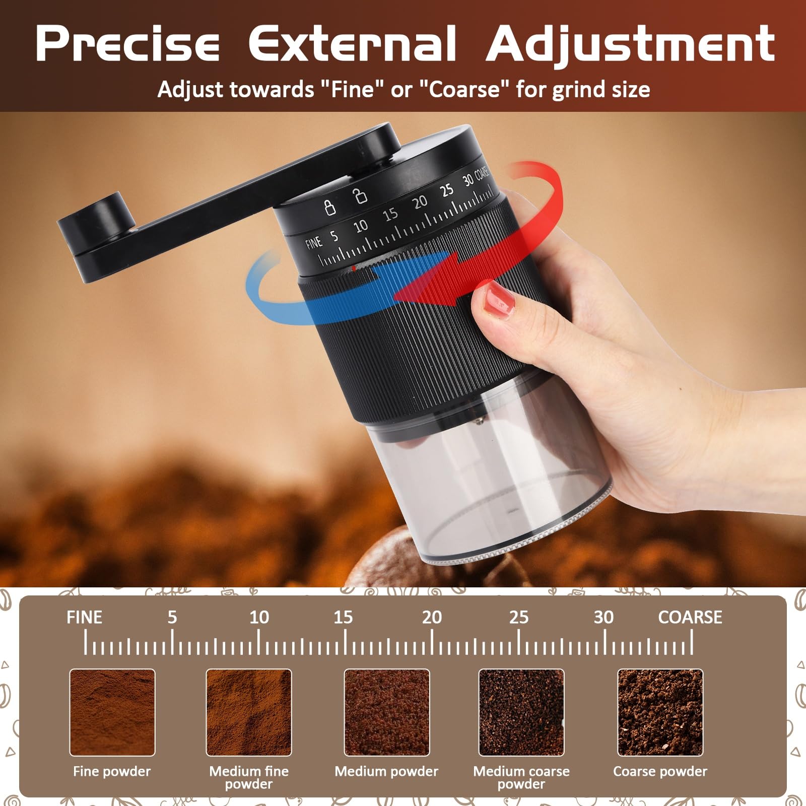 1. 35+ Grind Settings & Instant Adjustability NANSPATH Manual Coffee Grinder: Top-mounted external knob offers 35+ precise grind levels (French Press to Espresso) with no disassembly. Achieve café-quality consistency in seconds – ideal for portable coffee grinder enthusiasts seeking versatility without complexity.
