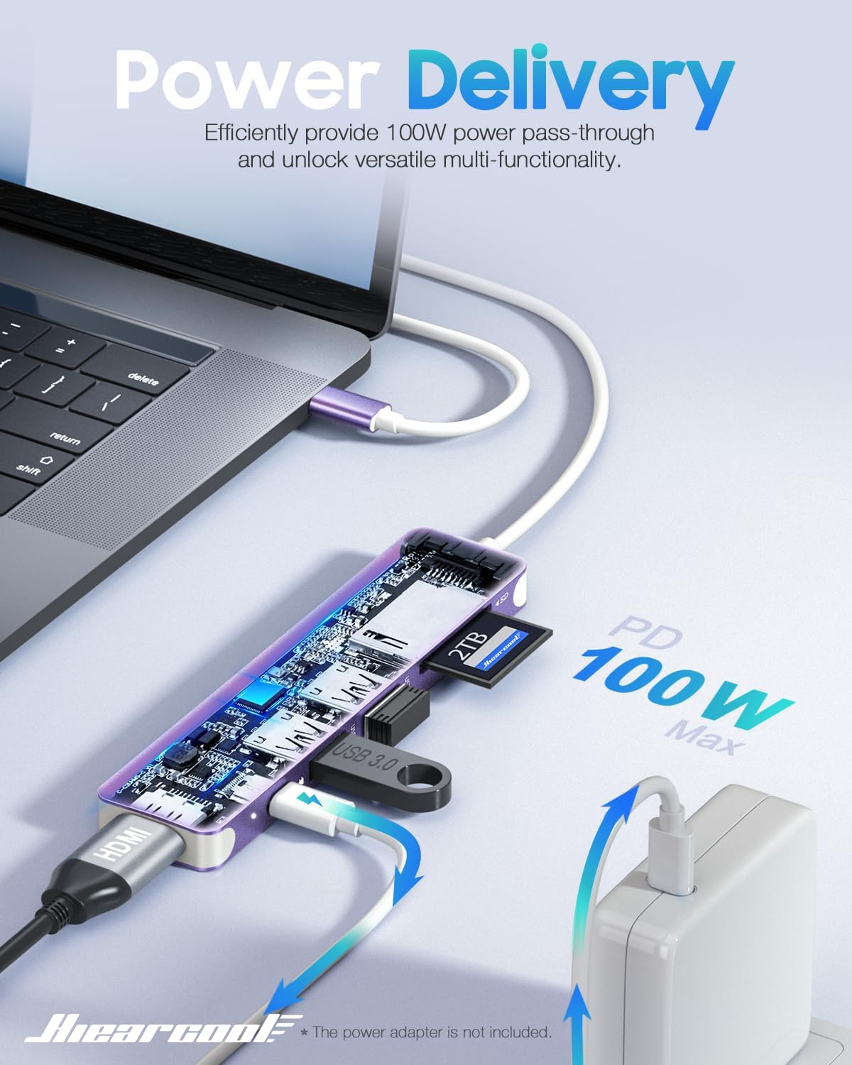100W USB-C Power Delivery Pass-Through – Supports up to 100W input; the laptop receives power minus hub consumption (actual rate depends on your charger, cable, and device)