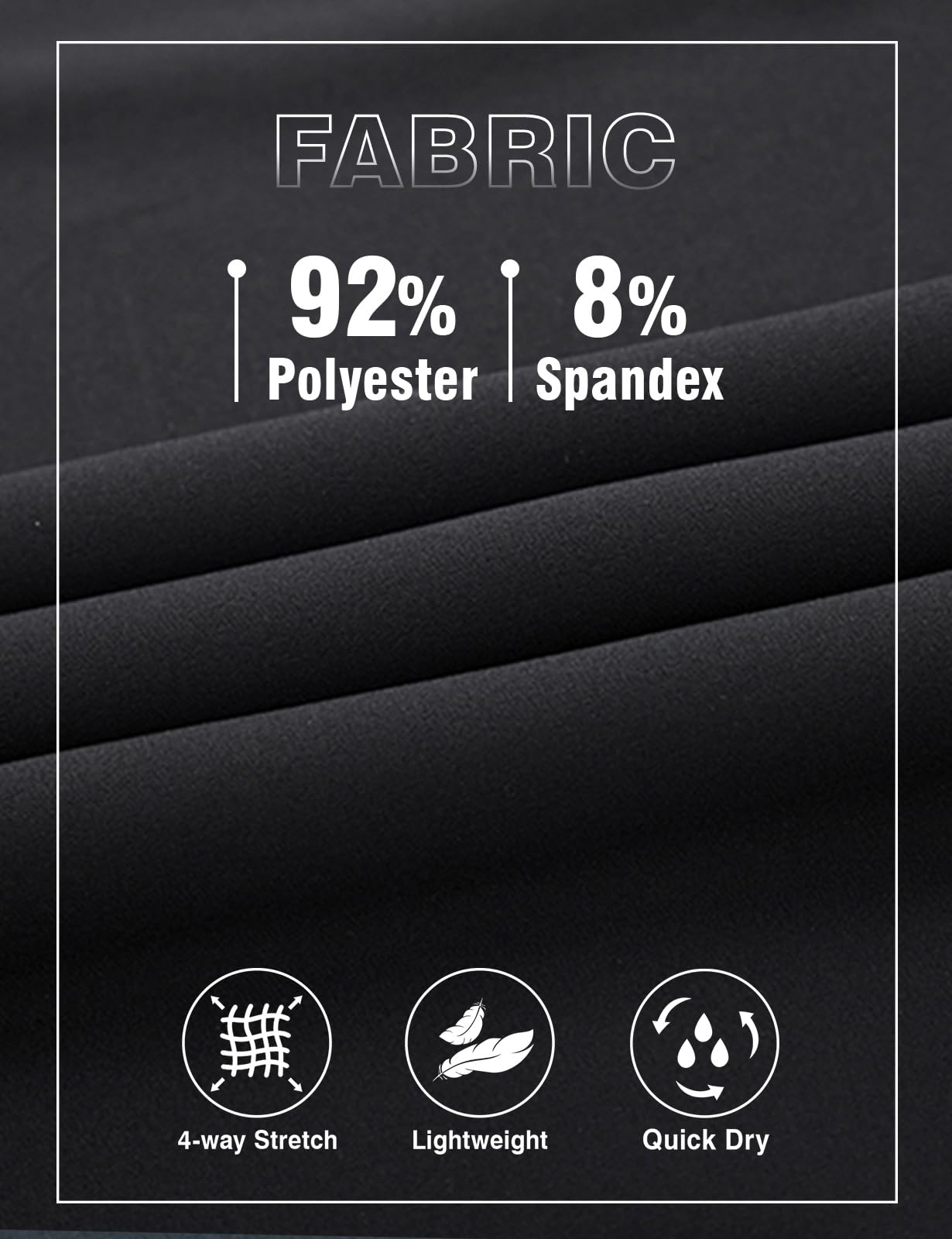 Quick Dry Fabric: Lightweight, breathable, moisture wicking, soft to skin, keeps you cool and comfortable