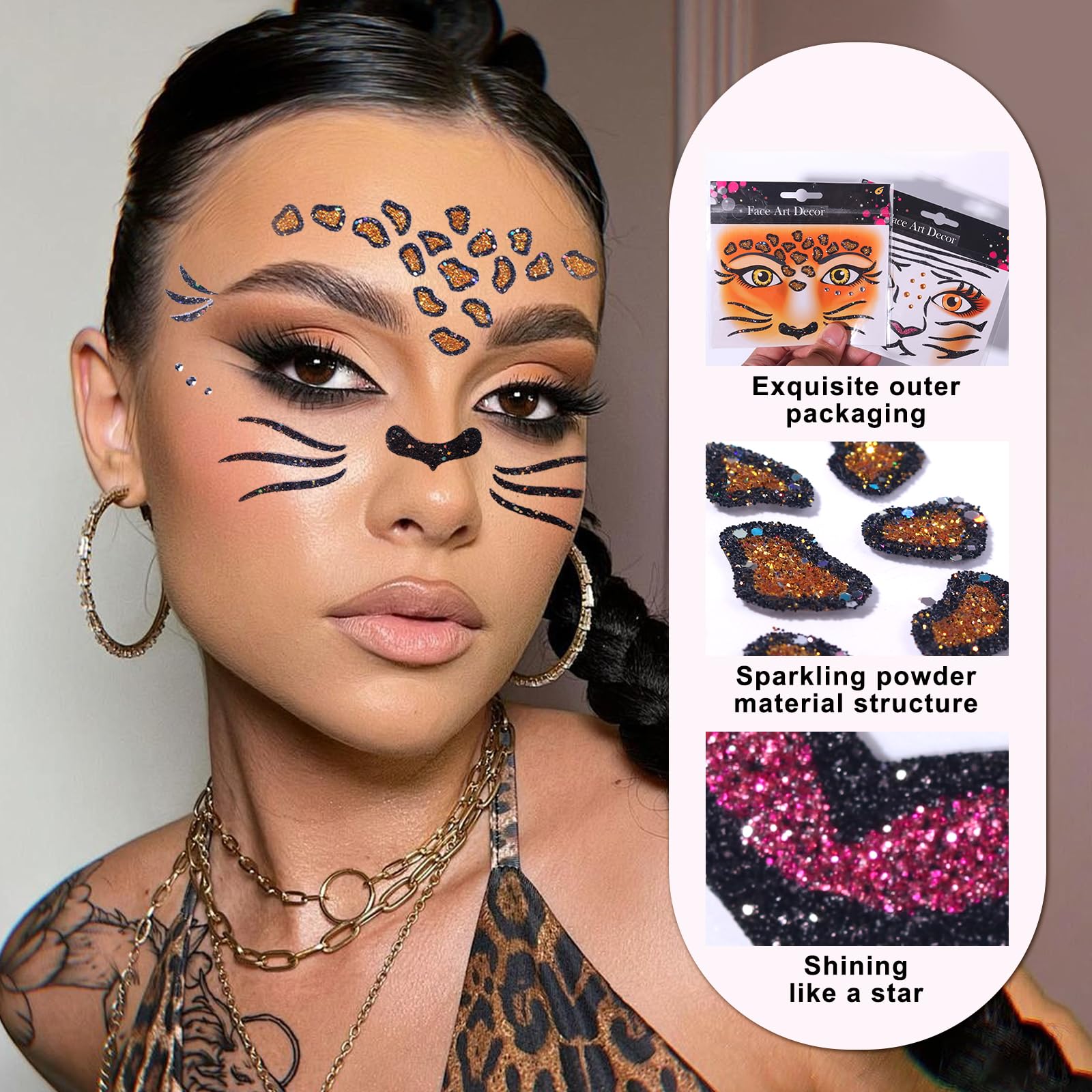 𝐐𝐮𝐚𝐧𝐭𝐢𝐭𝐲: Each set includes 2 face stickers, one featuring a tiger design and the other a leopard design, both in vibrant and glittering colors to make your look stand out.