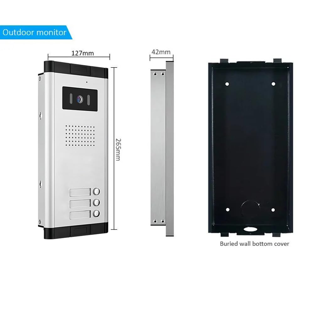 Wired Video Apartment Intercom System,2/3/4/5/6/8/10/12 Units 7 inch Monitor Video Door Phone Kit,Indoor Outdoor Video Doorbell,2 Way Audio for Home Camera Sensor:1.0MP,1/4"CMOS,3.6MM Lens View Angle:90 Degree Rainproof & Night vision:IP 55& 5M night vision Model size:275* 125* 45mm Material:Aluminum alloy Power supply:Supplied from indoor monitor Operation temperature:-30°-60° Installation:flush-mounted Monitor:7 inch touch key Size:205mm*108mm*22mm Resoulution:800*480 Function:2 way intercom/monitor/unlock/mute mode Power supply:DC 15V 1.2A Material:Glass panel Installation:Surface Mount Wire:4 wire cable