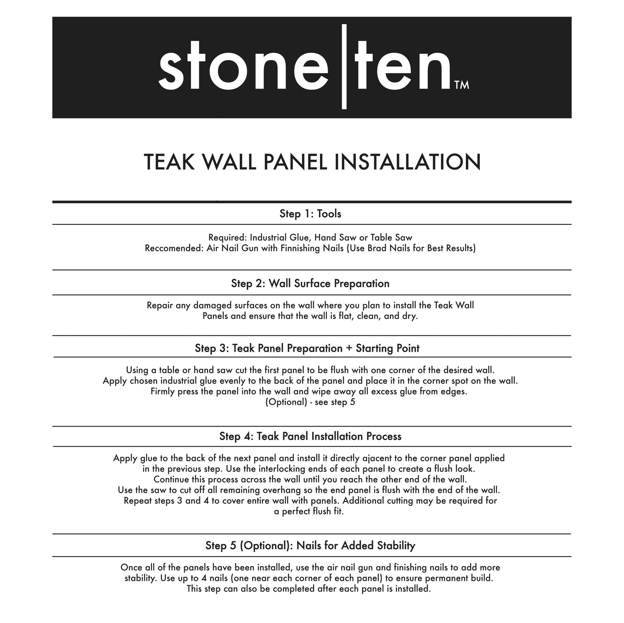 Teak Wall Panel Installation Tools Needed Required tools: Industrial Glue, Hand Saw or Table Saw Recommended tools: Air Nail Gun with Finishing Nails (Use Brad Nails for Best Results) Wall Surface Preparation Repair any damaged surfaces on the wall where you plan to install the teak wall panels and ensure that the wall is flat, clean, and dry. Teak Panel Preparation and Starting Point Using a table saw or hand saw cut the first panel to be flush with one corner of the desired wall. Apply chosen industrial glue evenly to the back of the panel and place it in the corner spot on the wall. Firmly press the panel to the wall and wipe away all excess glue from edges. Teak Panel Installation Process Apply glue to the back of the next panel and install it directly adjacent to the corner panel applied in the previous step. Use the interlocking ends of each panel to create a flush look. Continue this process along the wall until you reach the end of the wall. Use the saw to cut off all remaining overhang so the end of the panel is flush with the end of the wall.