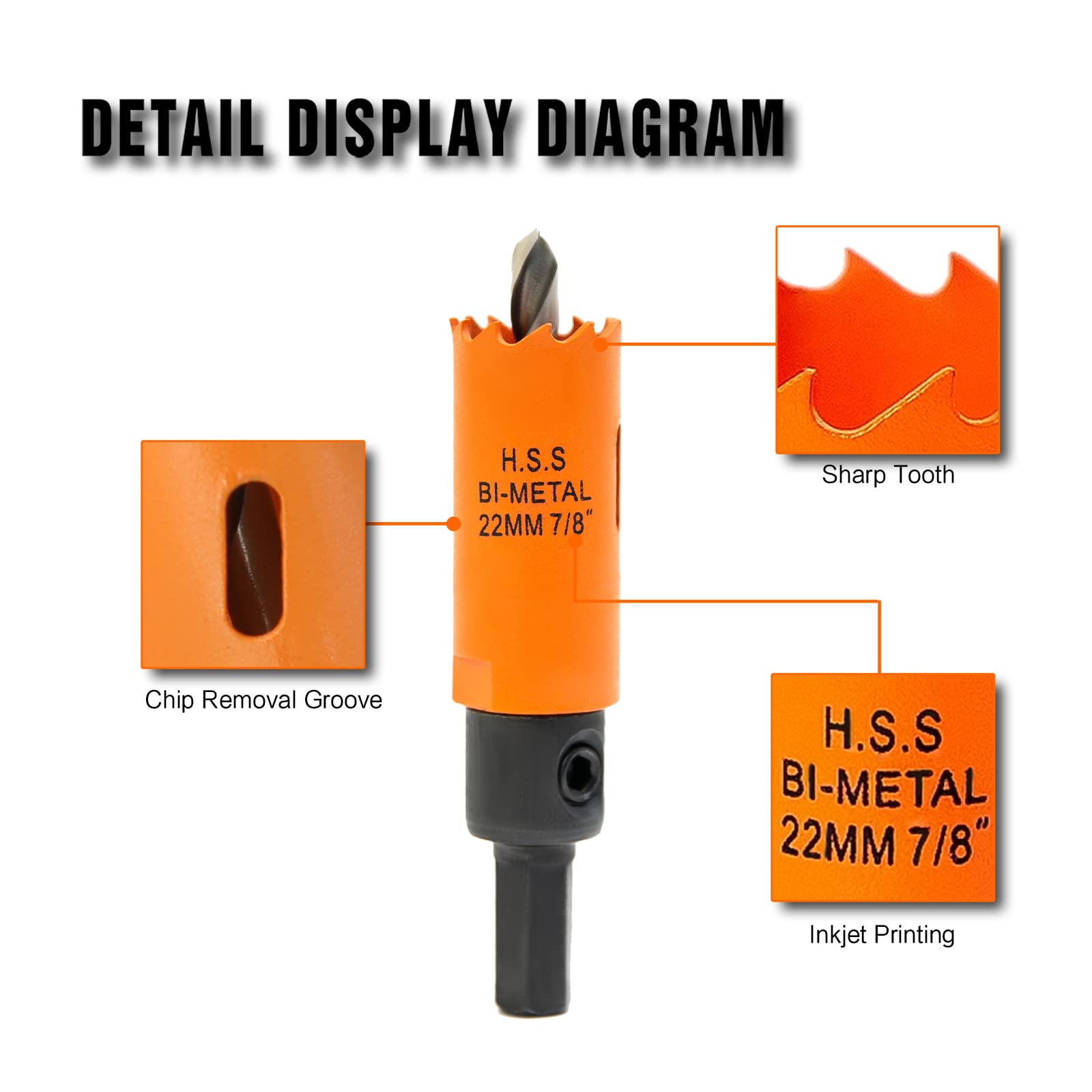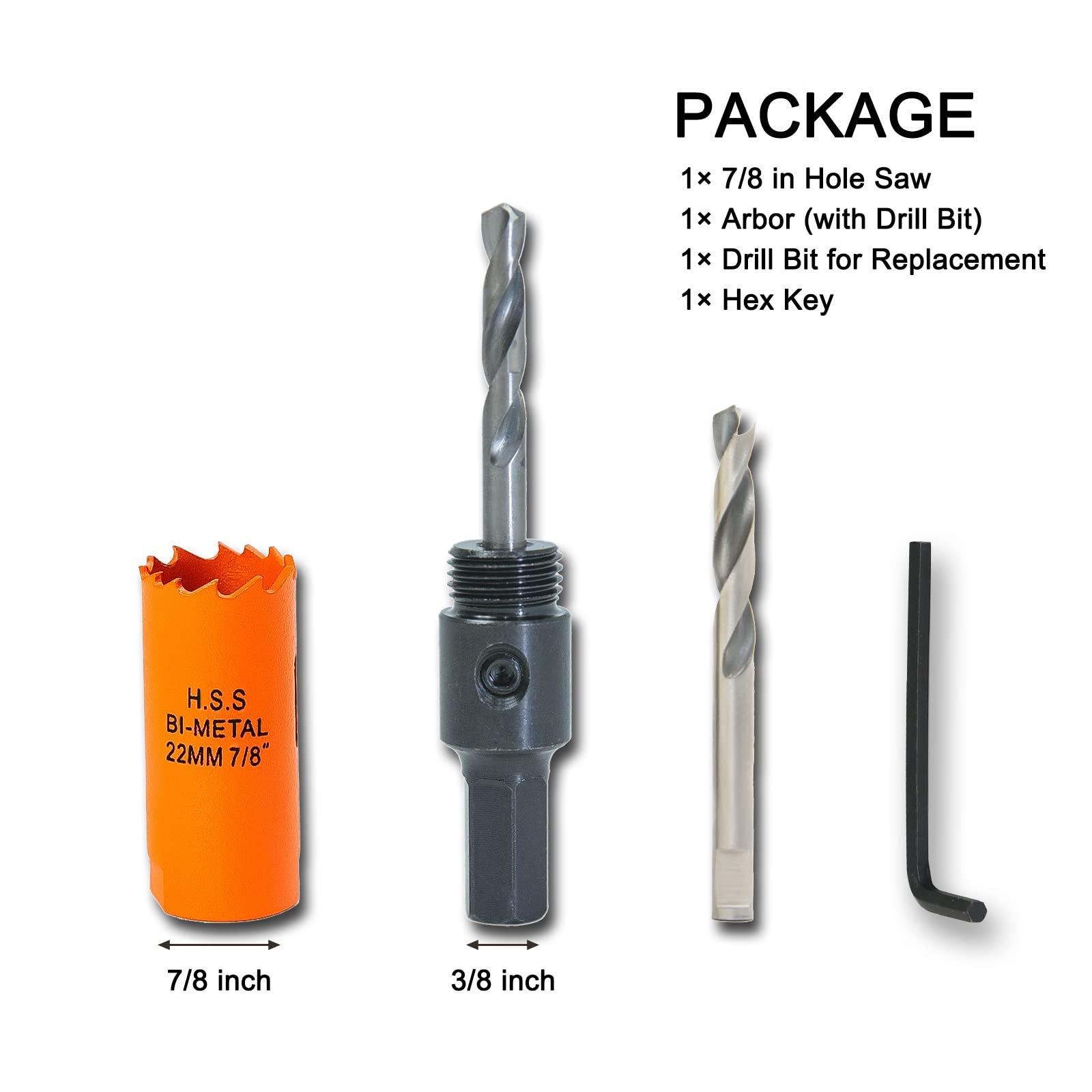 Tool Kit Includes: 7/8" hole saw, 1 pilot drill bit for replacement, 1 arbor(contain 1 drill bit), 1 hex key