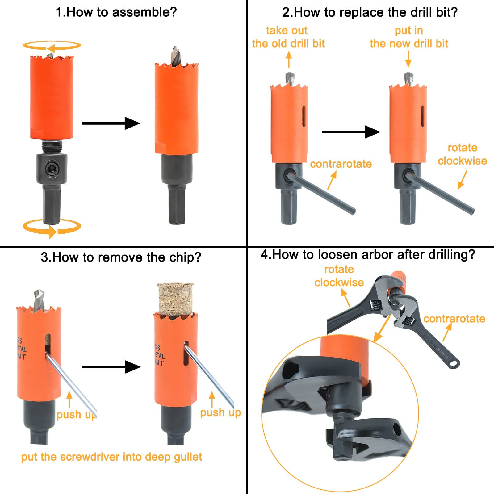Easy to Use: Pass the pilot drill bit on the connecting arbor through the center circular hole on the back of the hole saw, and rotate the connecting arbor until it is tightened.
