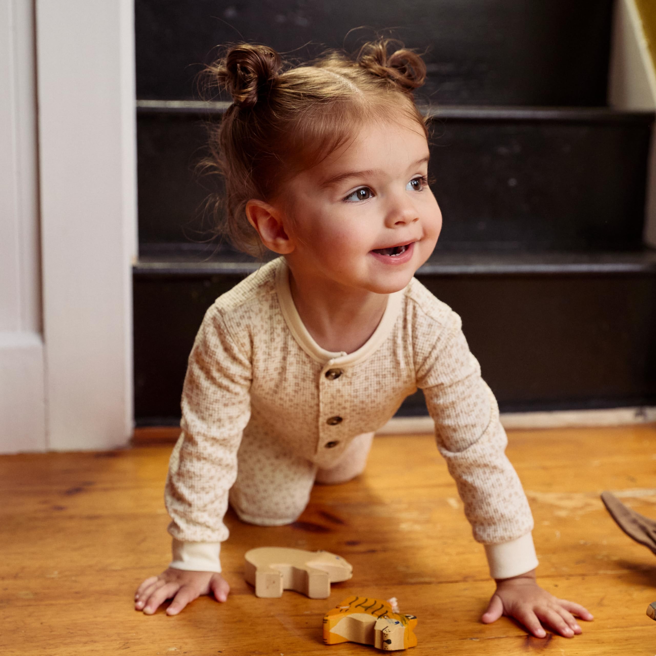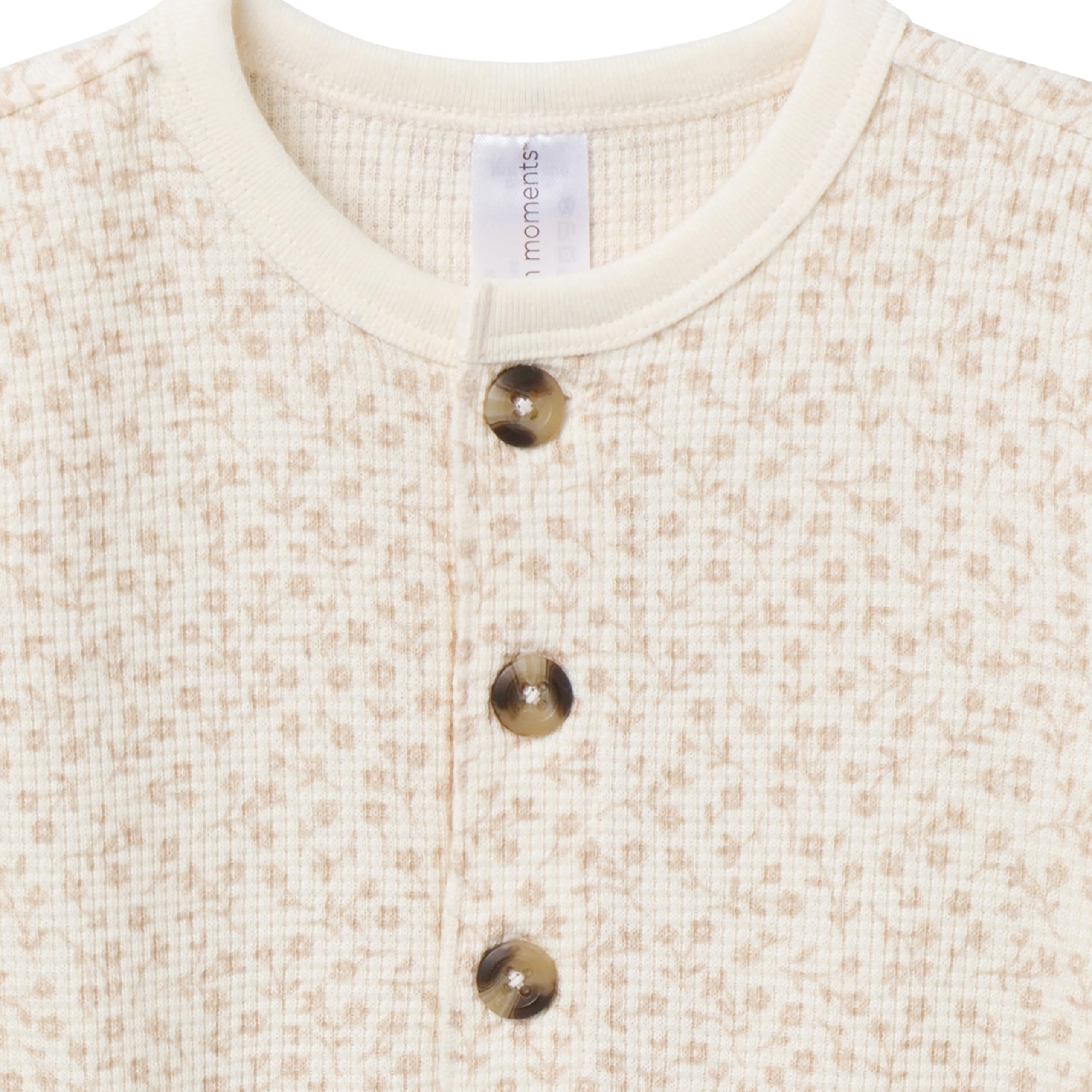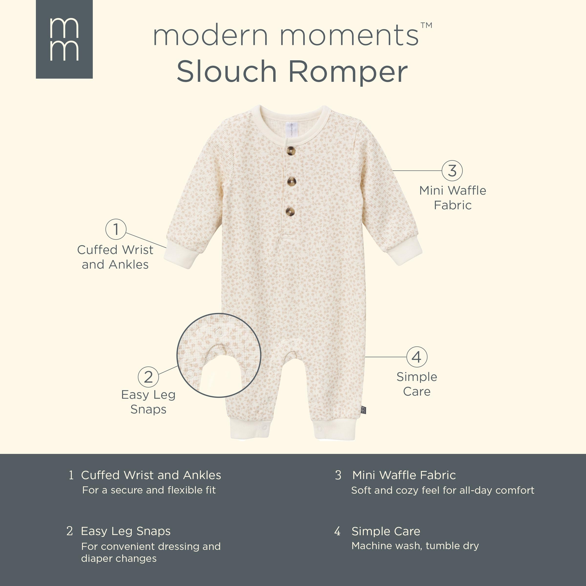 Description Made from warm and cozy mini waffle knit fabric, our baby or toddler romper is designed with both comfort and style in mind. Simple snaps make dressing and diaper changes easy, while the rounded, ribbed neckline provides extra comfort. To ensure a flexible fit for your active little one, stretchy ribbing at the ankles and wrists moves with them while at play. Finished with faux horn buttons for a touch of elegance, this romper is perfect for keeping your little one snug and fashionable all day long.
