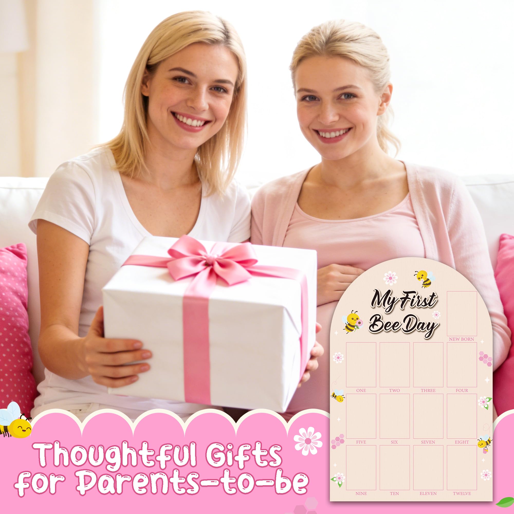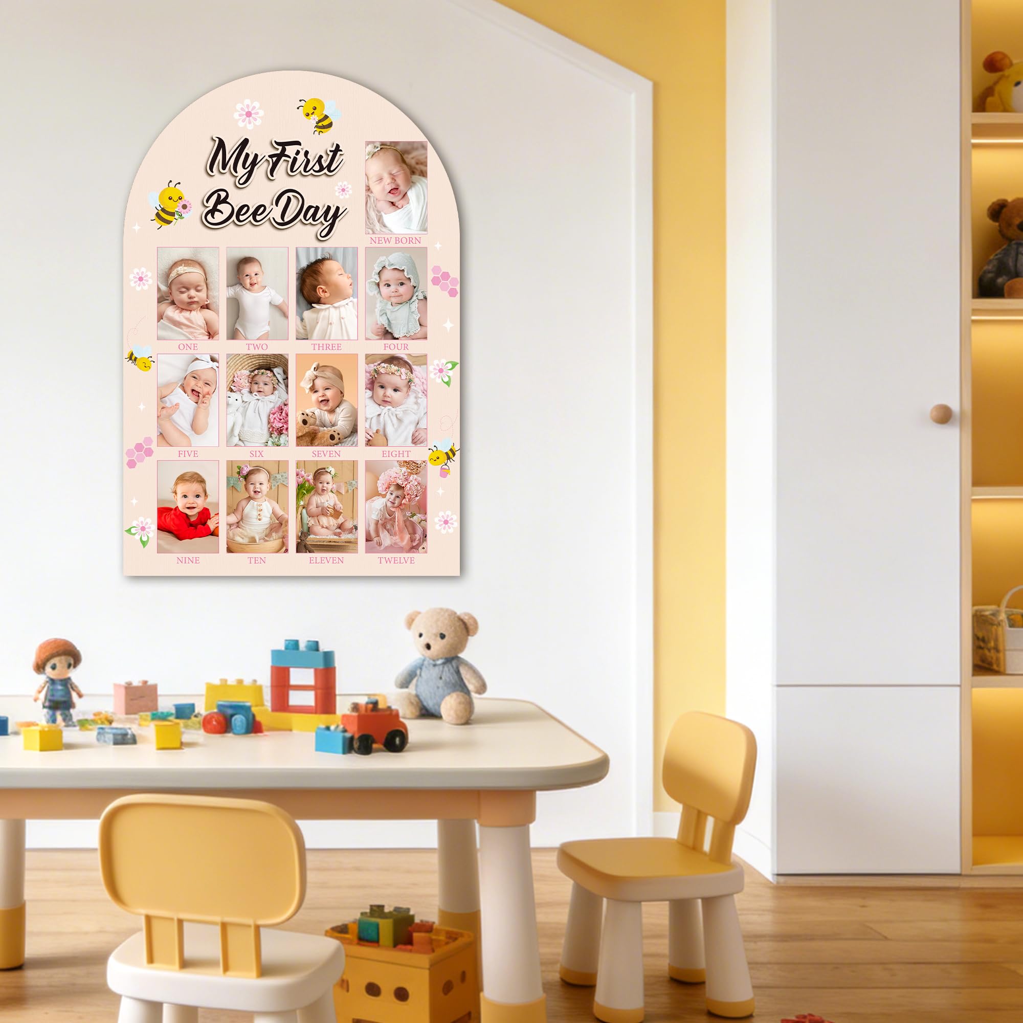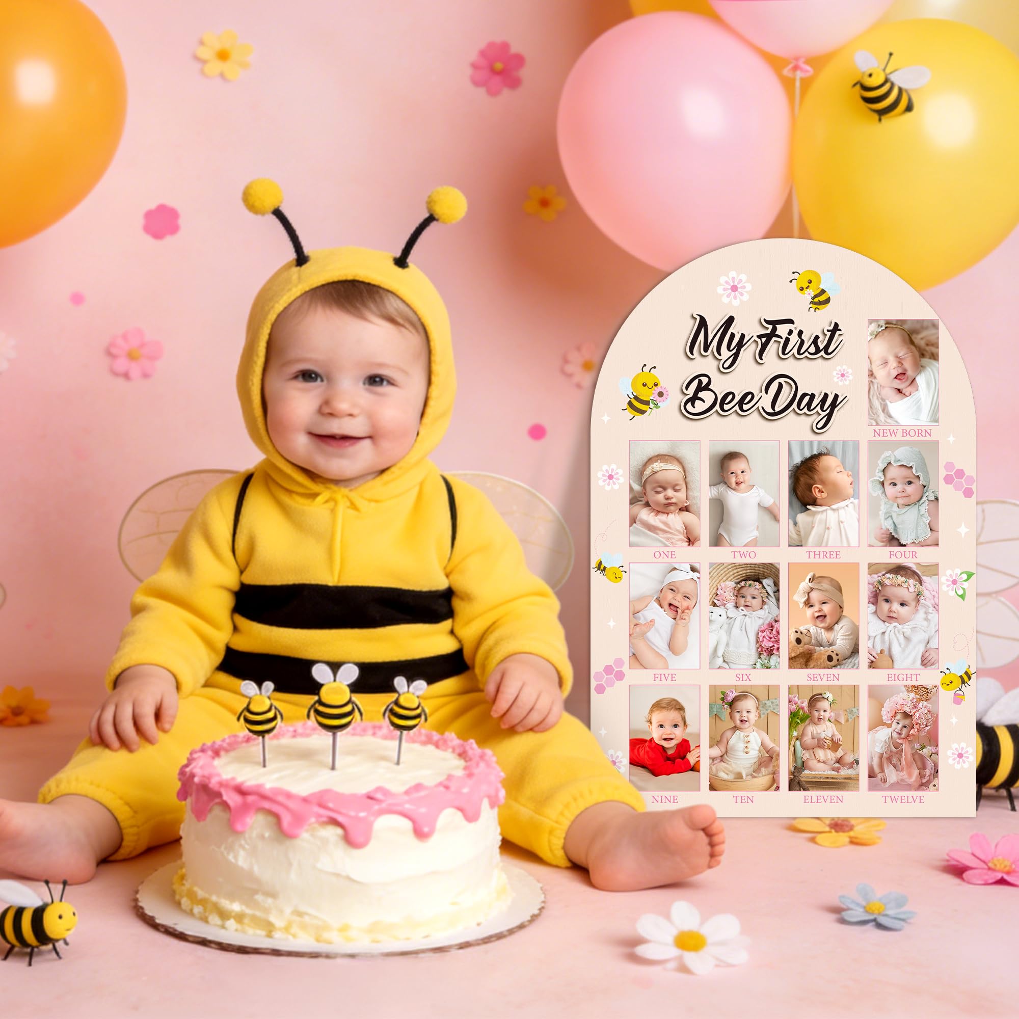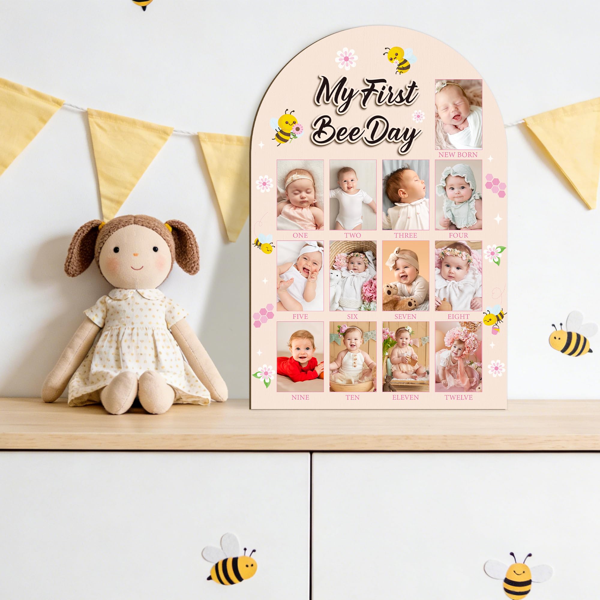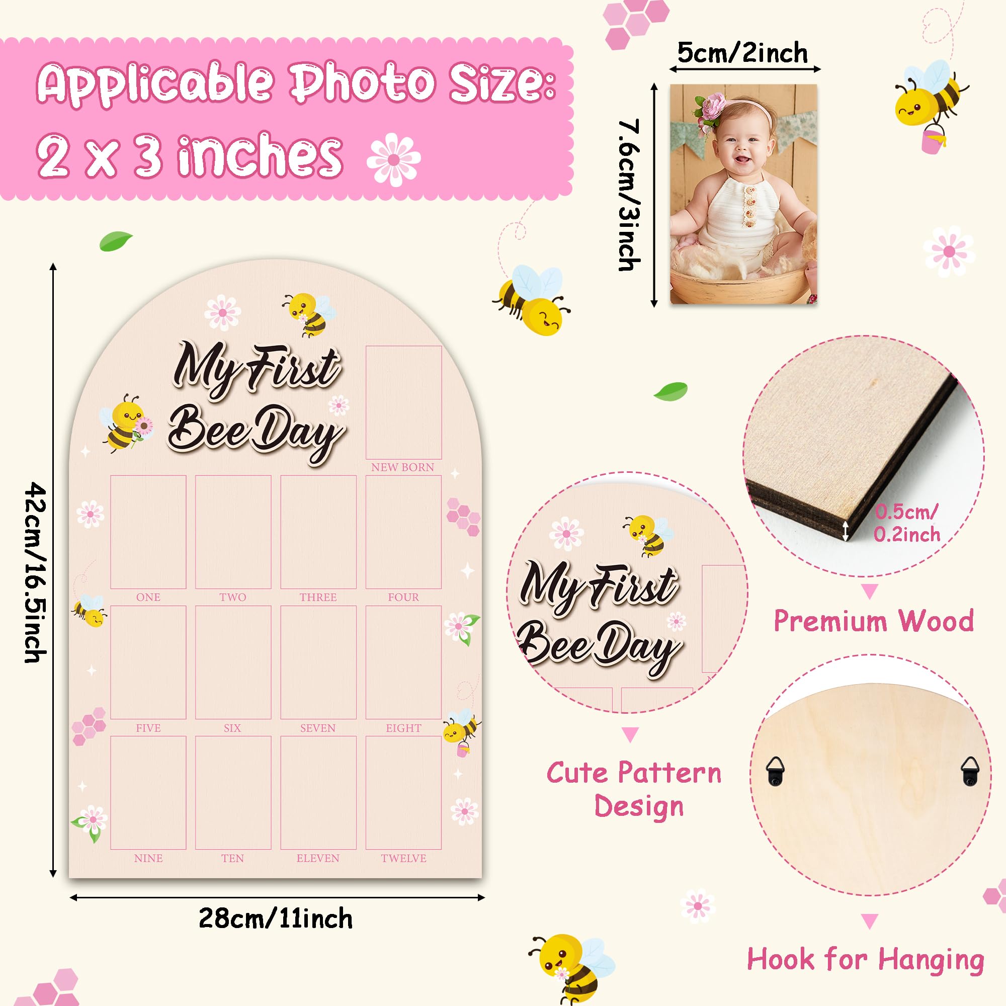 My First Year Photo Frame: You will receive a first year photo happy my 1st bee day themed display board measuring approximately 16.5 x 11 inches, featuring 3 x 2 inches spaces designed for you to affix images of your baby from months one to twelve.