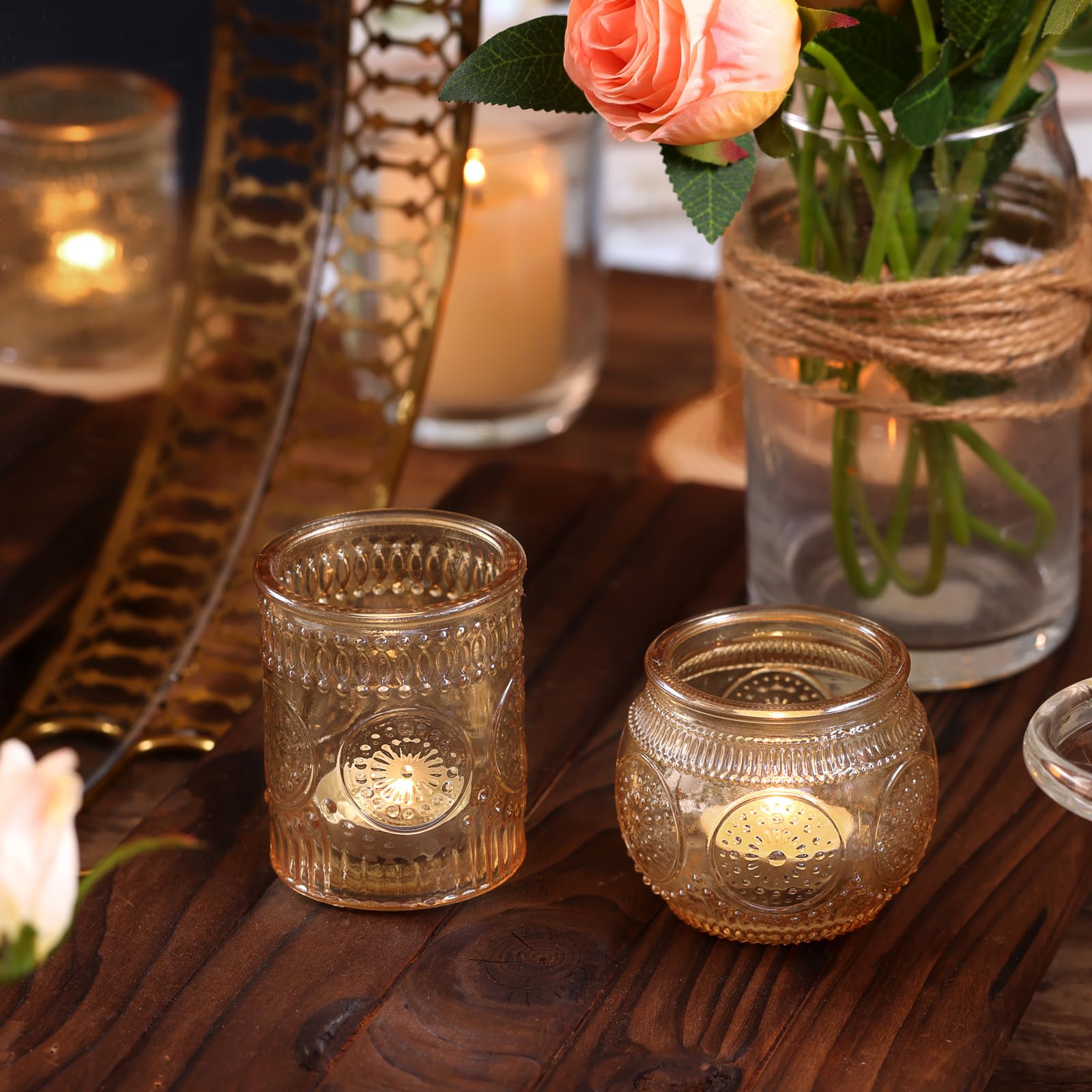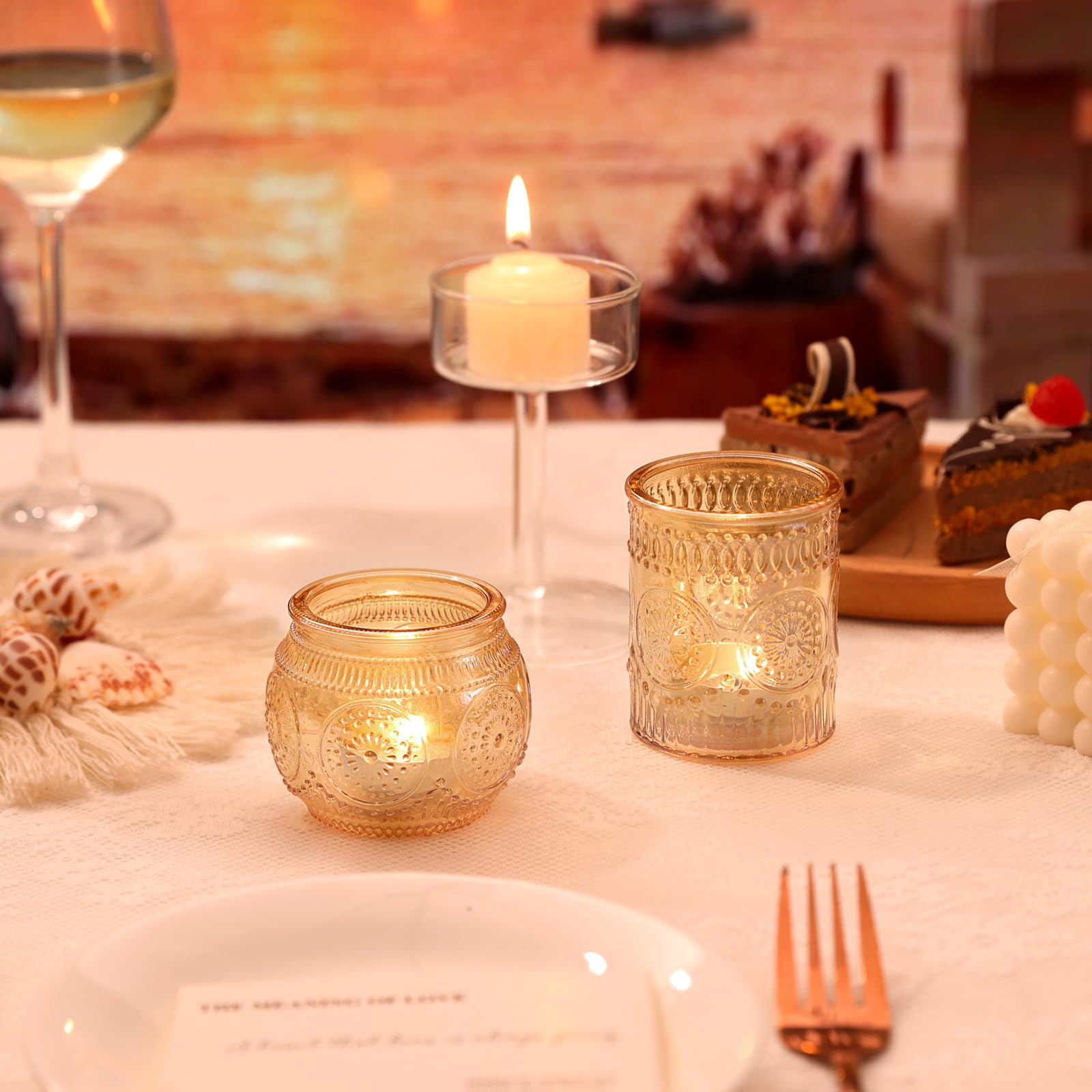 ❤️❤️[ Votive Candle Holders Set ]❤️❤️: You will get 24 pack gold votive candle holders in your package, including 12 glass votives and 12 bowl glass votives.The dimensions are 2.1ʺD x 2.56ʺH and 2.1ʺD x 2.1ʺH approximately. These glass votive candle holders are the perfect complement to any dining table, which can be used with regular votive candles, tea light candles, flameless LED tea waxes, and edible butter candles, creating a warm and inviting ambiance that enhances the dining experience.
