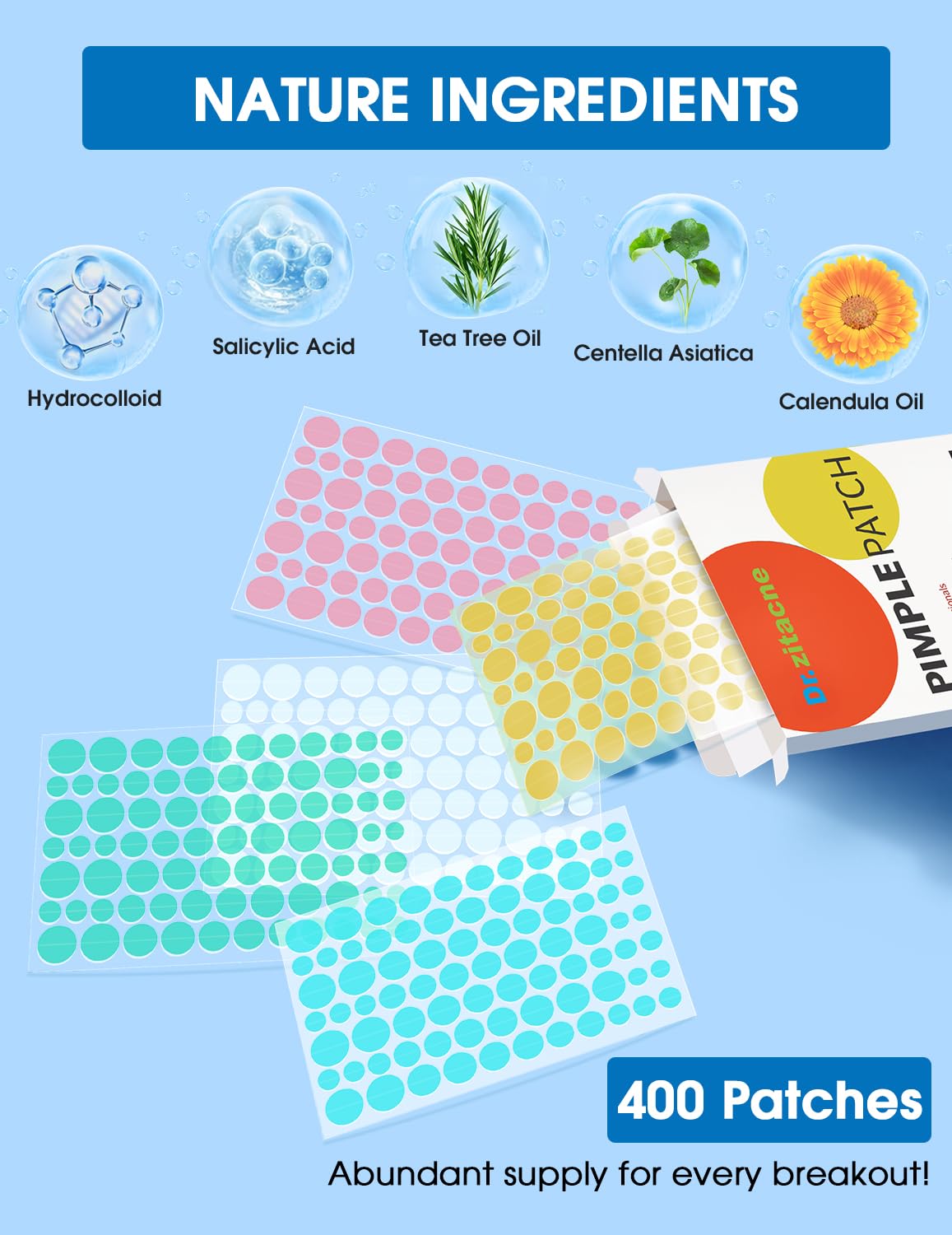 β [400 Pack with 5 Colors and 6 Sizes]: Dr. Zitacne offers a variety of colors and sizes in their 400-patch pack, catering to different preferences and blemish sizes. Choose from 5 colors β transparent, blue, yellow, green, and pink β and 6 sizes: 7mm (6pcs) 8mm (21pcs) 10mm (14pcs) 11mm (14pcs) 12mm (17pcs) 14mm (8pcs) The transparent patches are perfect for formal settings, while the colorful options are great for casual occasions.
