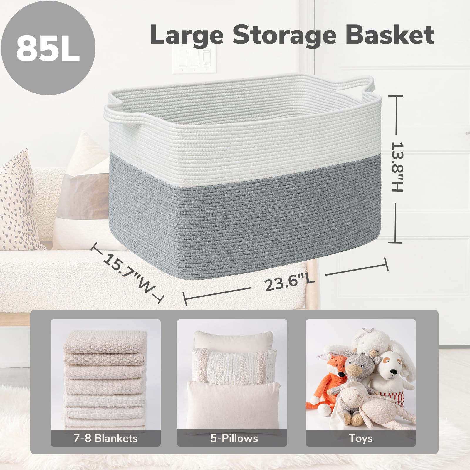 Spacious & Versatile: Measuring 23.6"L x 15.7"W x 13.8"H with a 85L capacity, this large woven basket is perfect for storing blankets, pillows, clothes, towels, toys, and more in the living room, helping you maintain a tidy living space