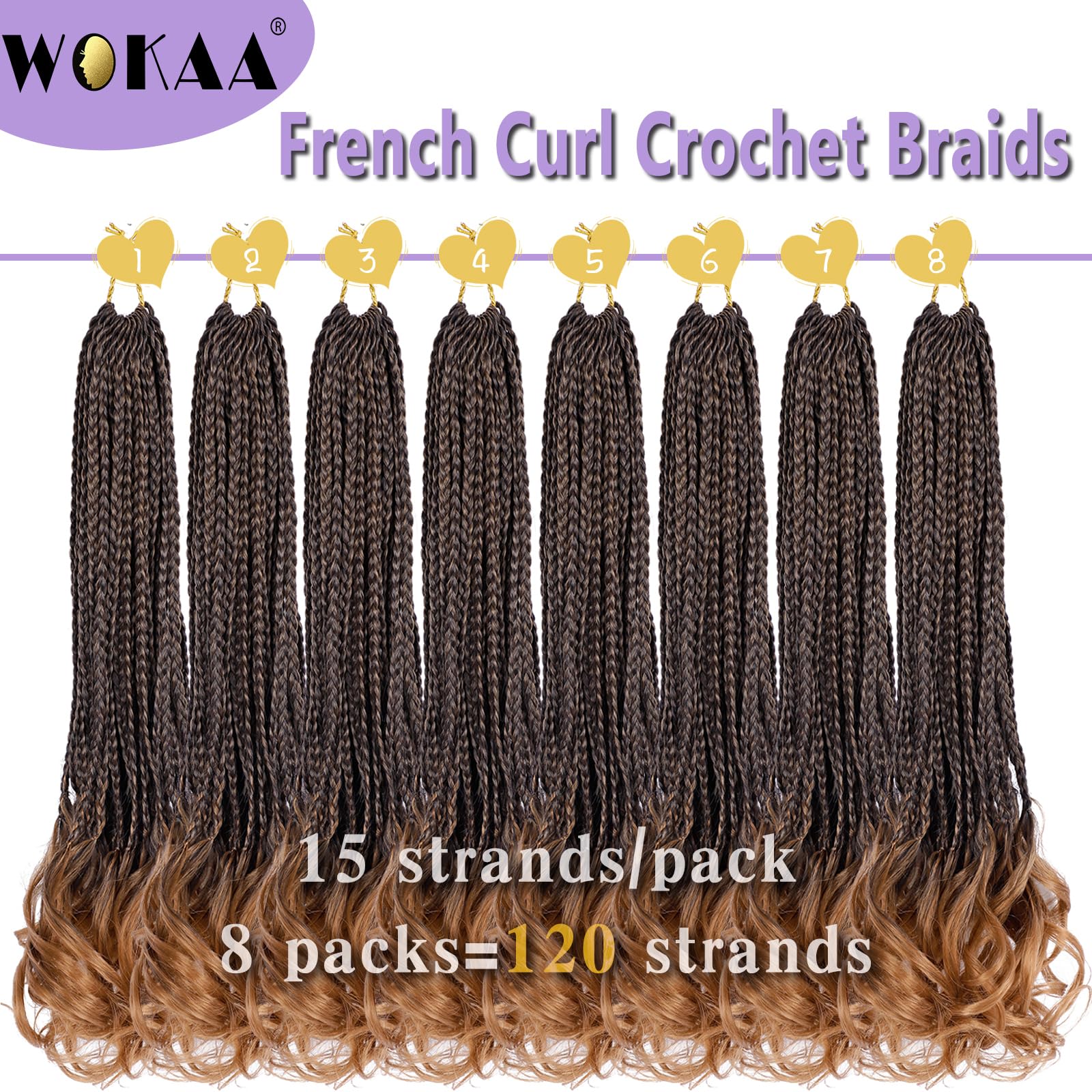 WOKAA French Curl Crochet Braids is braided by french curly braiding hair, a popular protective hairstyle. Hand-made crochet box braids, super soft & light weight, good texture & natural looking, skin friendly, no tangle, no shedding, no smell. Easy to install, beginners friendly.