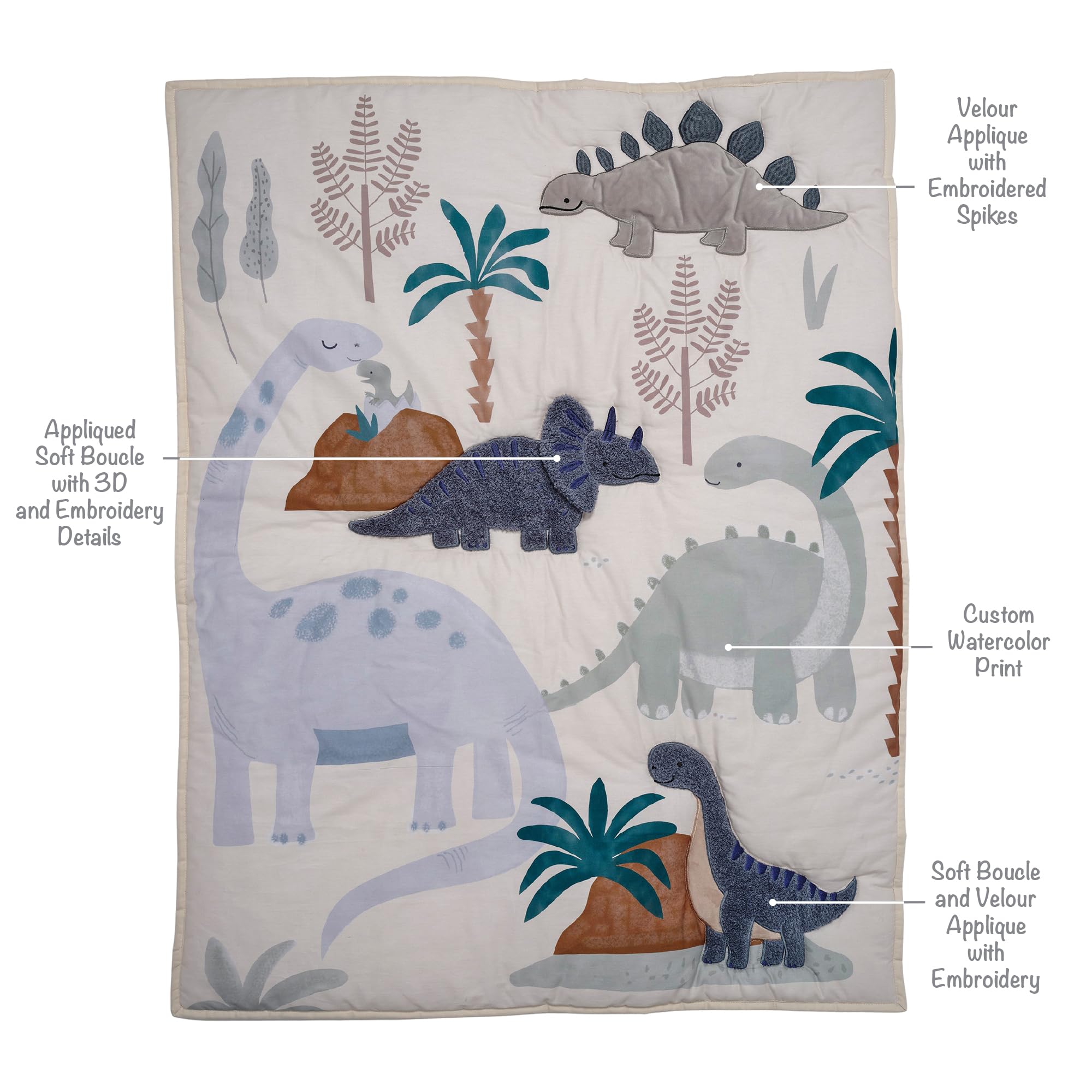 Your little one will drift off to dreamland with their favorite prehistoric creatures playing hide and seek among ancient trees and Jurassic rocks. This 3 piece dinosaur themed crib bedding set includes one quilt, one 100% cotton fitted crib sheet, and one crib skirt. The quilt is on a creamy white ground that is made of pure cotton twill. Several of the dinos are appliqued in gray and blue velour and soft textured boucle. The watercolor style printed fitted crib sheet features multi colored dinos and has elastic all the way around ensuring a safe and secure fit on a standard size crib mattress measuring approximately 52 inches by 28 inches. The crib skirt adds the finishing touch to your childβs room and features a long appliqued dino tail in blue boucle fabric.