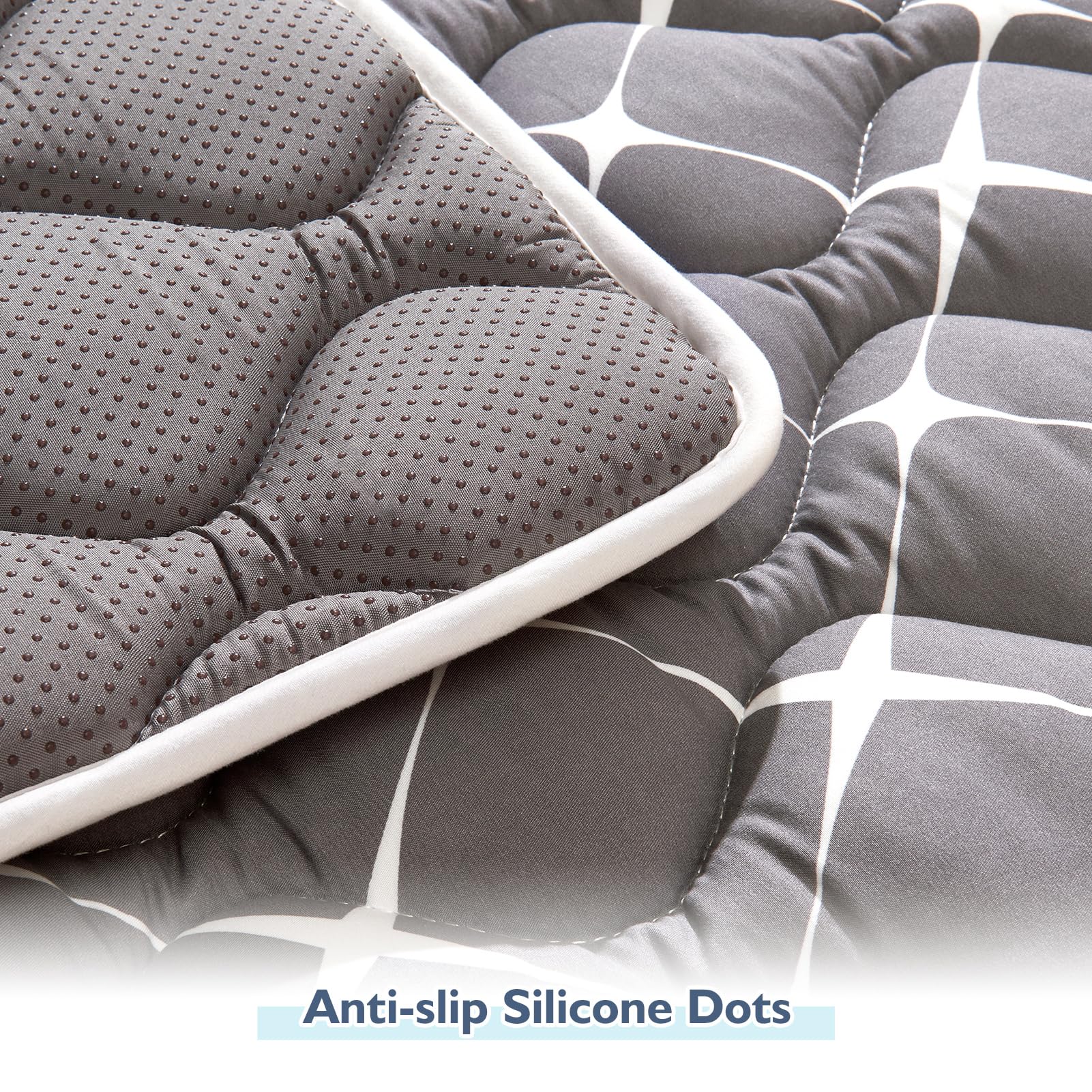 【Non-slip, thick and comfort】 The back side of the 50x50 play mat for made of anti-slip material, and the bottom backing is silicone dots. It is thicker than other play mat. It prevents babies from causing pain when they fall or bump.