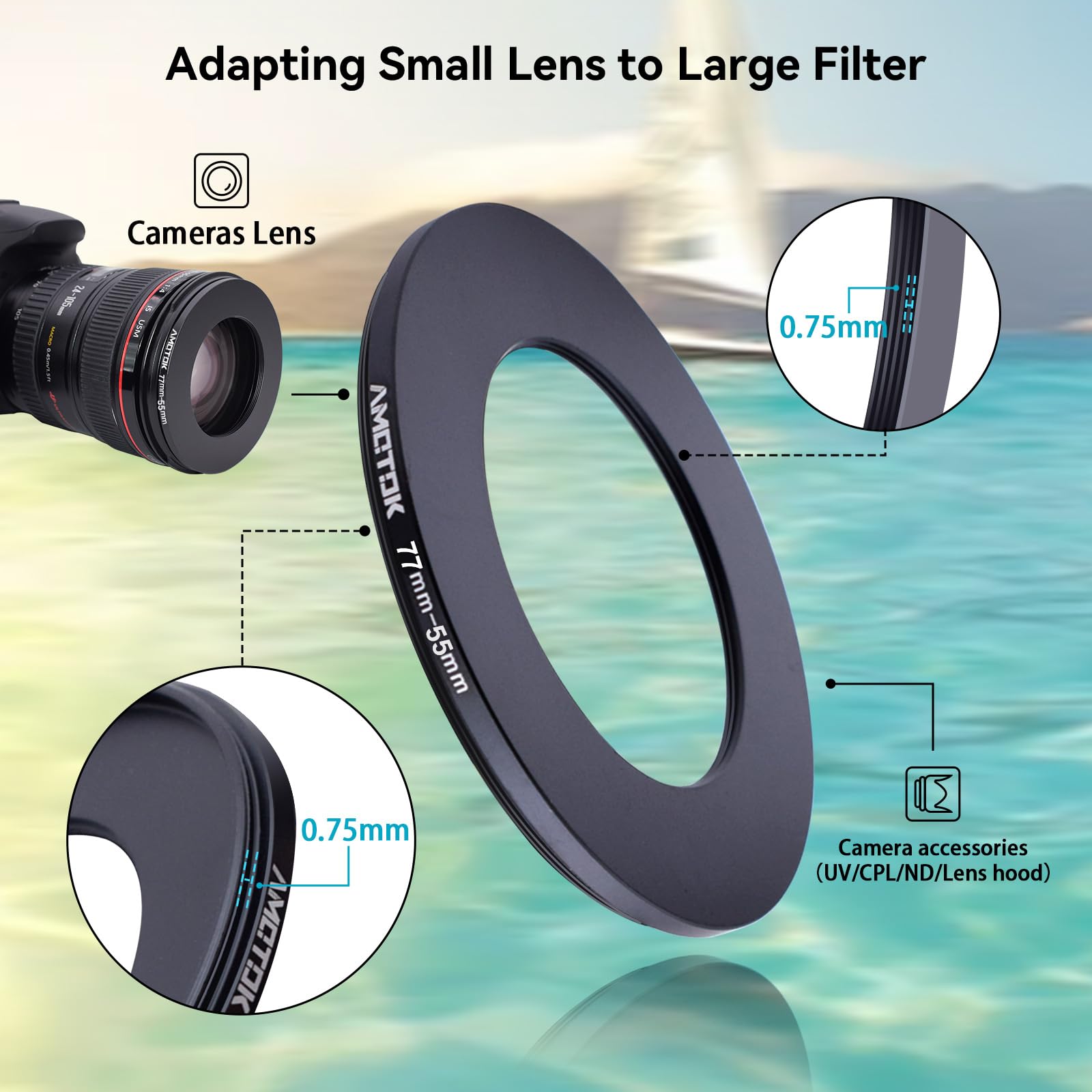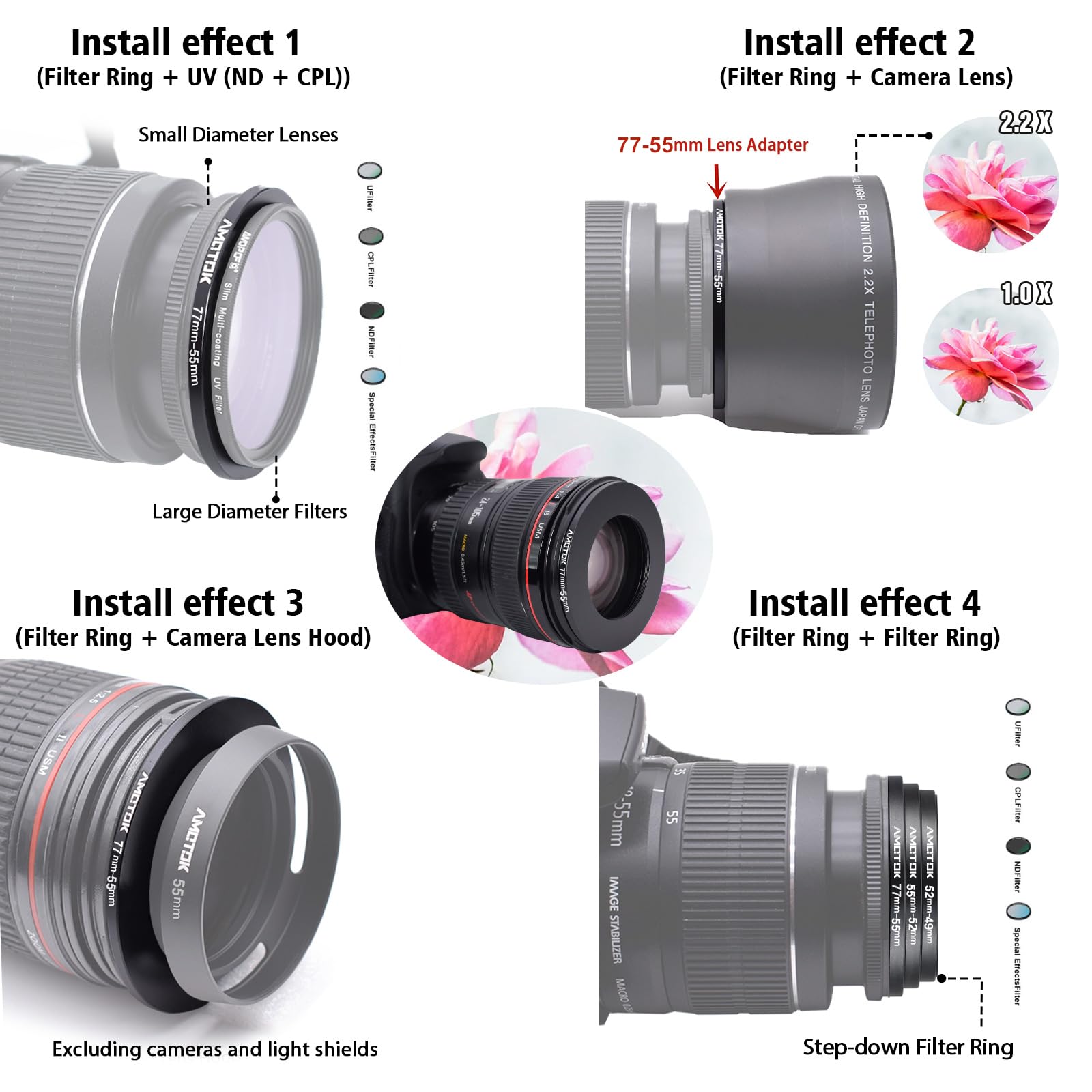 【2】AMOTOK The ring adapter easily screws onto the front of any 77mm lens,and converts the thread size of your lens to the thread size of any other 55mm accessory(such as filters,hoods,flashes and lens converters),and other 55mm accessories.