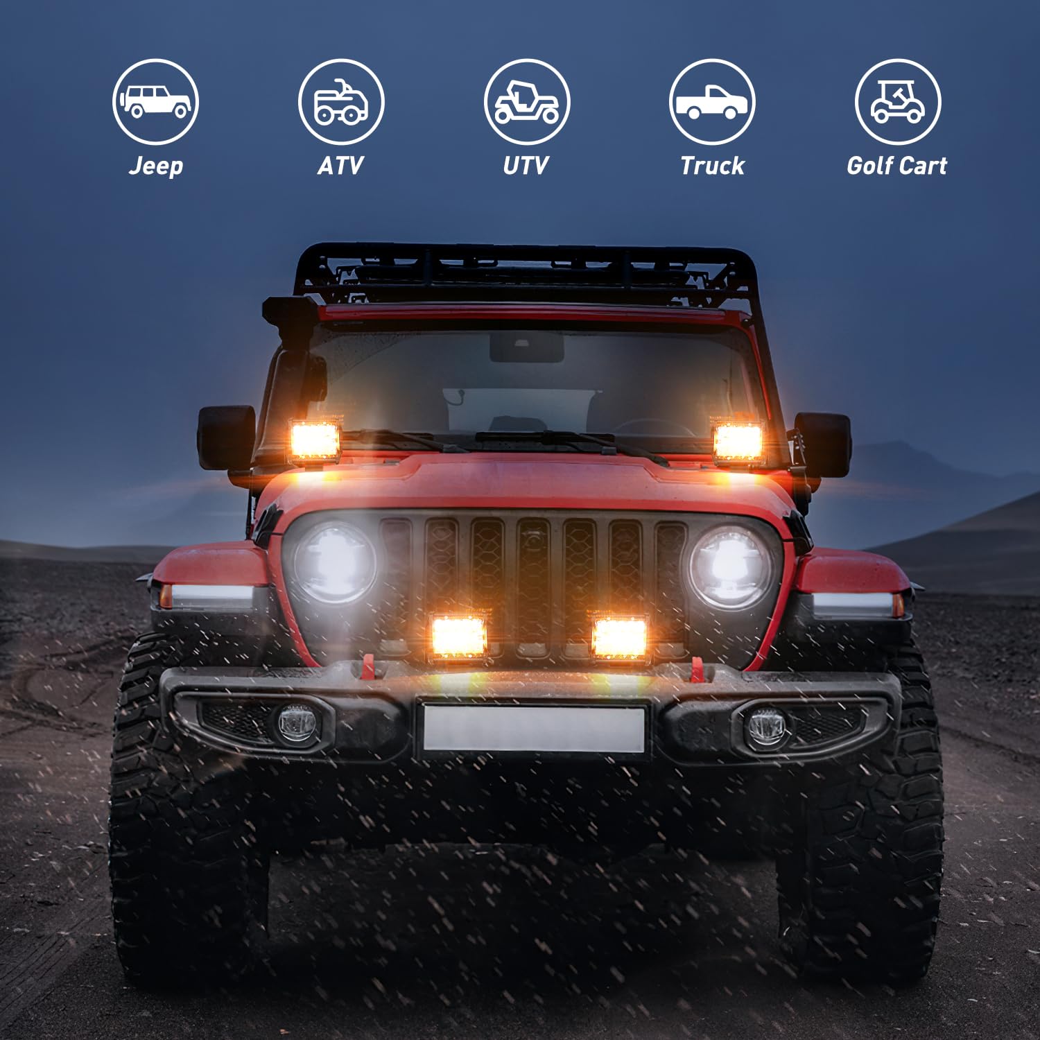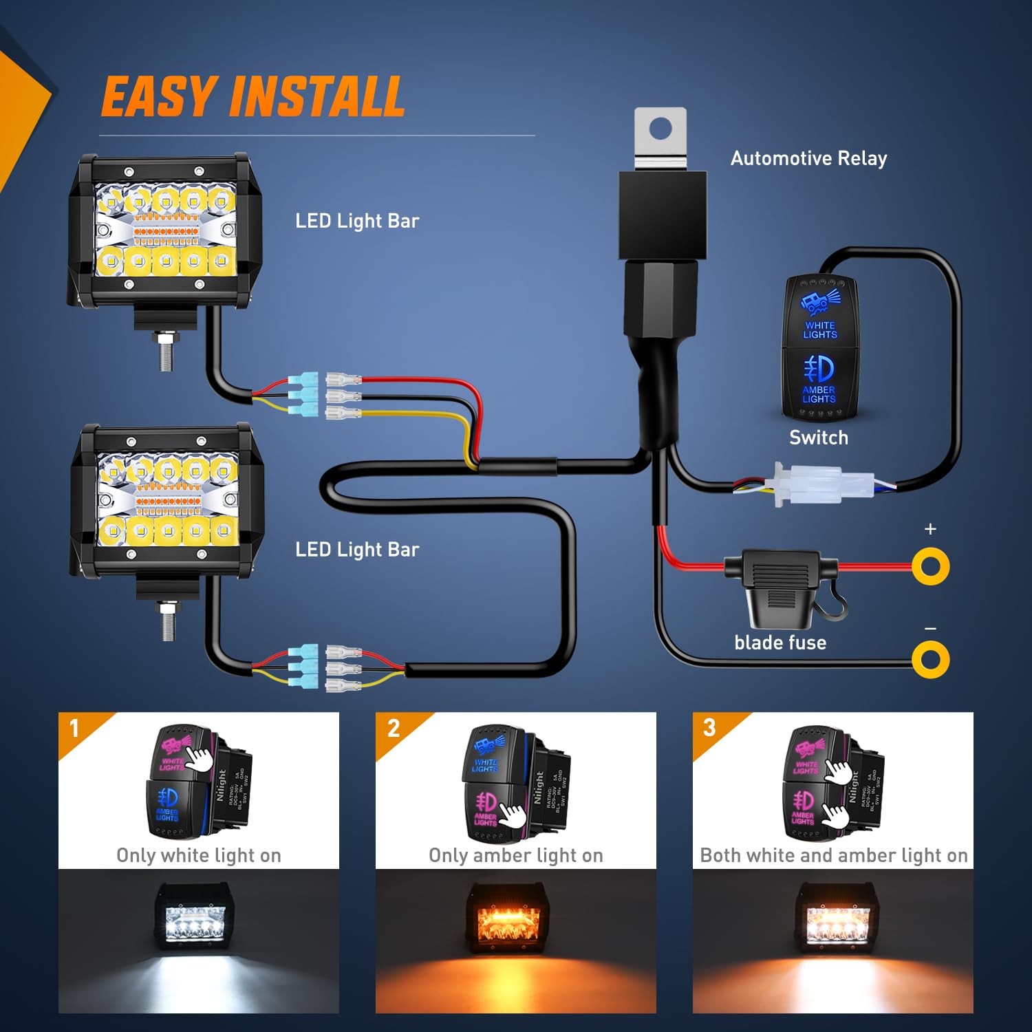 Perfect combo beam: High-power white & amber LEDs pair far-reaching spotlight and wide floodlight for brighter, longer illumination. 3 modes (White/Amber/White+Amber) fit night drives, off-road trails, or fog—keeps you visible and safe in any situation