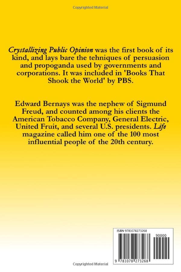 Written by the nephew of Sigmund Freud and named by PBS as one of its 'Books That Shook the World', Crystallizing Public Opinion was the first book ever written about the public relations industry. It gives a fascinating and frightening glimpse into the world of propoganda and advertising, and shows how ideas as different as eating bacon for breakfast and preferring women to be thin were put into our heads. Edward Bernays was named as one of the 100 most influential Americans of the 20th Century by Life magazine. With his view that the public are irrational and behave like herds of animals, he outlines here techinques to control the masses in whatever way the influencer chooses. He counted among his clients the American Tobacco Company, several U.S. presidents, and the opponents of the Guatemalan revolution.