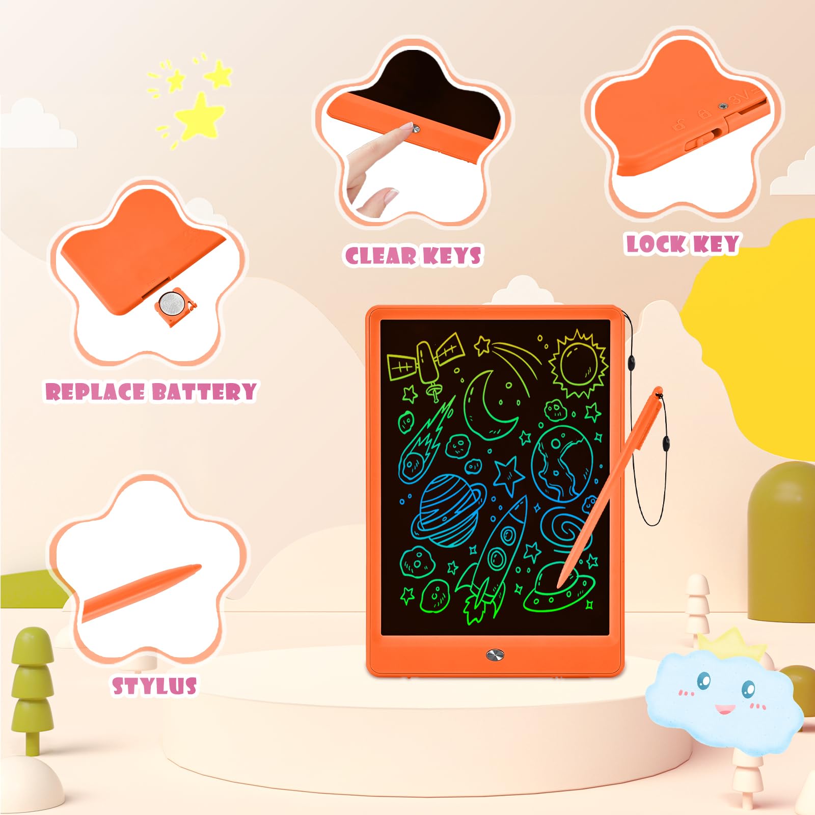 Reusable Kids Drawing Pad: The battery of the drawing board has long battery life, can be replaced for cycle use, without charging or plugging in power. The drawing pad toys can work quite a while with tens of thousands of erasing, avoid waste of paper and pencils
