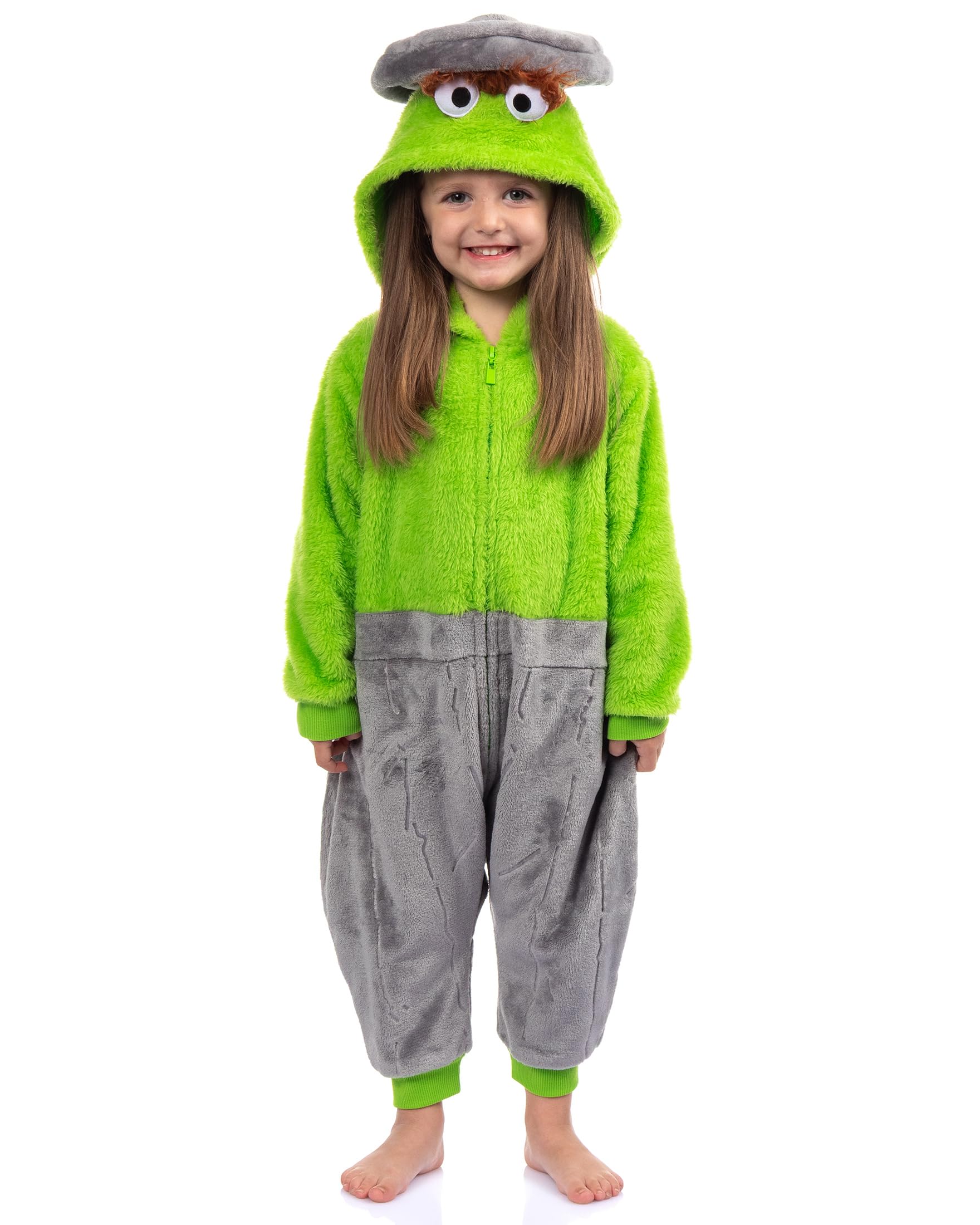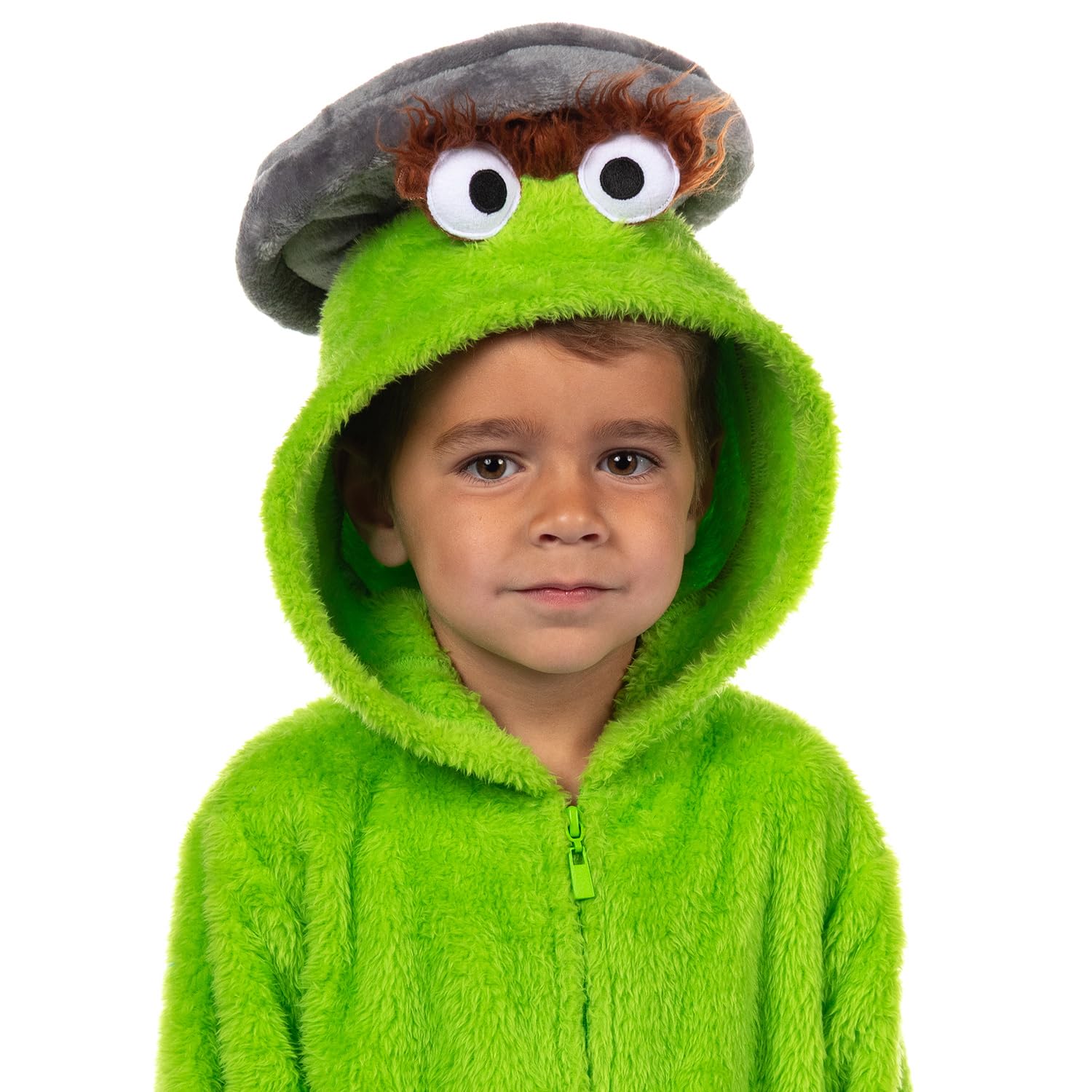 Description Bring Sesame Street fun to your toddler's wardrobe with this Oscar the Grouch hooded one-piece pajama. The top half features Oscar's bright green fur, while the legs resemble his trash can home, complete with cuffed ankles for a secure fit. On the hood, embroidered eyes, fluffy eyebrows, and a soft trash can lid complete the playful look. The fleece material keeps little ones warm without overheating, and the footless design allows for free movement. Oscar the Grouch has been a Sesame Street favorite for decades, and he is loved for his humor and unique personality. This toddler union suit captures his character in cozy, wearable form, making it an excellent option for lounging, naptime, or imaginative play.