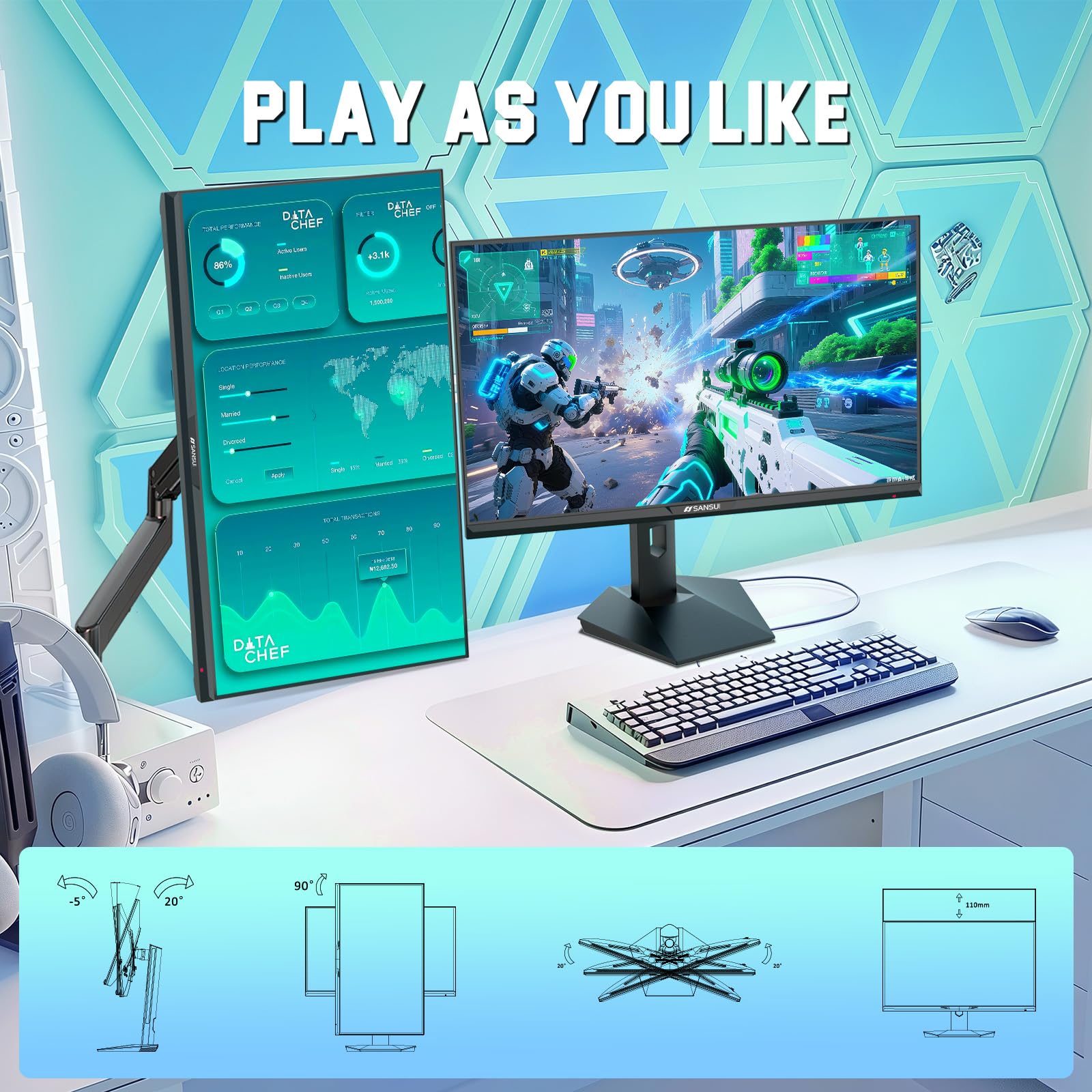 Ergonomic Stand: Pivot/Swivel/Height:-90°~+90°/L25°~R25°/0~130mm丨Tilt / Kensington Lock:-5°~20°(+/-2°) / Yes丨VESA Compatible (100x100mm)