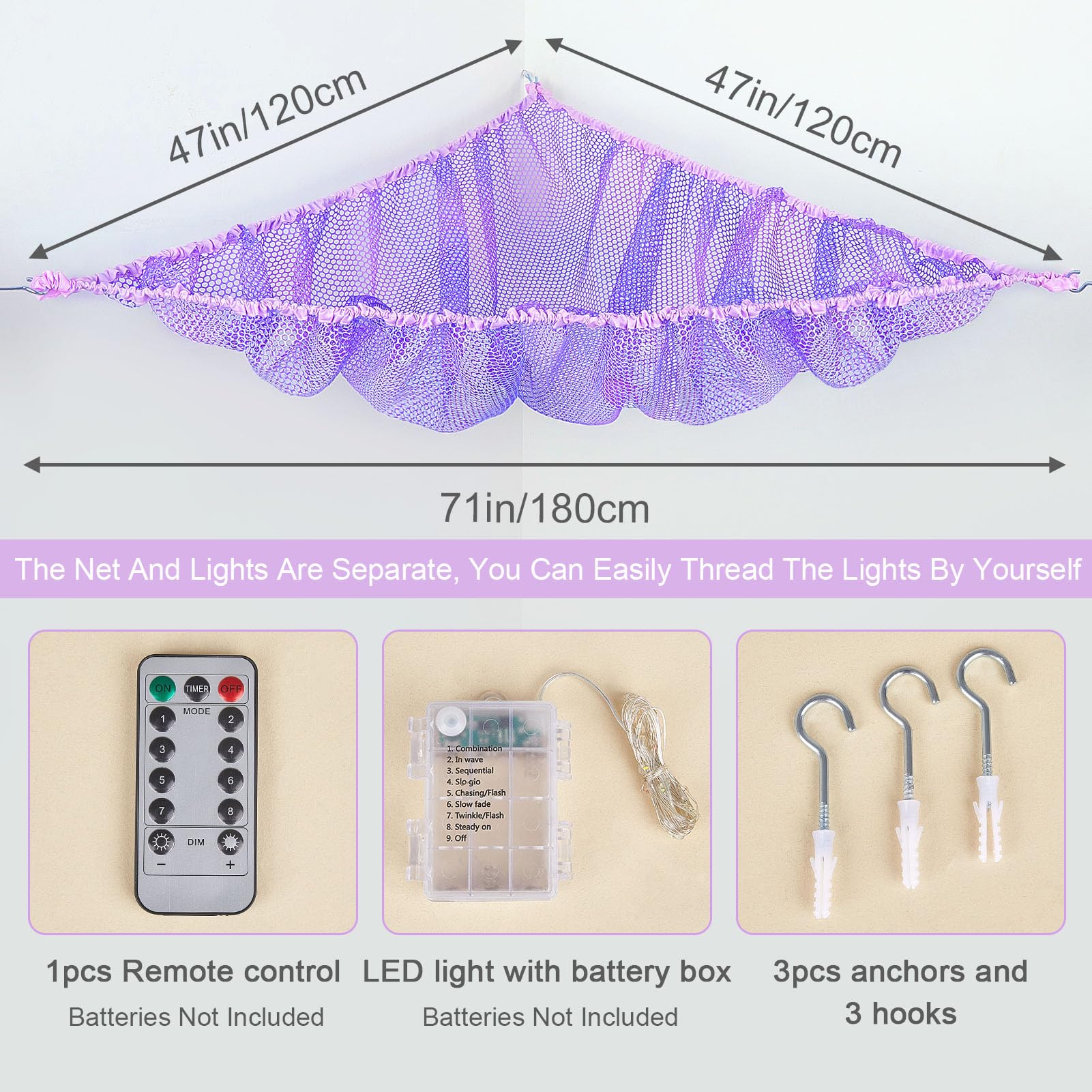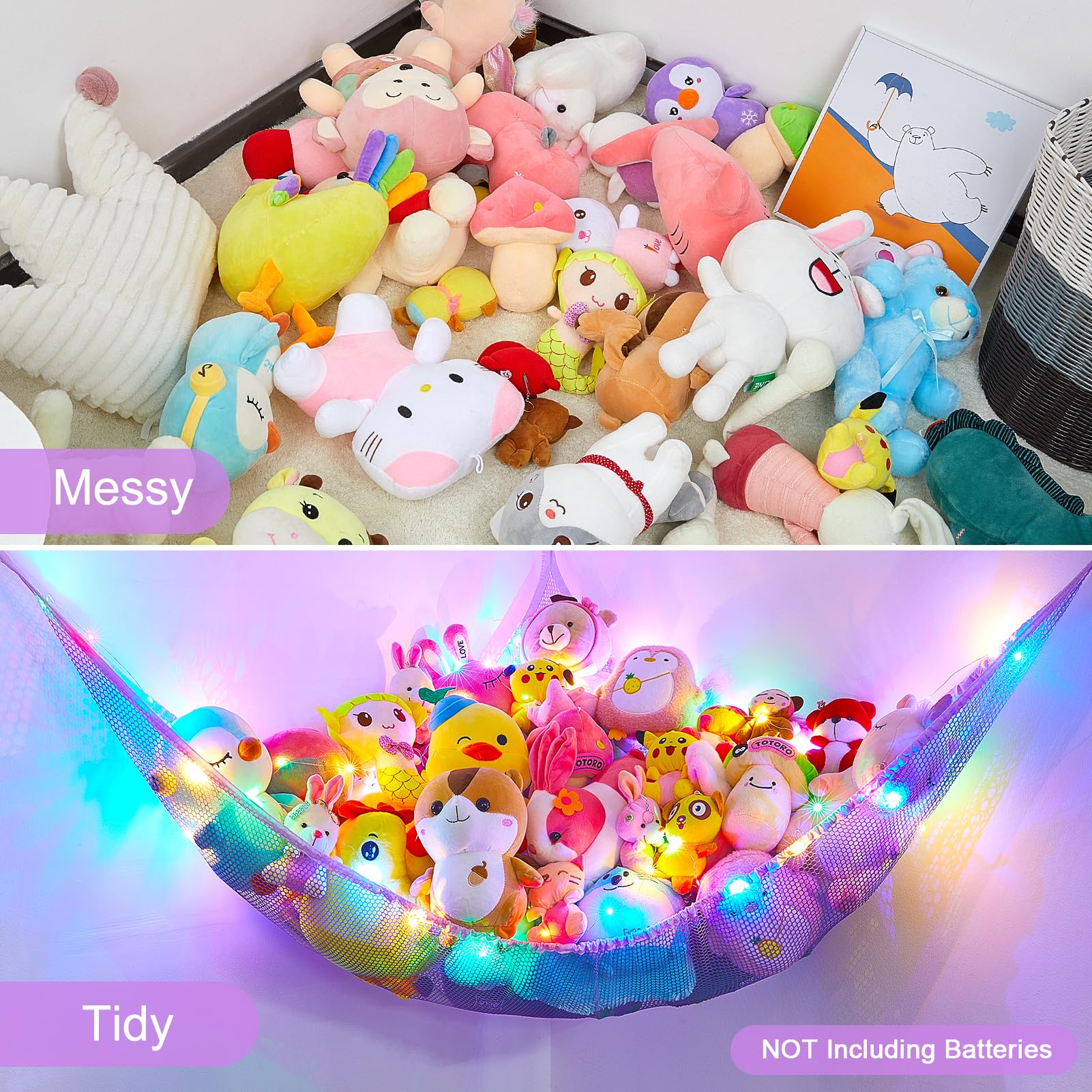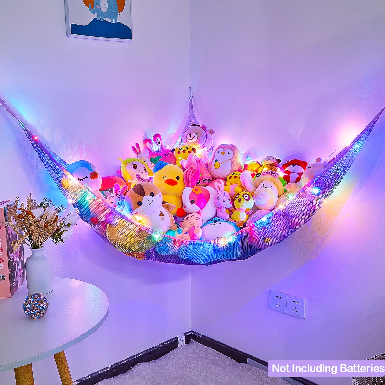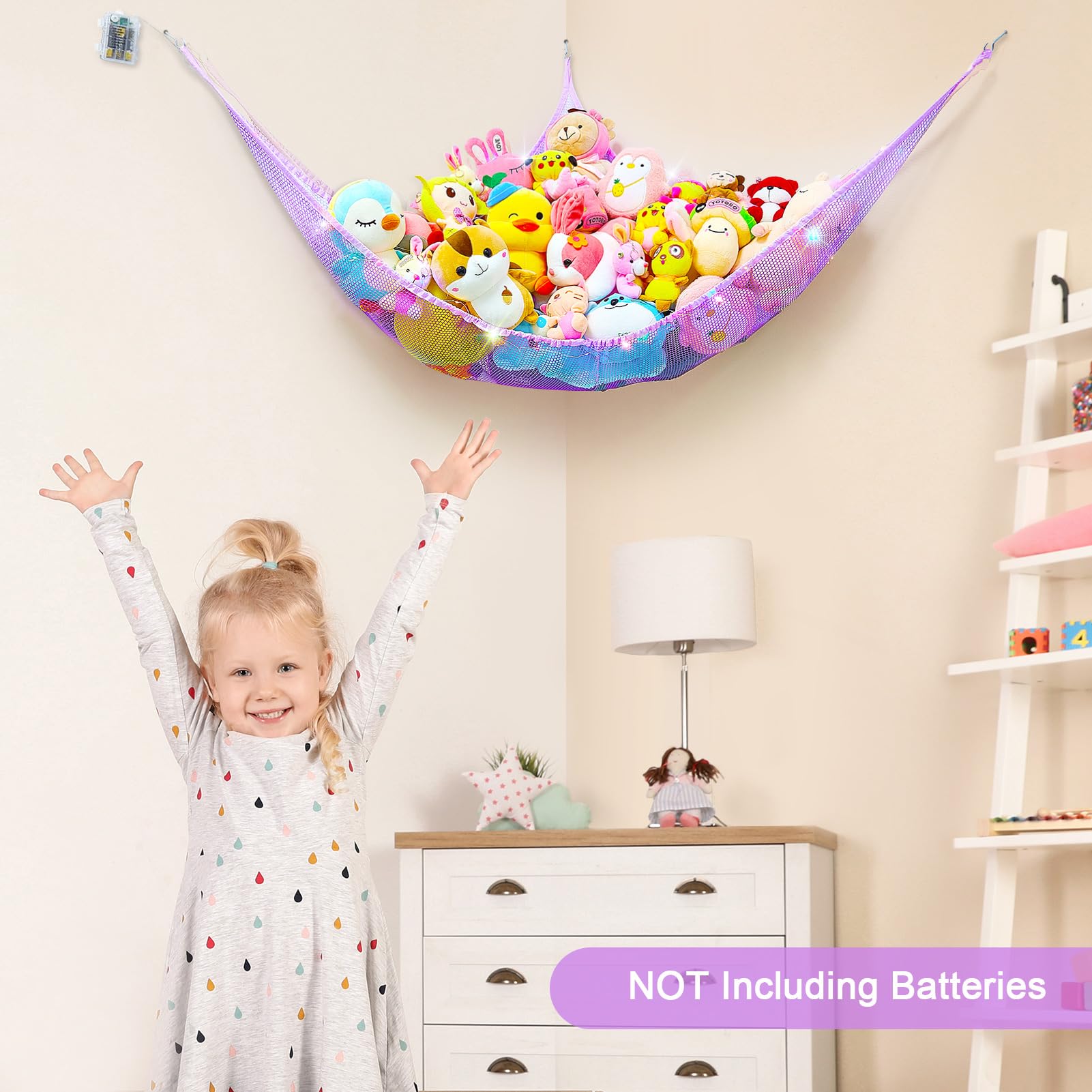 Package Included: 1pcs stuffed animal hammock, 1pcs 118 inches LED string light with battery box; Batteries not included; 3 pcs wall hooks for installation