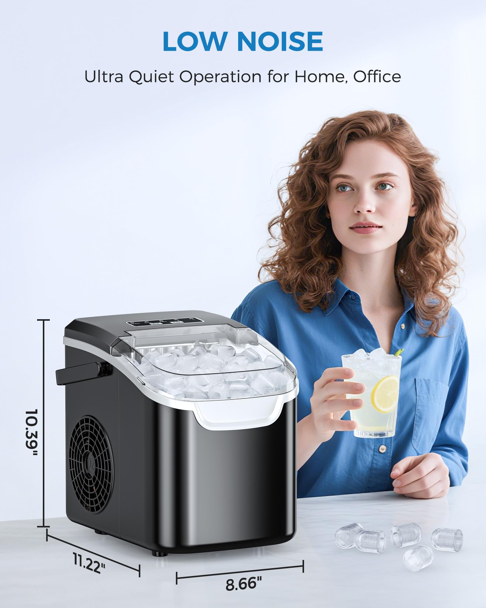 Portable and Space-Saving: This ice maker has a compact design and comes with a handle, making it easy to carry. The ice maker weight is 11.75 pounds.