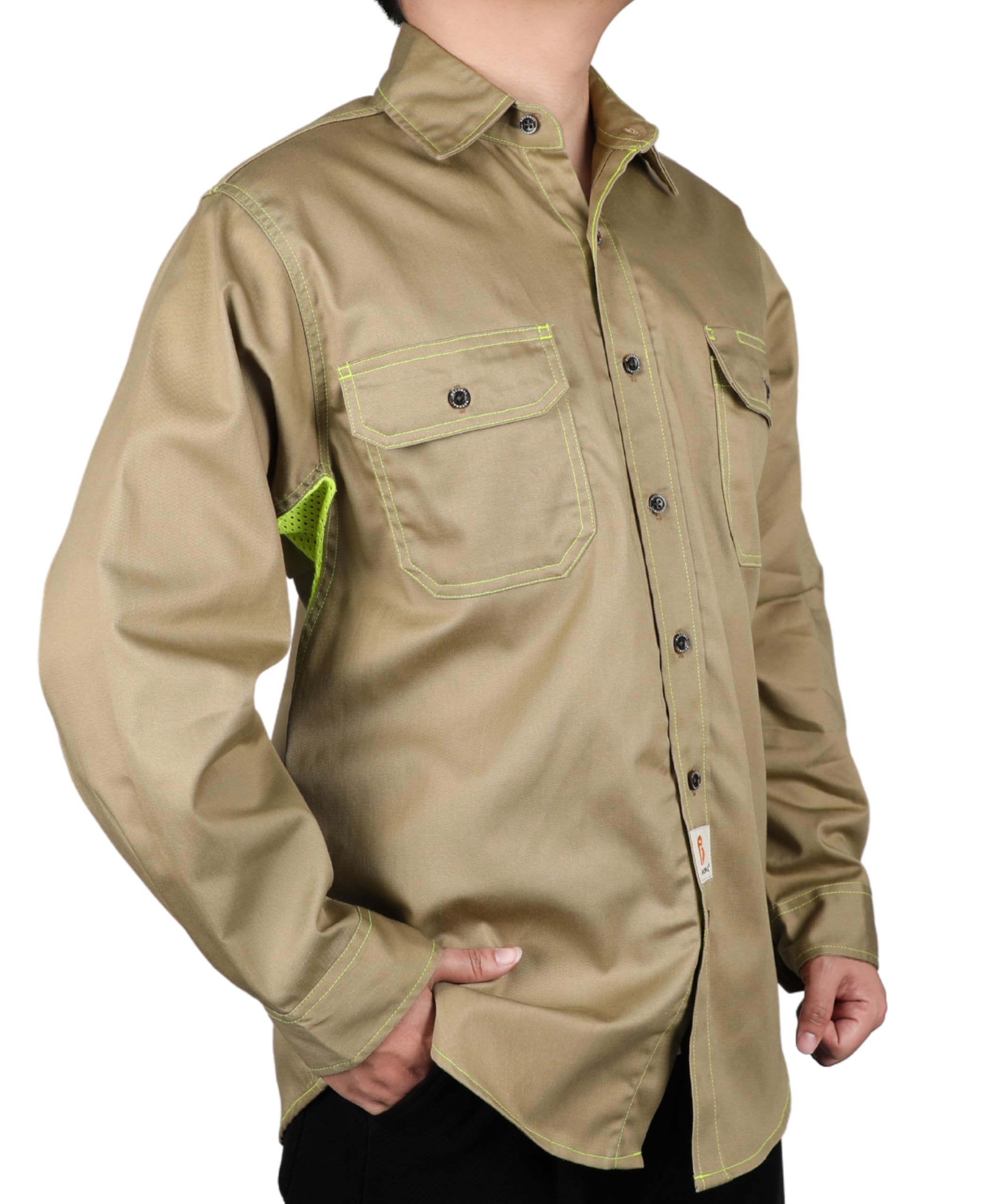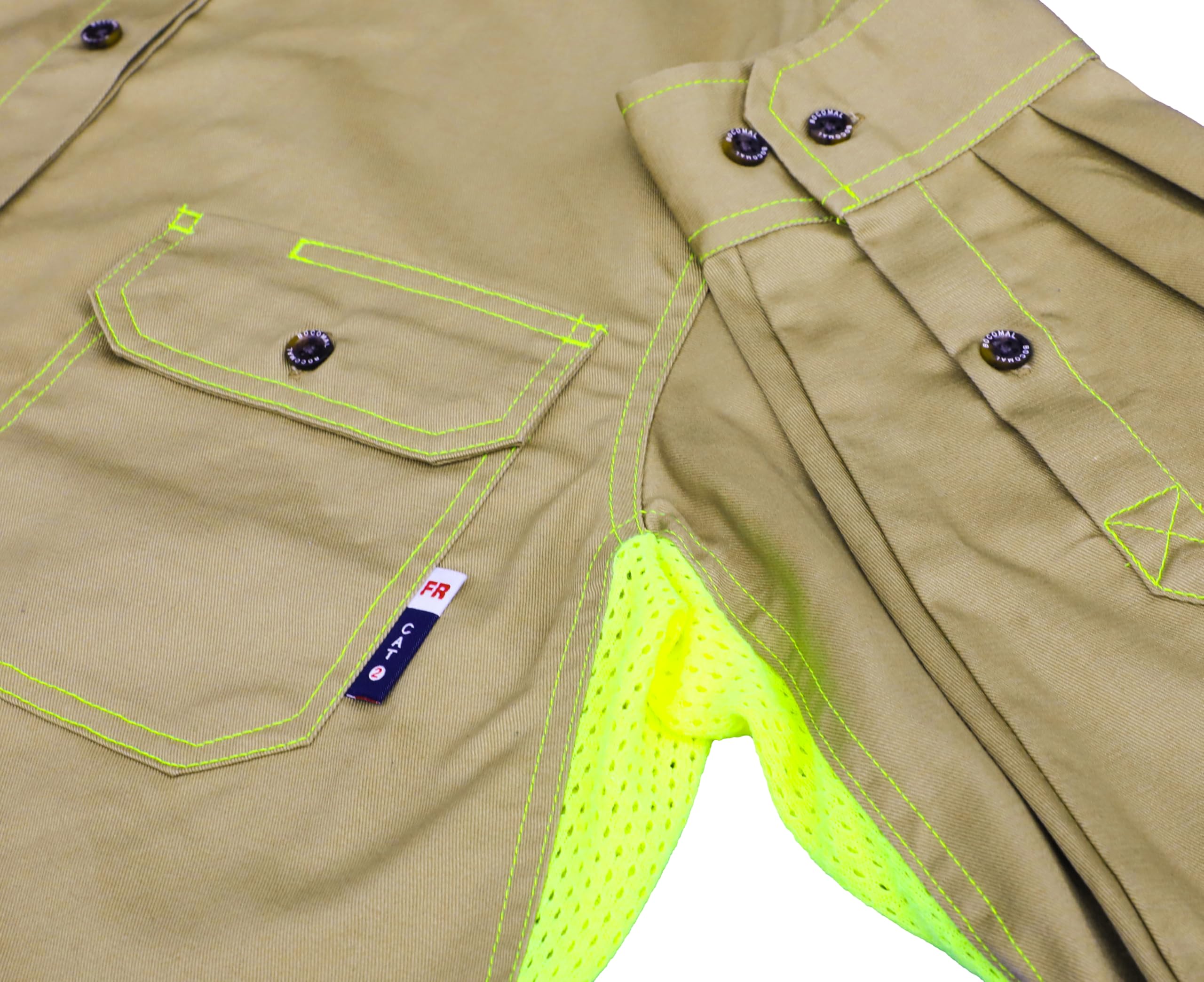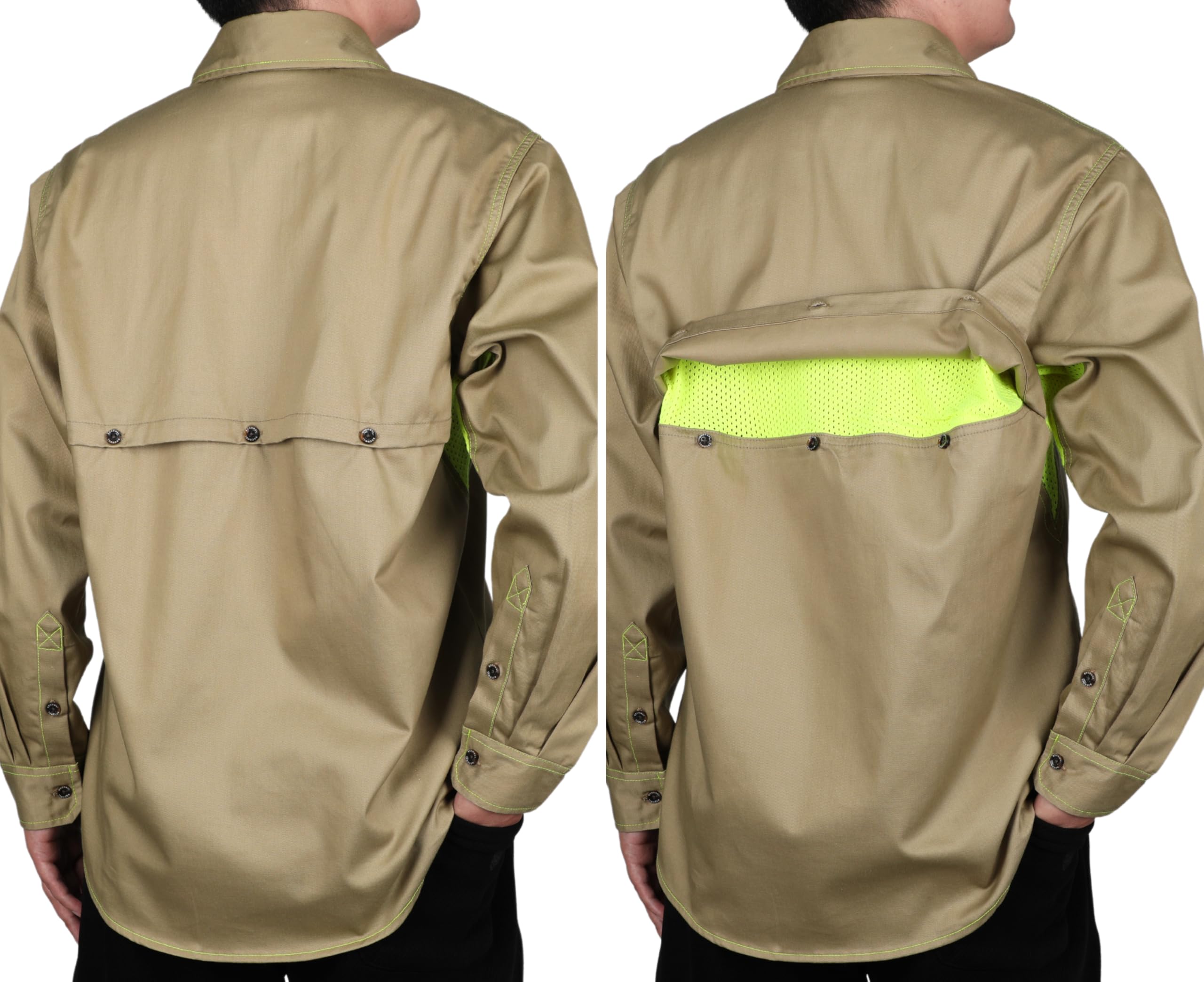 This Men's Flame-Resistant summer work whirt is built for safety and comfort on the job.Designed with breathable Vented mesh panels under the arms and back(button clousure) for better airflow, it keeps you cool during tough tasks in summer hot days.Made from lighgtweight 6.5 oz 100% cotton fabric,Modacrylic/Cotton Blend mesh,it offers reliable flame-resistant protection.The high-visibility yellow contrast mesh and stitching provide added safety in low-light conditions.