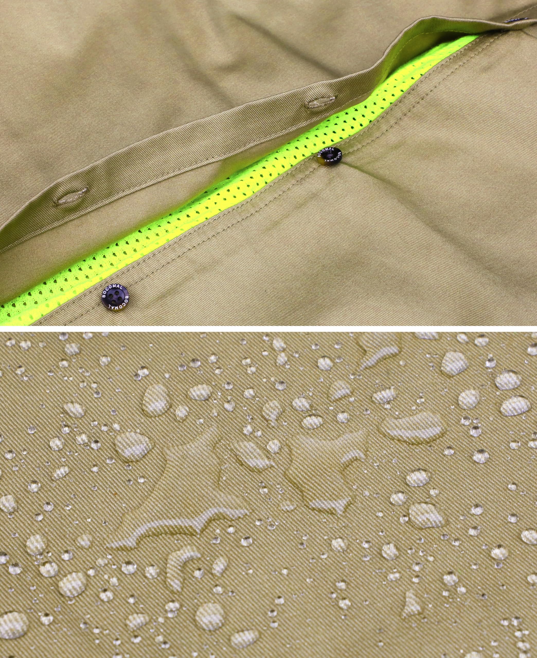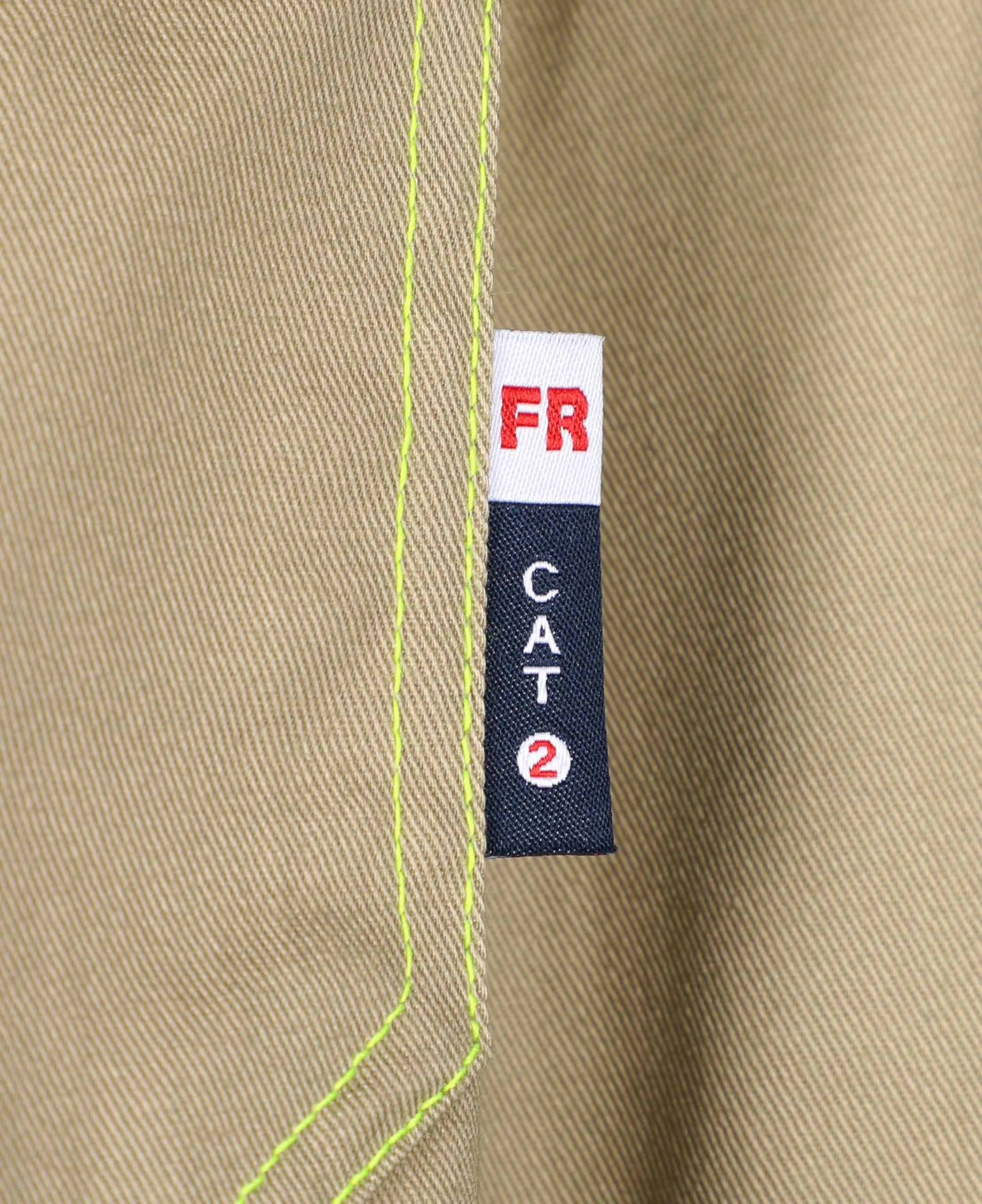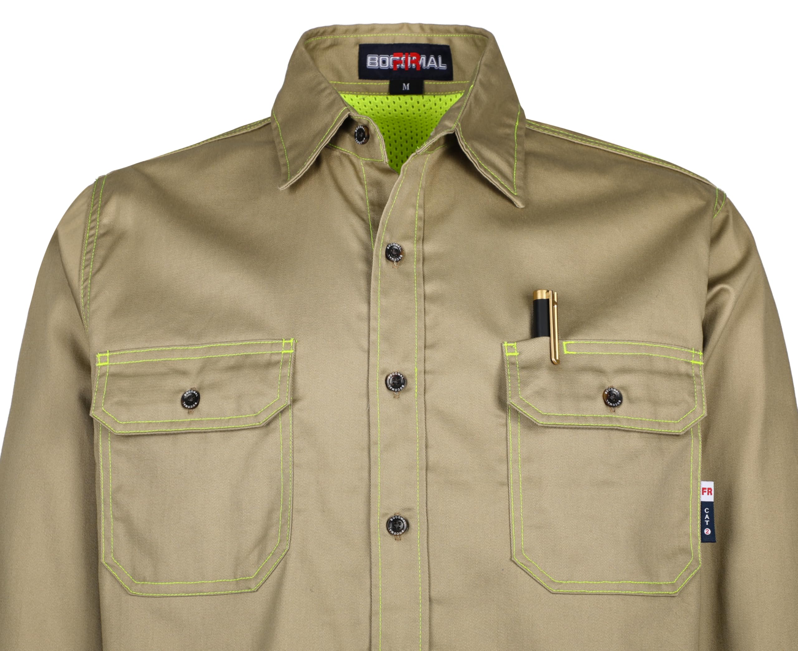 Water and Oil Repellent Finish 6.5oz lightweight cotton twill FR treated,Flame resistant Modacrylic/Cotton Blend mesh.FR buttons,FR aramid sewing threads! clearly FR tag on pocket.Prewashed Preshrunk and Wrinkle-Free.