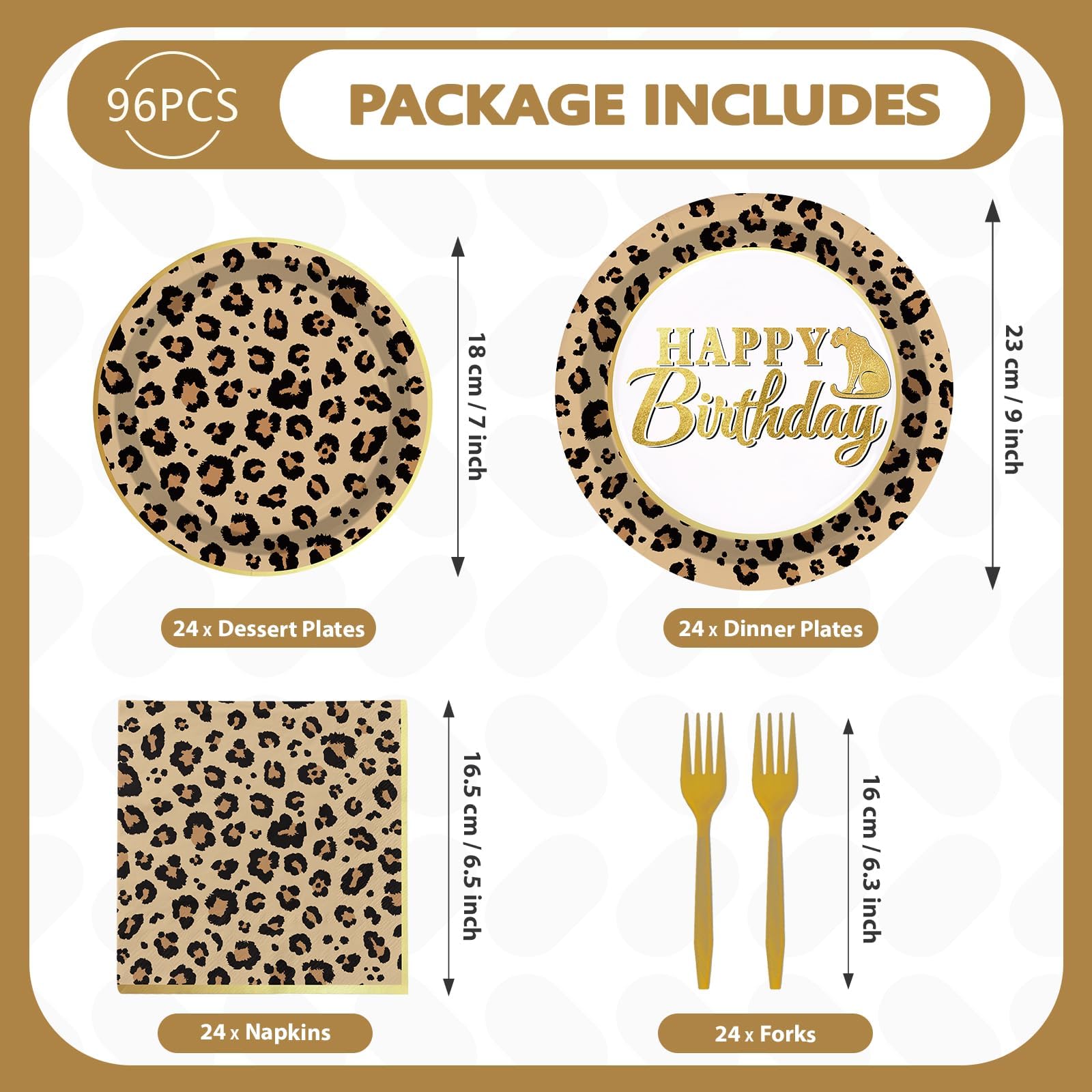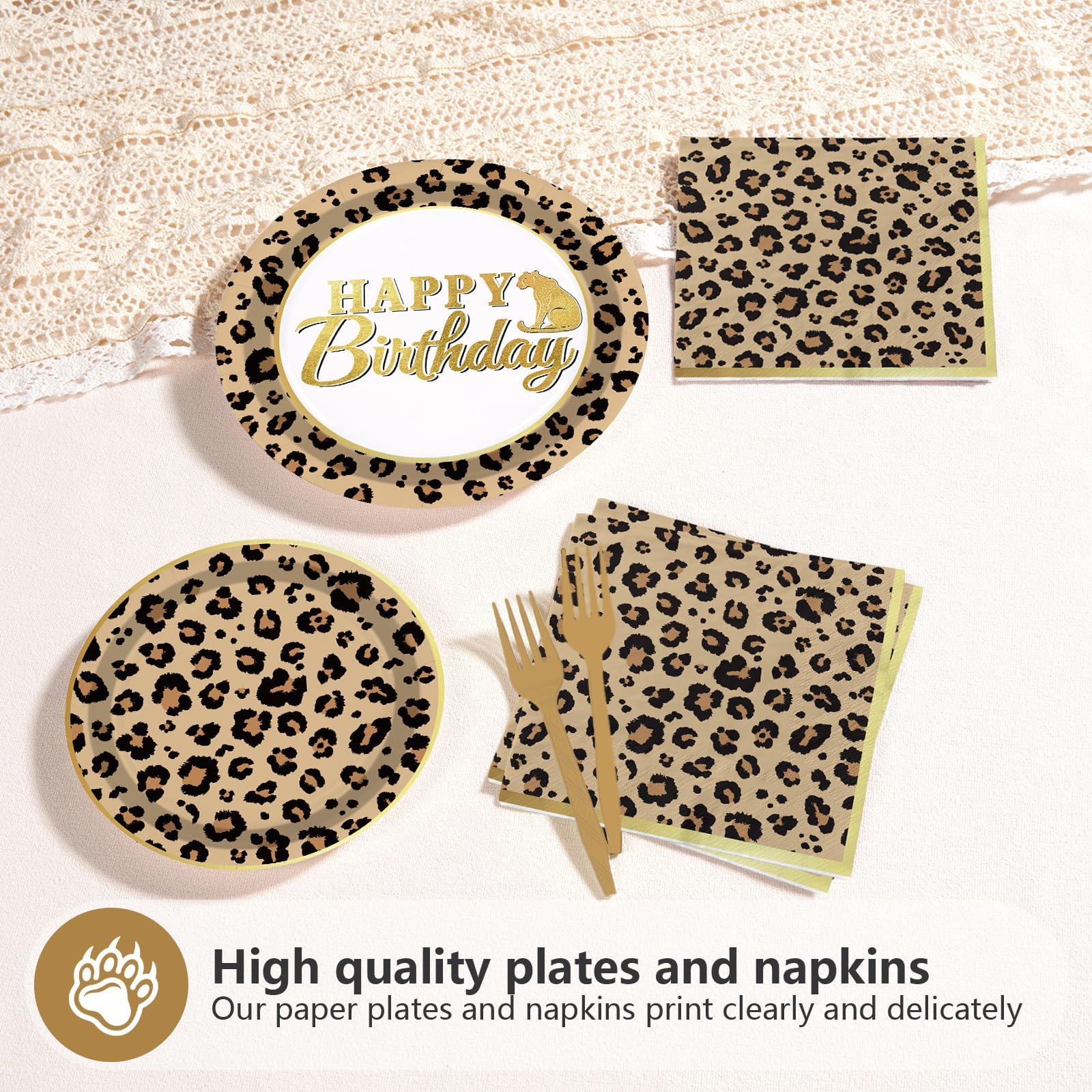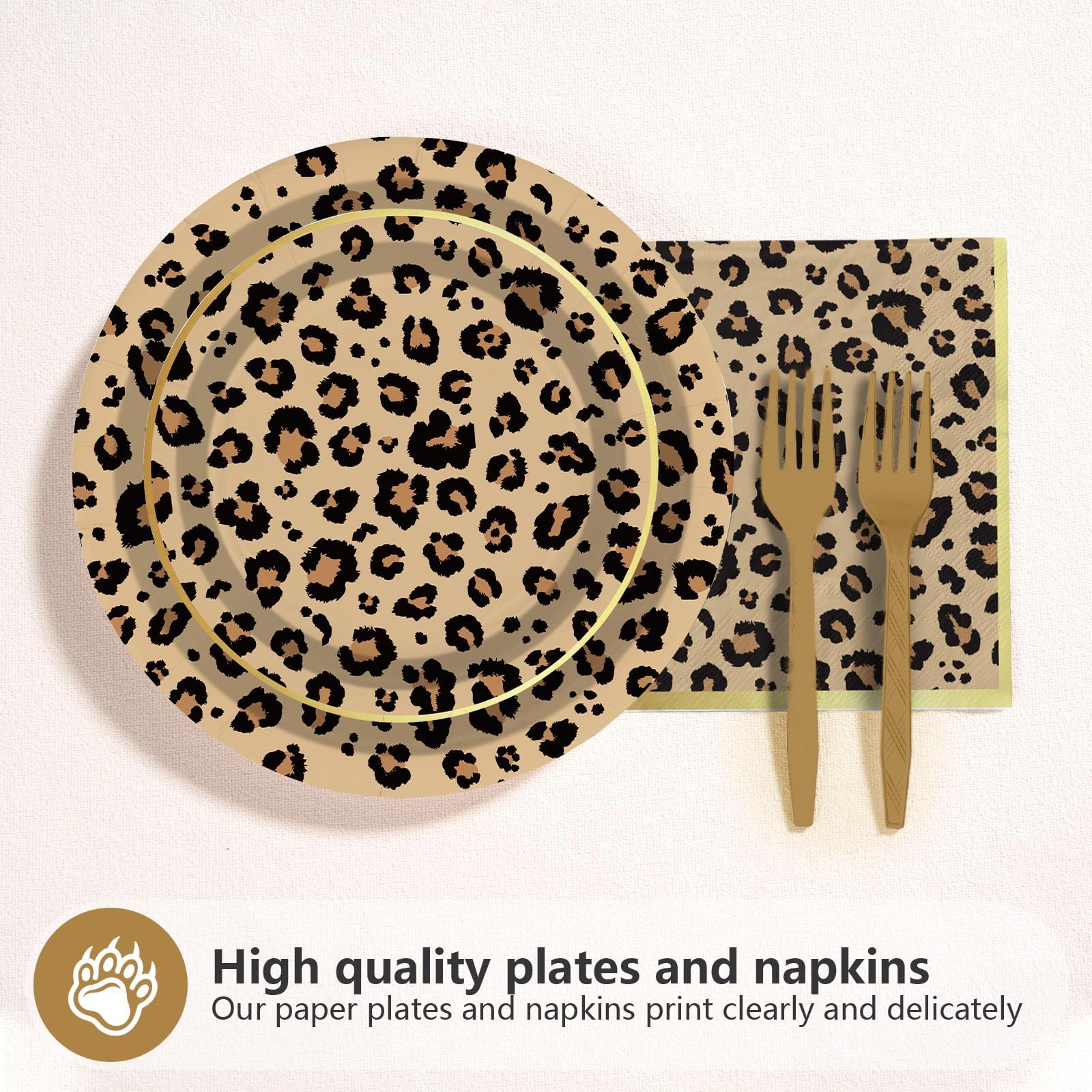 Cheetah Print Party Decorations: You'll get 24pcs animal leopard print party paper dinner plates of 9in, 24pcs animal leopard print dessert plates of 7in, 24pcs animal leopard print party napkins of 6.5in and 24 forks,serving 24 guests. Impress your guests with this gorgeous leopard print party favor set